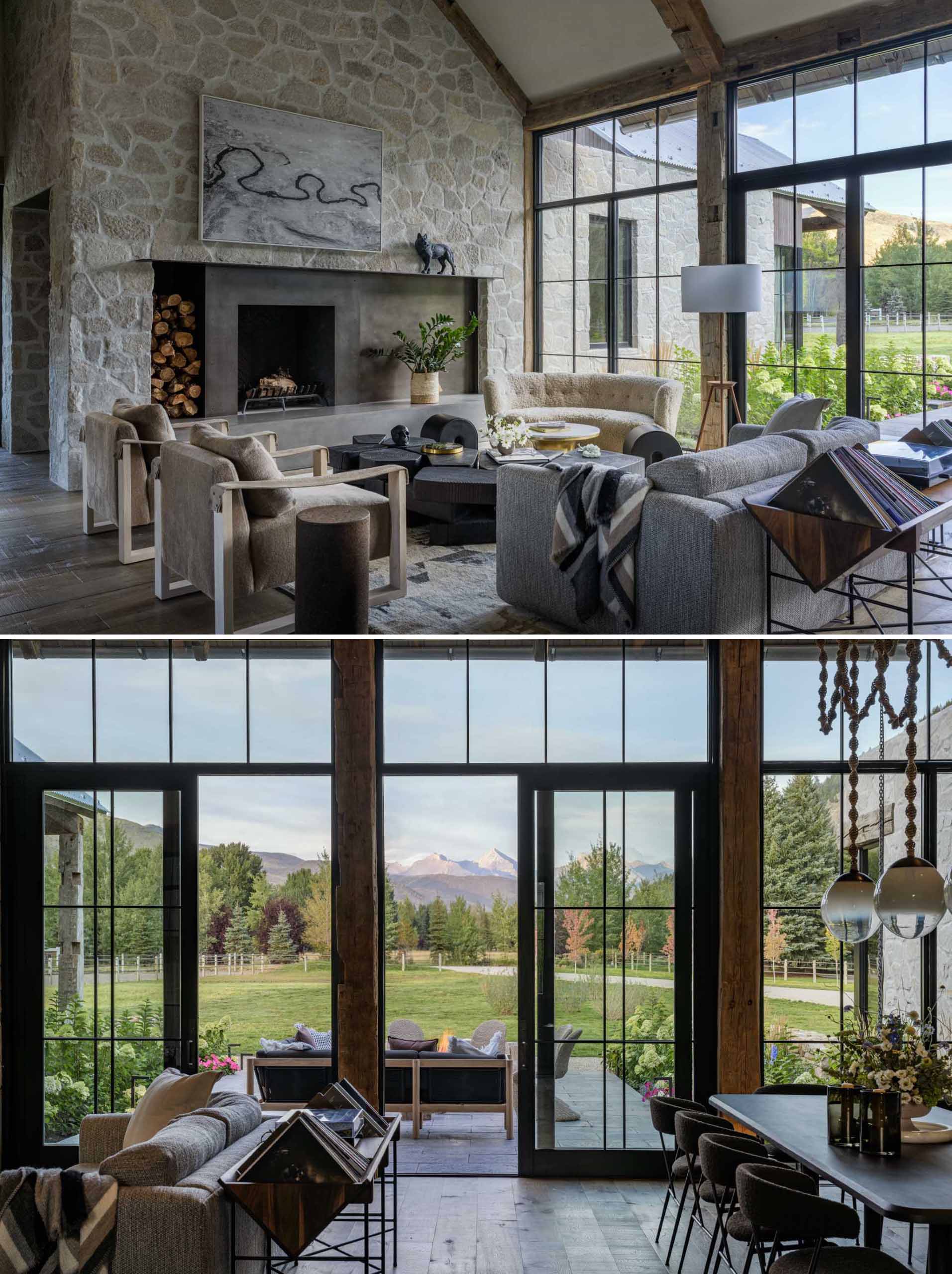 Wewnątrz dominują stalowe drzwi, kamień, antyczne podłogi i ogromne przeszklenia, które zapewniają całoroczne widoki na okoliczne góry. Kamienne ściany od podłogi do sufitu nadają przestrzeni rustykalny, europejski klimat. W strefie dziennej kamień i niestandardowe oświetlenie tworzą estetyczną oprawę dla przejścia między salonem a kuchnią.