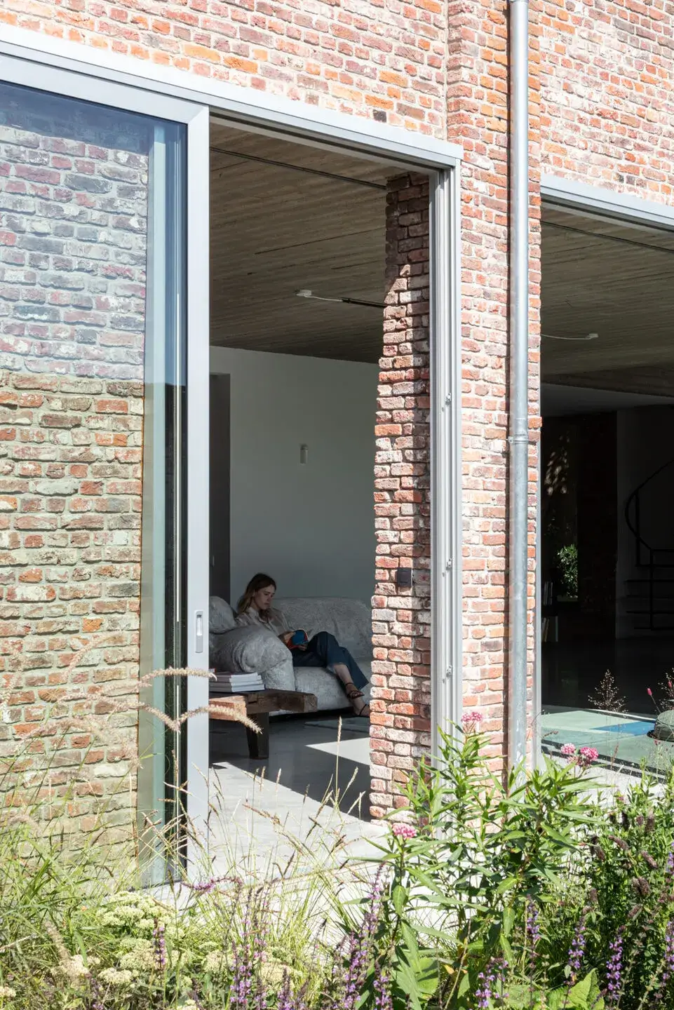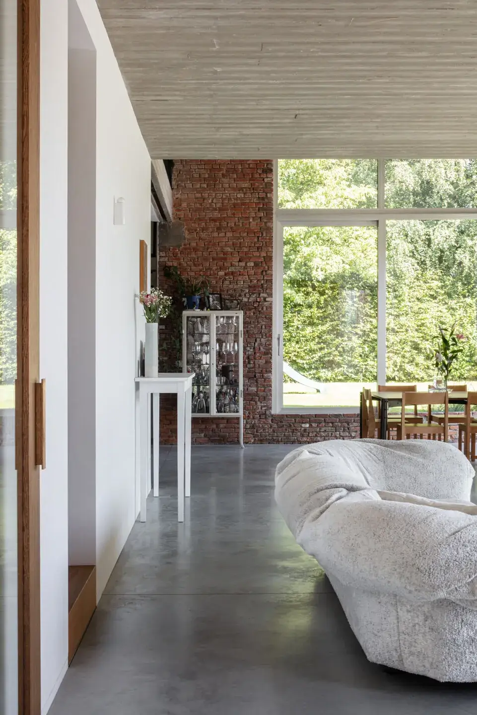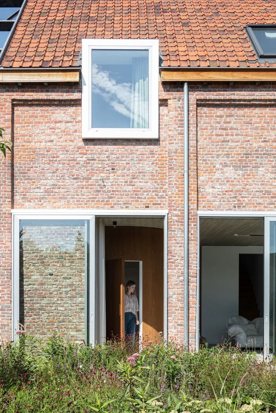Parter obejmuje jasną przestrzeń dzienną z przesuwanymi oknami umieszczonymi pomiędzy filarami istniejącej ceglanej konstrukcji. Jadalnia i kuchnia poprzez przesuwane okna łączą się także z otaczającą zielenią oraz betonowym tarasem. Prostokątną przestrzeń parteru przełamuje się dodając zakrzywioną bryłę sanitarną. Na piętrze wyróżnia się wysokość konstrukcji dachu. Odsłonięte żeliwne kratownice przecinają biuro, sypialnię i łazienkę oraz dwa pokoje dziecięce. Pustka nad jadalnią zapewnia widok z biura na ogród i wnosi światło w głąb domu. Centralna klatka schodowa i spiralna klatka schodowa w nowej ceglanej bryle zapewniają szerokie możliwości komunikacyjne.