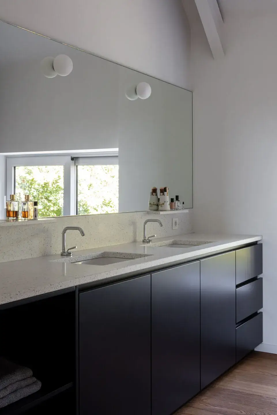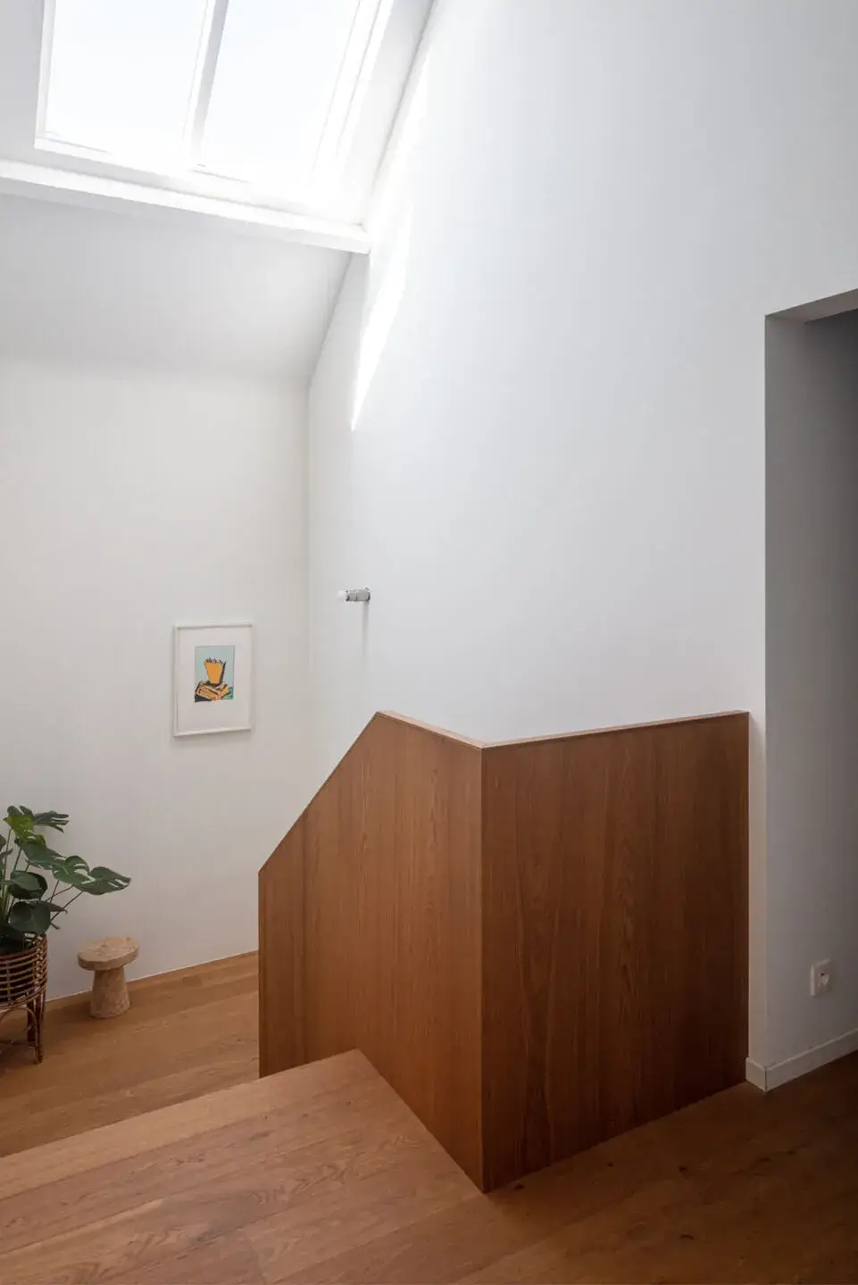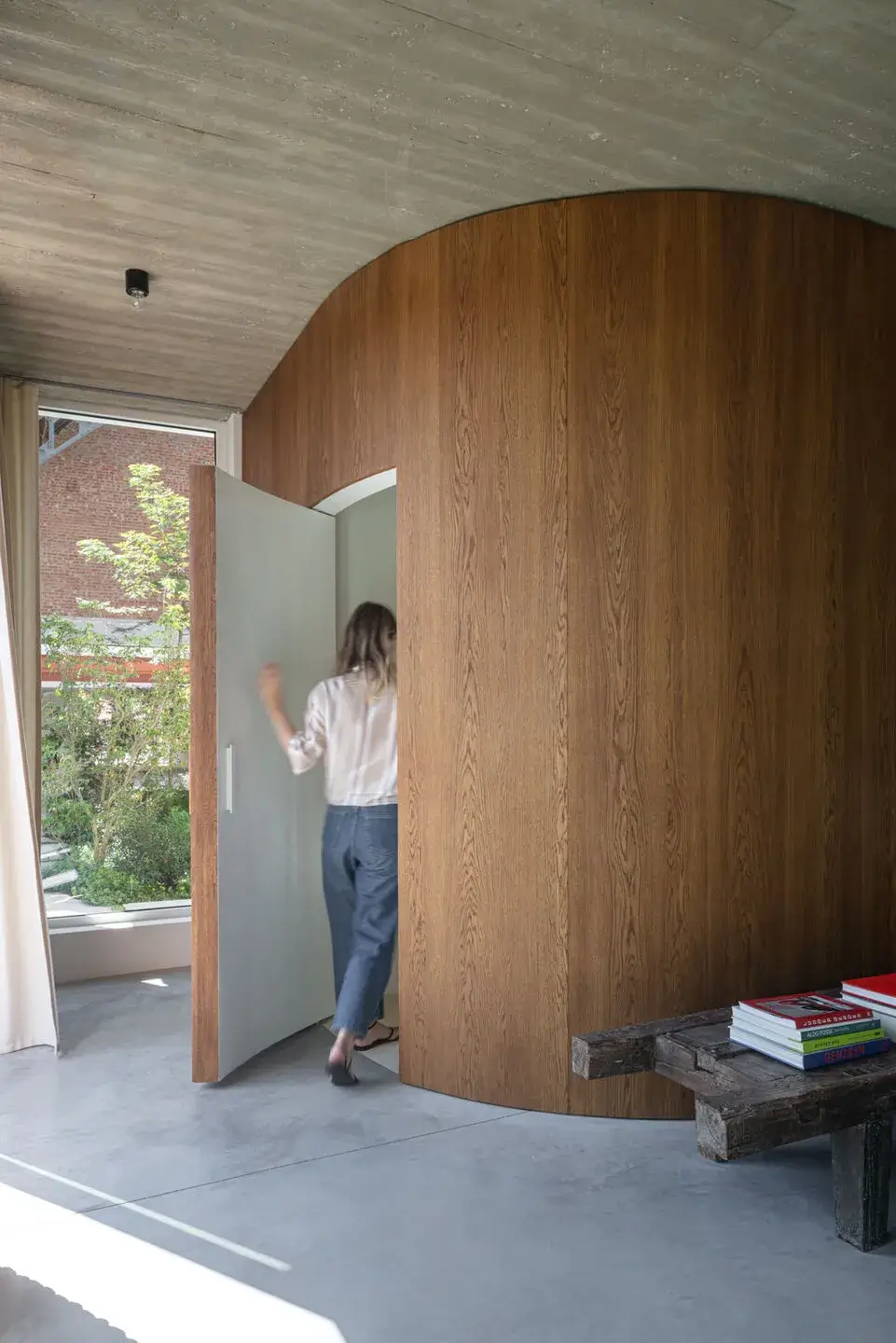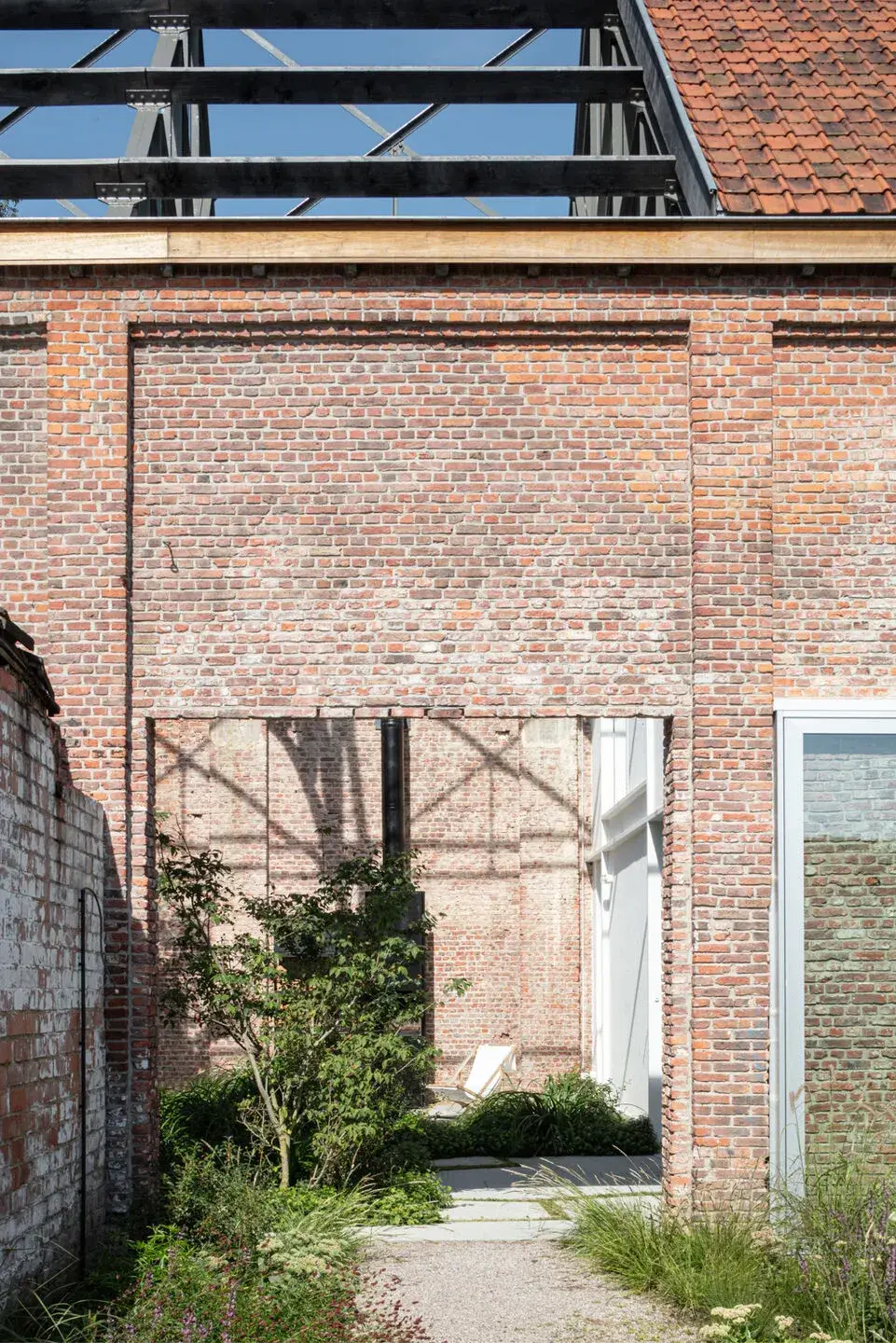 Parter obejmuje jasną przestrzeń dzienną z przesuwanymi oknami umieszczonymi pomiędzy filarami istniejącej ceglanej konstrukcji. Jadalnia i kuchnia poprzez przesuwane okna łączą się także z otaczającą zielenią oraz betonowym tarasem. Prostokątną przestrzeń parteru przełamuje się dodając zakrzywioną bryłę sanitarną. Na piętrze wyróżnia się wysokość konstrukcji dachu. Odsłonięte żeliwne kratownice przecinają biuro, sypialnię i łazienkę oraz dwa pokoje dziecięce. Pustka nad jadalnią zapewnia widok z biura na ogród i wnosi światło w głąb domu. Centralna klatka schodowa i spiralna klatka schodowa w nowej ceglanej bryle zapewniają szerokie możliwości komunikacyjne.