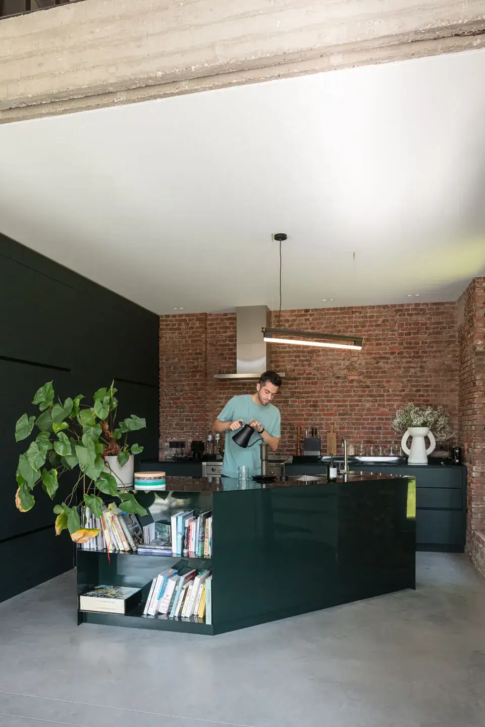 Dom charakteryzuje się istniejącymi ceglanymi ścianami i filarami, które otaczają nowe okna z anodyzowanego aluminium. Polerowane betonowe podłogi i odsłonięte betonowe sufity łączą się z ciepłym, bogatym drewnem bloku sanitarnego i schodów na półpiętrze. Kuchnię wykonano z zielonej emalii, a piec ze stali nierdzewnej. Nadaje to industrialny charakter, wraz z gołą stalą kręconych schodów i parapetu na antresoli. Wreszcie płytki w kolorze niebieskim i zielonym oraz sporadyczne akcenty kolorystyczne w kolorze różowym nadają całości zabawny charakter.