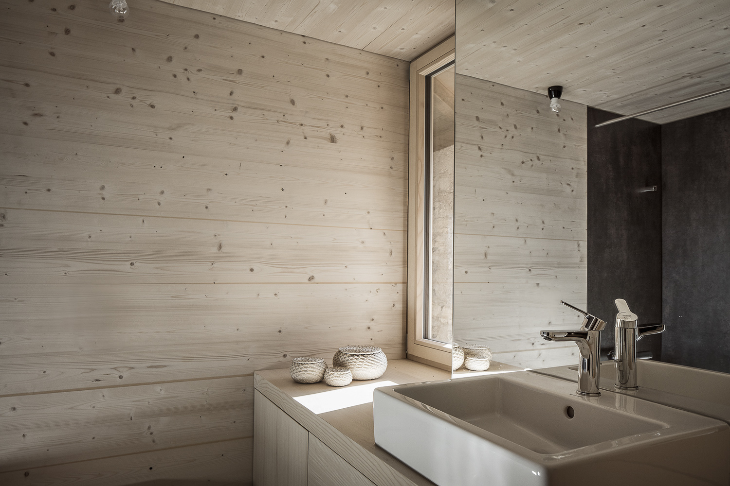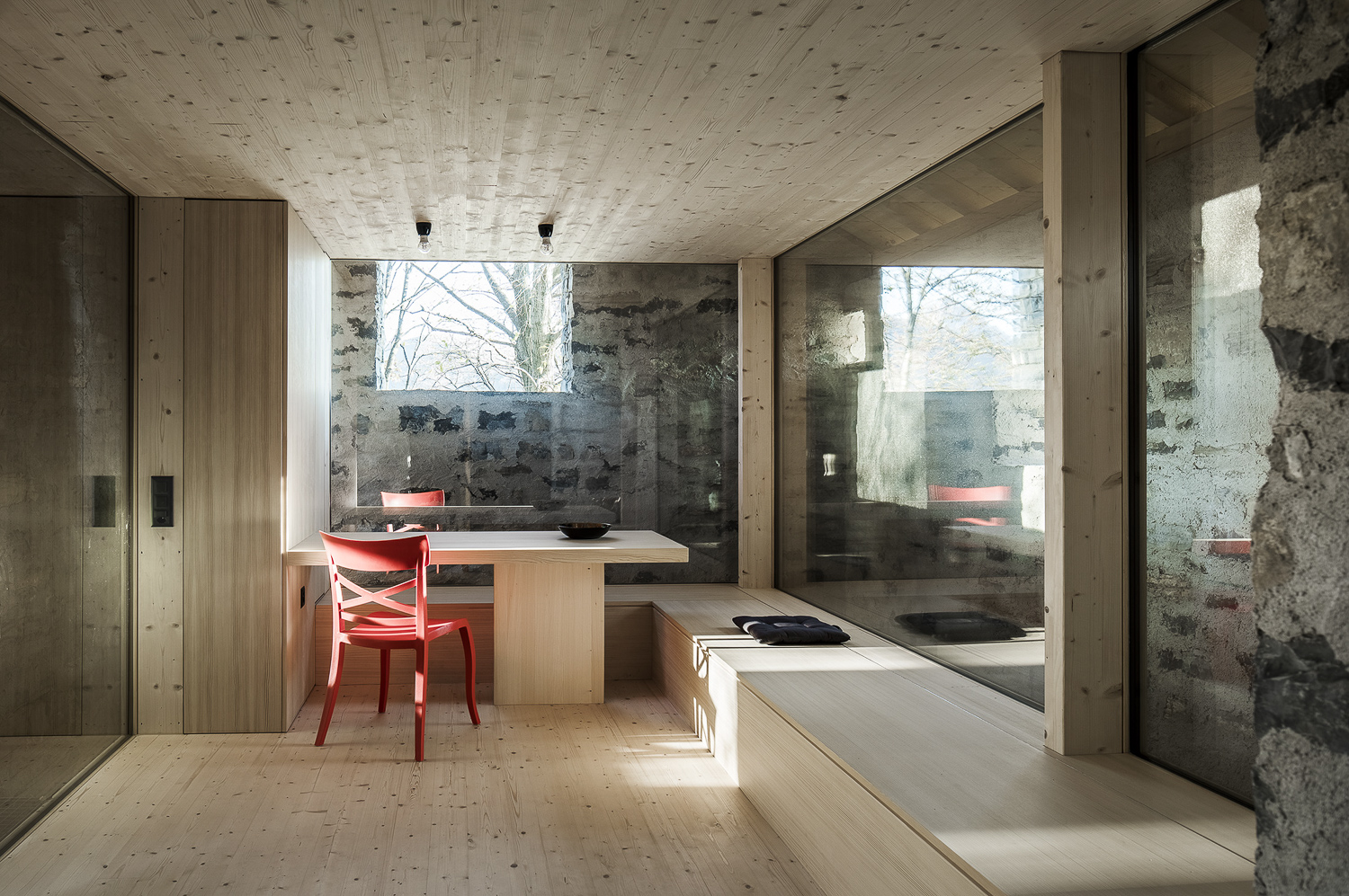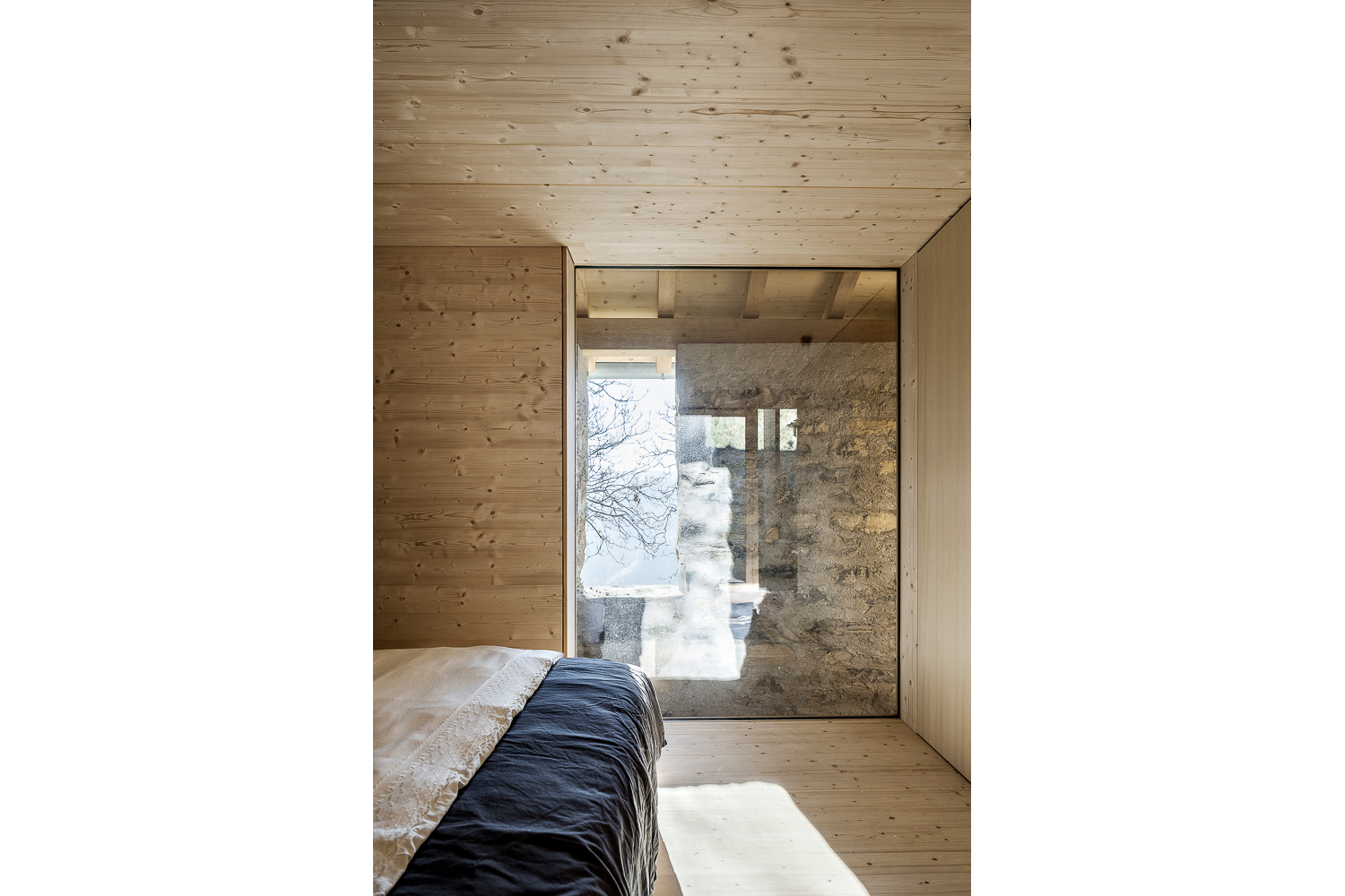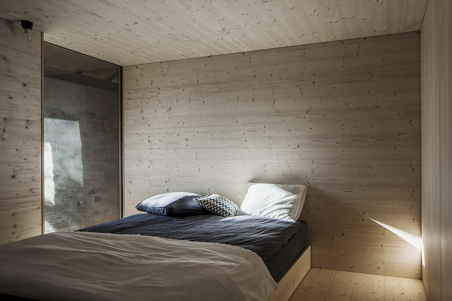Zamiast przebudowy i uszczelniania starych ścian, wewnątrz istniejących struktur wstawiono drewnianą skrzynię mieszkalną. Główne mieszkanie zlokalizowano w północno-zachodniej części kompleksu – w jego wnętrzu znajdują się dwie sypialnie, łazienka na piętrze oraz przeszklona strefa dzienna z kuchnią i salonem na parterze. Otwarta forma i widok na połacie dachowe zapewniają doskonałe doświetlenie wnętrza, szczególnie od strony północno-wschodniej.