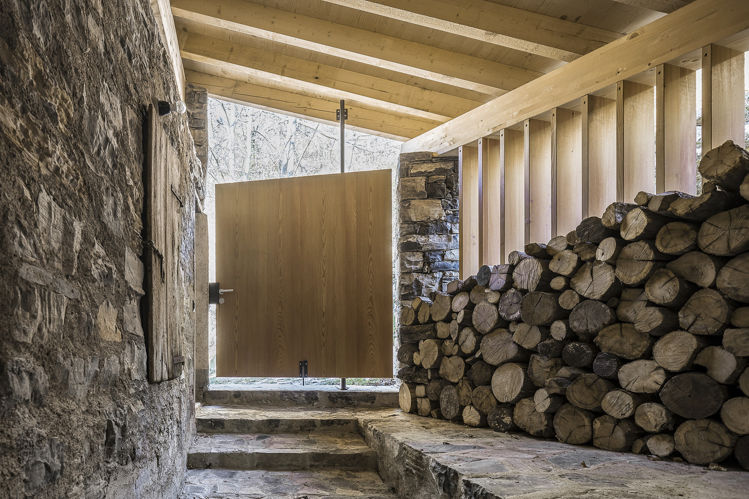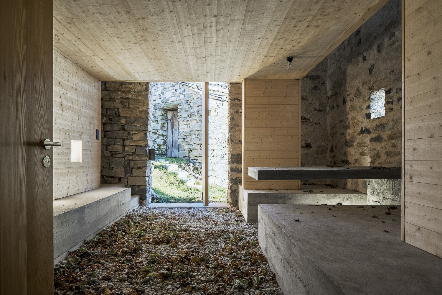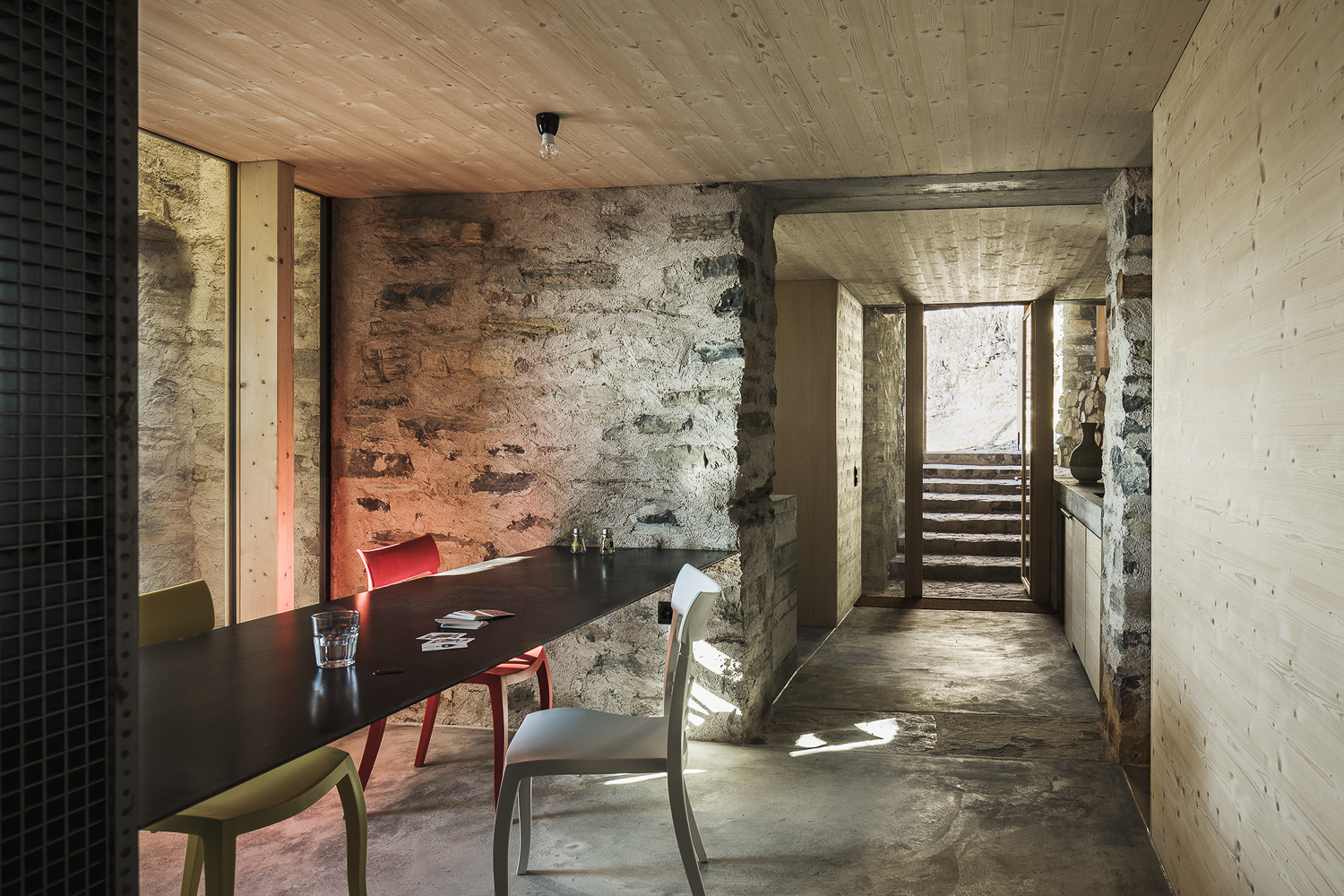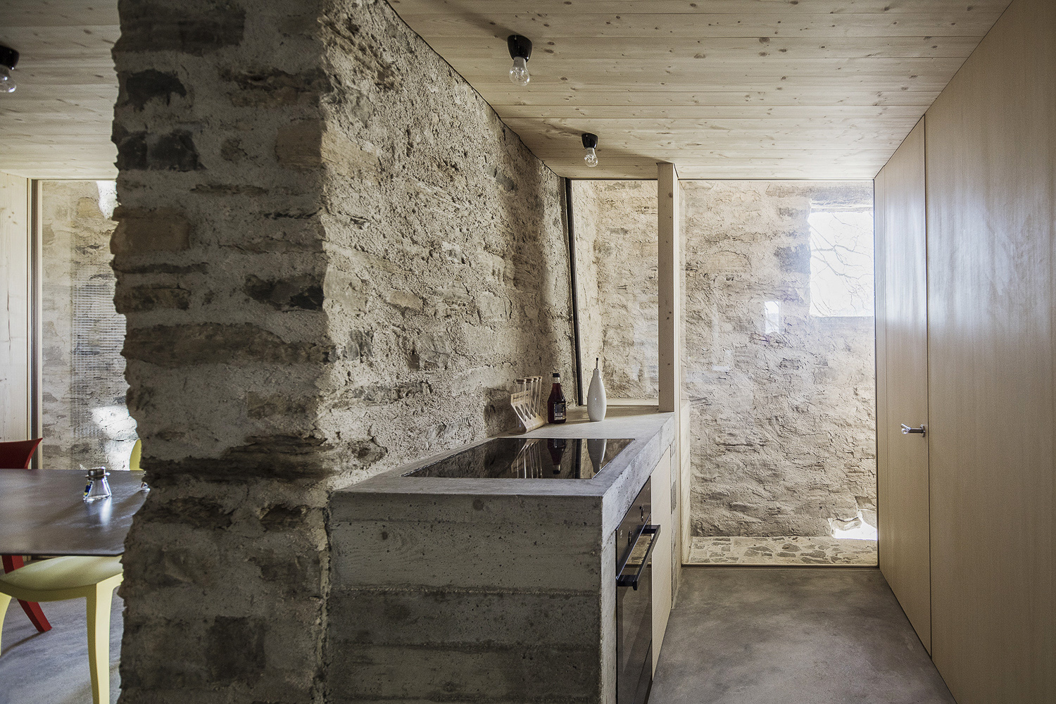 Zamiast przebudowy i uszczelniania starych ścian, wewnątrz istniejących struktur wstawiono drewnianą skrzynię mieszkalną. Główne mieszkanie zlokalizowano w północno-zachodniej części kompleksu – w jego wnętrzu znajdują się dwie sypialnie, łazienka na piętrze oraz przeszklona strefa dzienna z kuchnią i salonem na parterze. Otwarta forma i widok na połacie dachowe zapewniają doskonałe doświetlenie wnętrza, szczególnie od strony północno-wschodniej.