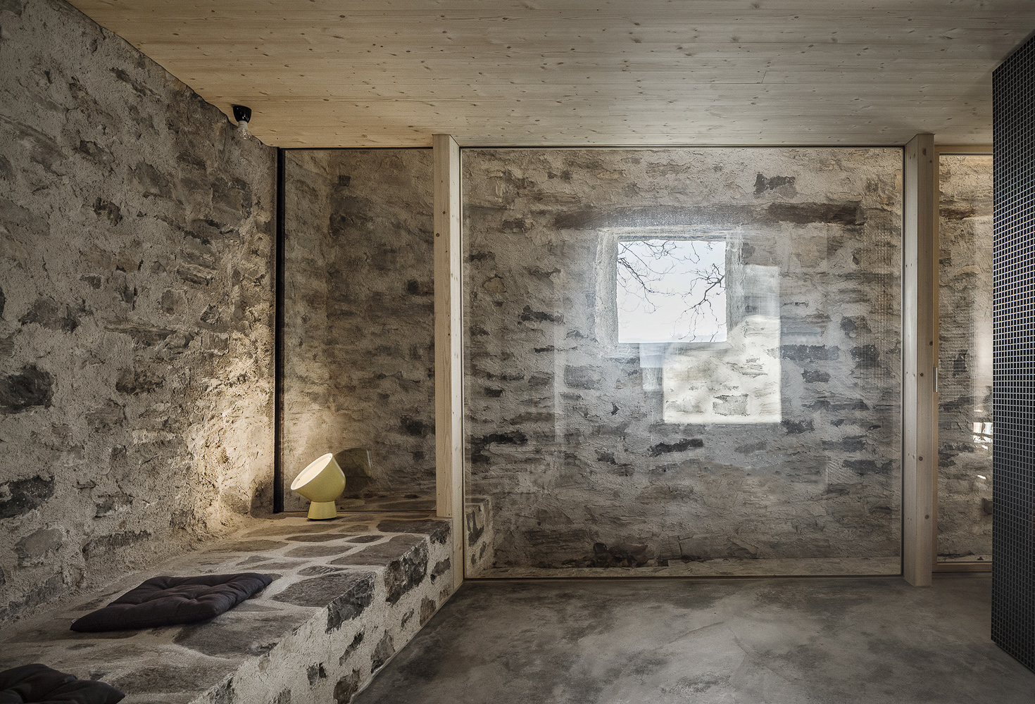 Wykorzystanie drewna jako głównego materiału konstrukcyjnego części ogrzewanej pozwala na szybkie nagrzewanie przestrzeni, co czyni projekt idealnym jako sezonowy dom wakacyjny. Przez przeszklone ściany użytkownicy mogą podziwiać fakturę i urok naturalnego kamienia – bez potrzeby jego zakrywania czy ocieplania, co byłoby konieczne w klasycznym rozwiązaniu.