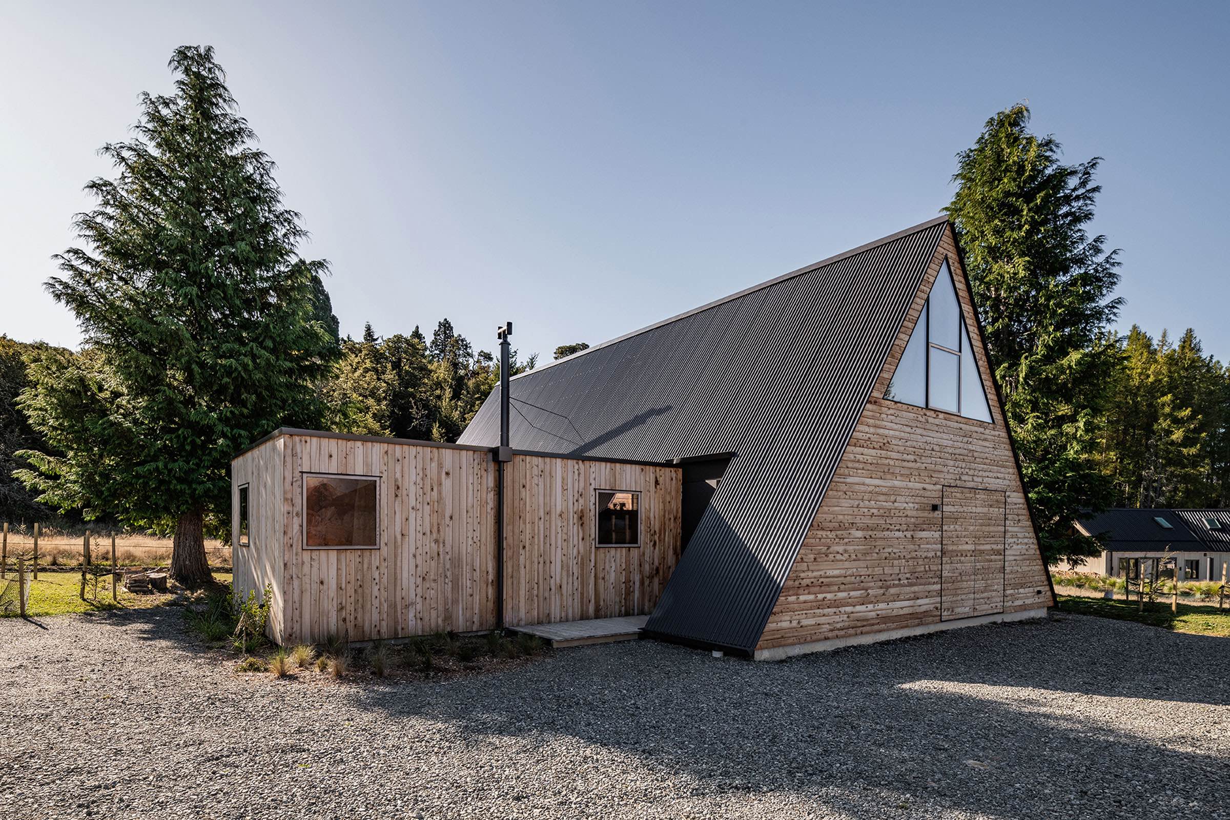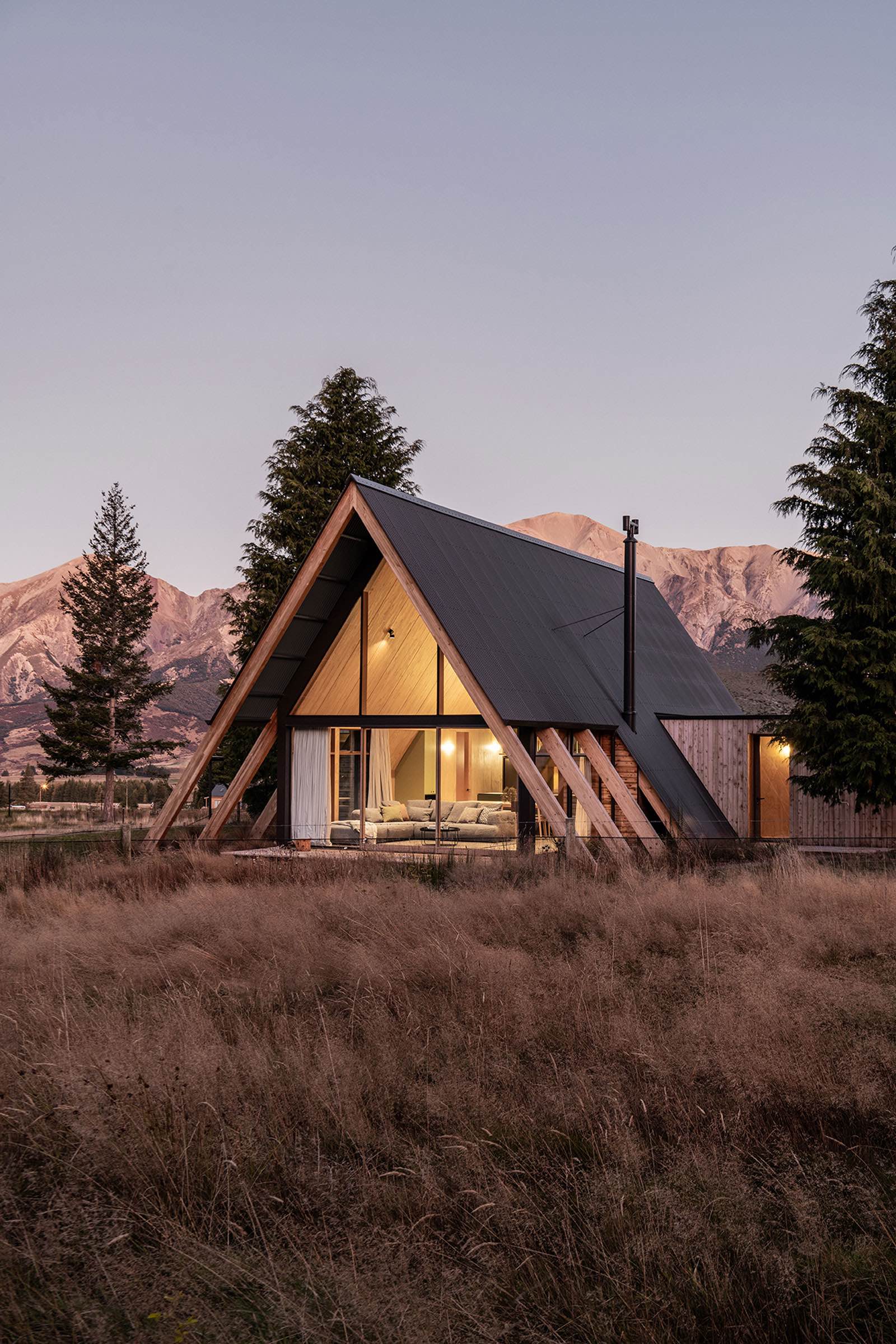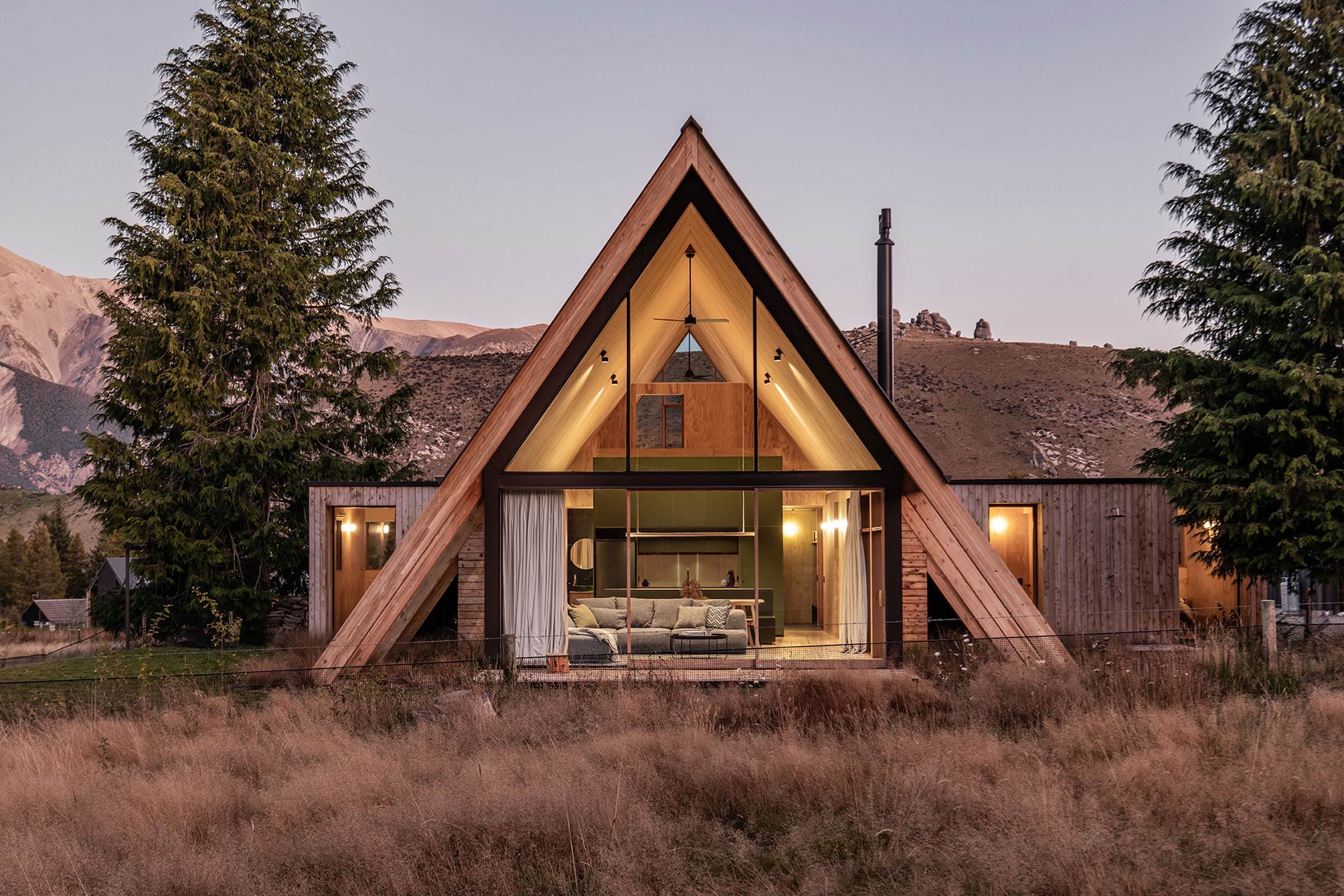 Położony w malowniczej miejscowości Castle Hill Village na Wyspie Południowej Nowej Zelandii, dom Adventure Whare autorstwa Studio Well to współczesna reinterpretacja tradycyjnej formy A-frame. Jego mocno pochylony dach i wyrazista sylweta tworzą architekturę, która łączy funkcjonalność górskiego schronienia z estetyką nowoczesnej prostoty.