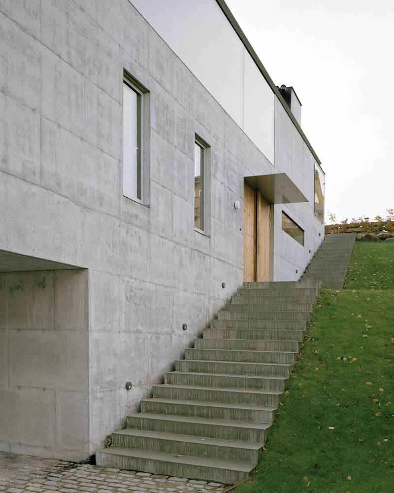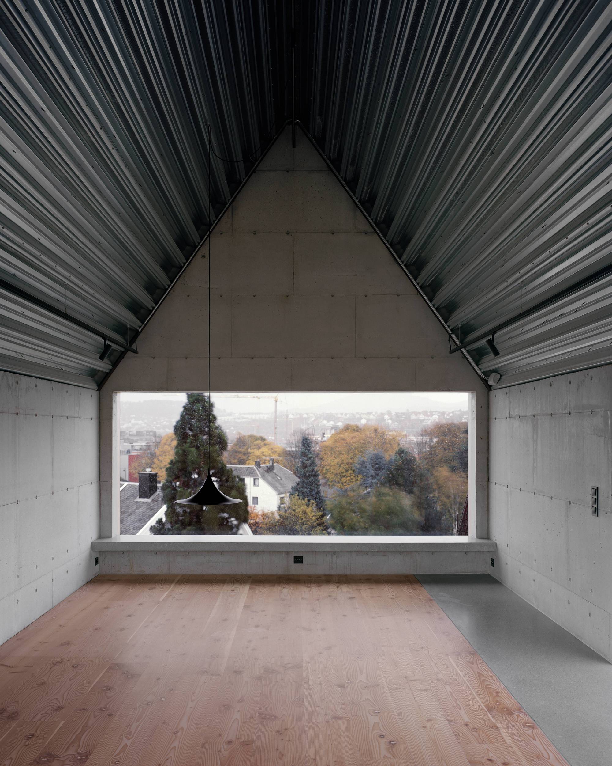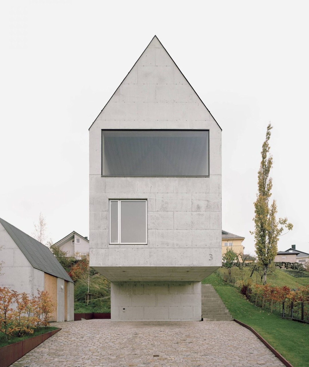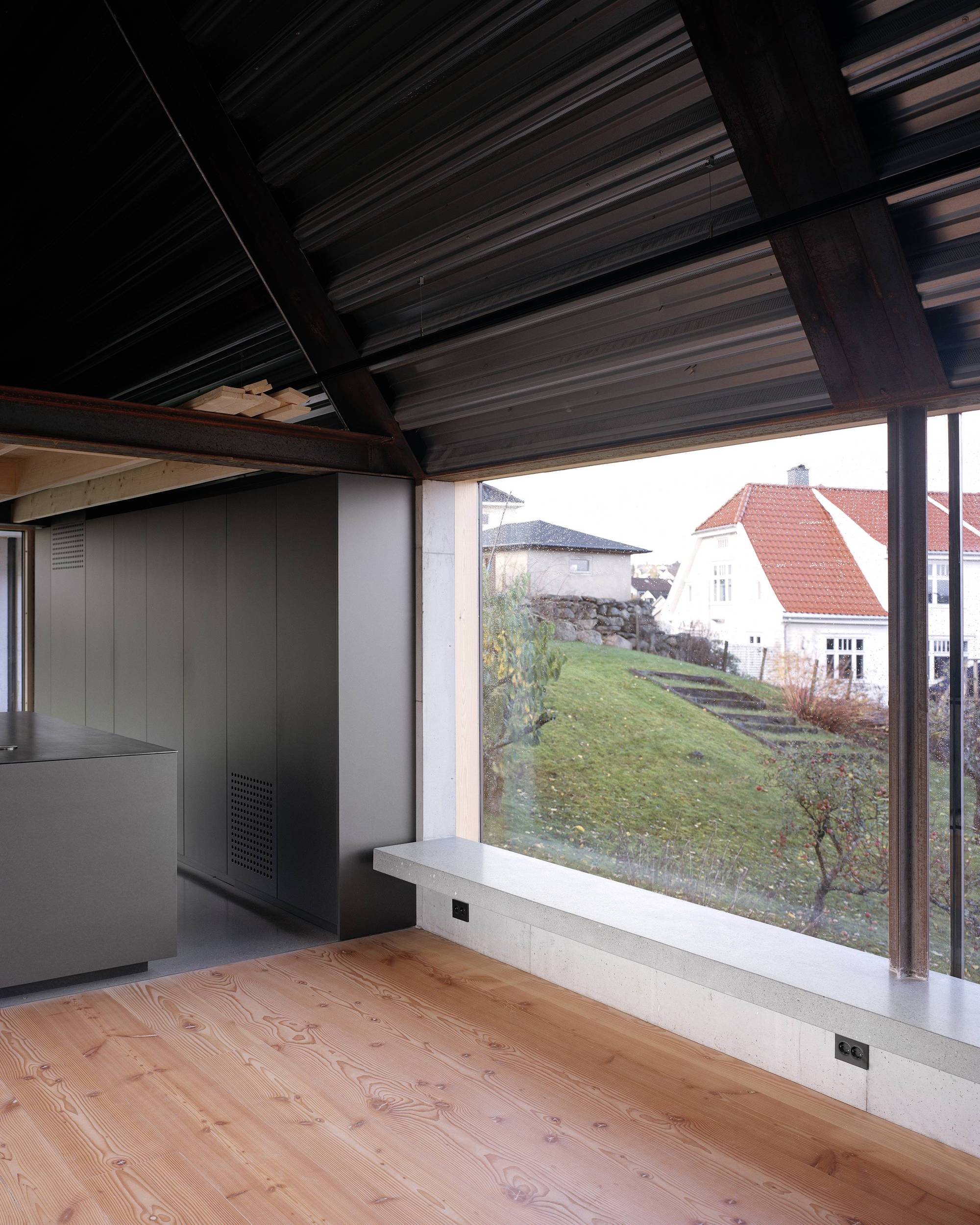 Aby optymalnie wykorzystać morski klimat i nasłonecznienie wieczorne, architekci zaprojektowali dom w układzie trzypoziomowym. Główne strefy mieszkalne (kuchnia, salon, jadalnia) znajdują się na najwyższym piętrze, które jest zrównane z najwyższym punktem działki od strony zachodniej. Z kuchni można bezpośrednio wyjść do górnego ogrodu – strefa ta została cofnięta, aby zapewnić zadaszenie i ochronę przed deszczem, typowym dla klimatu Norwegii.
