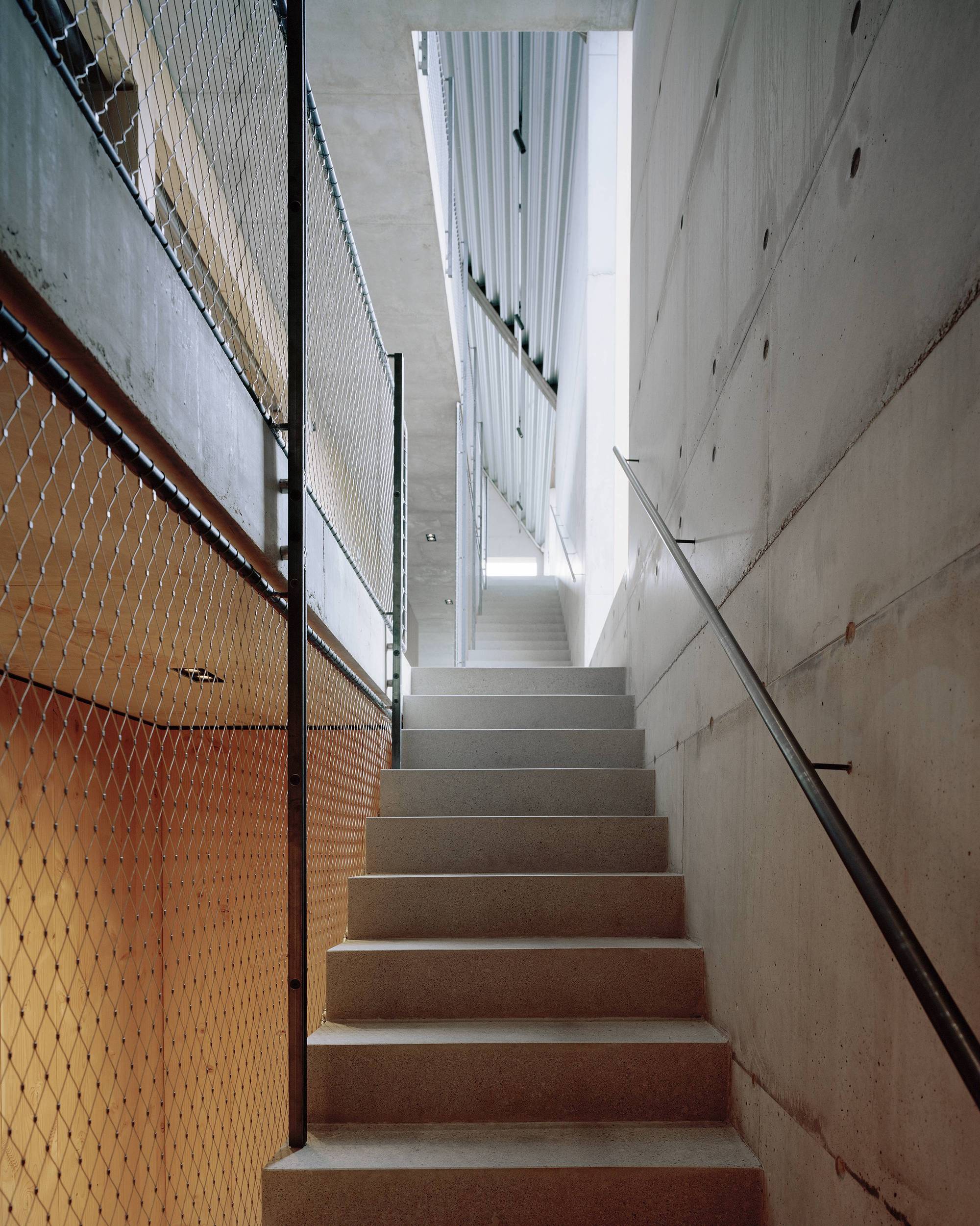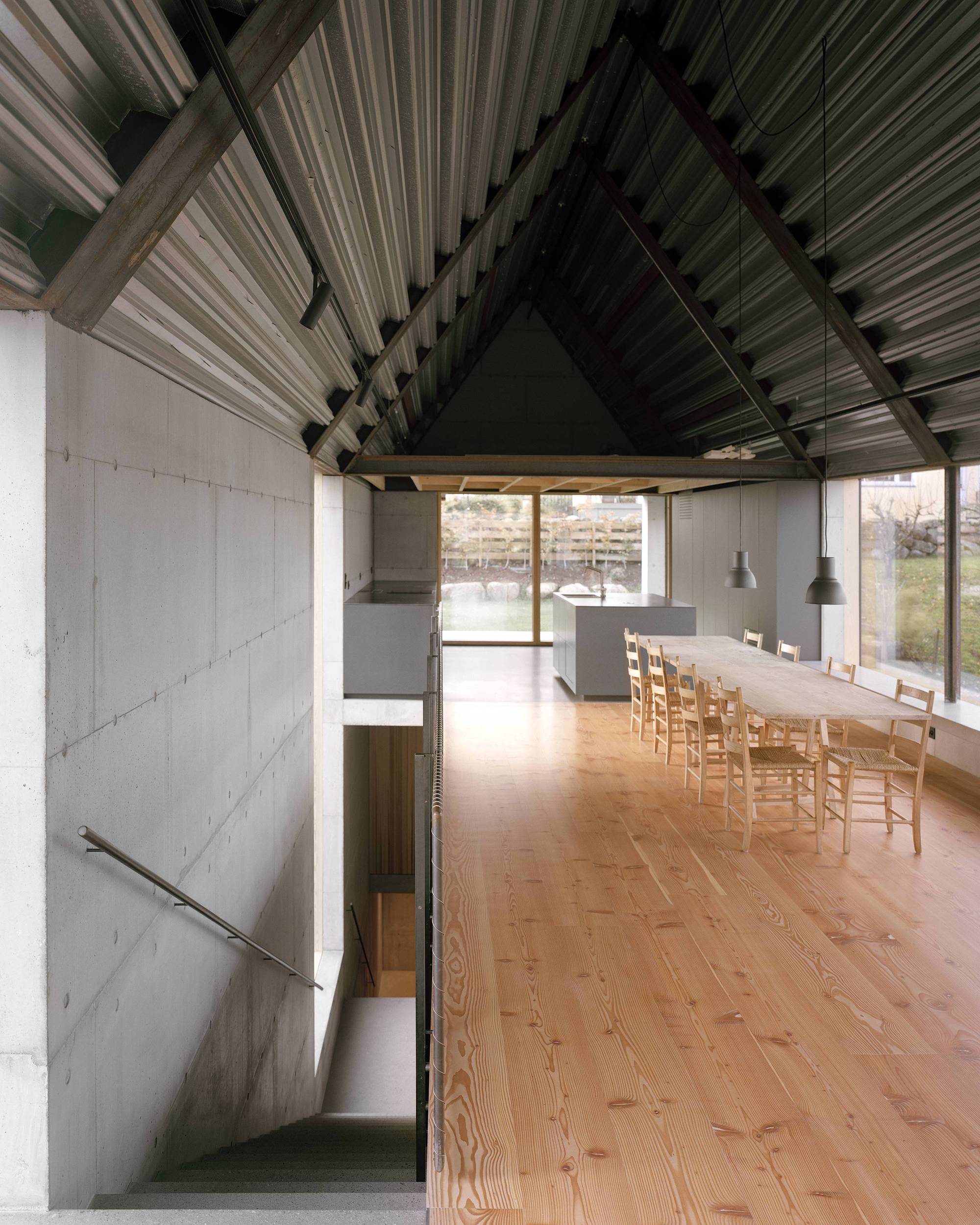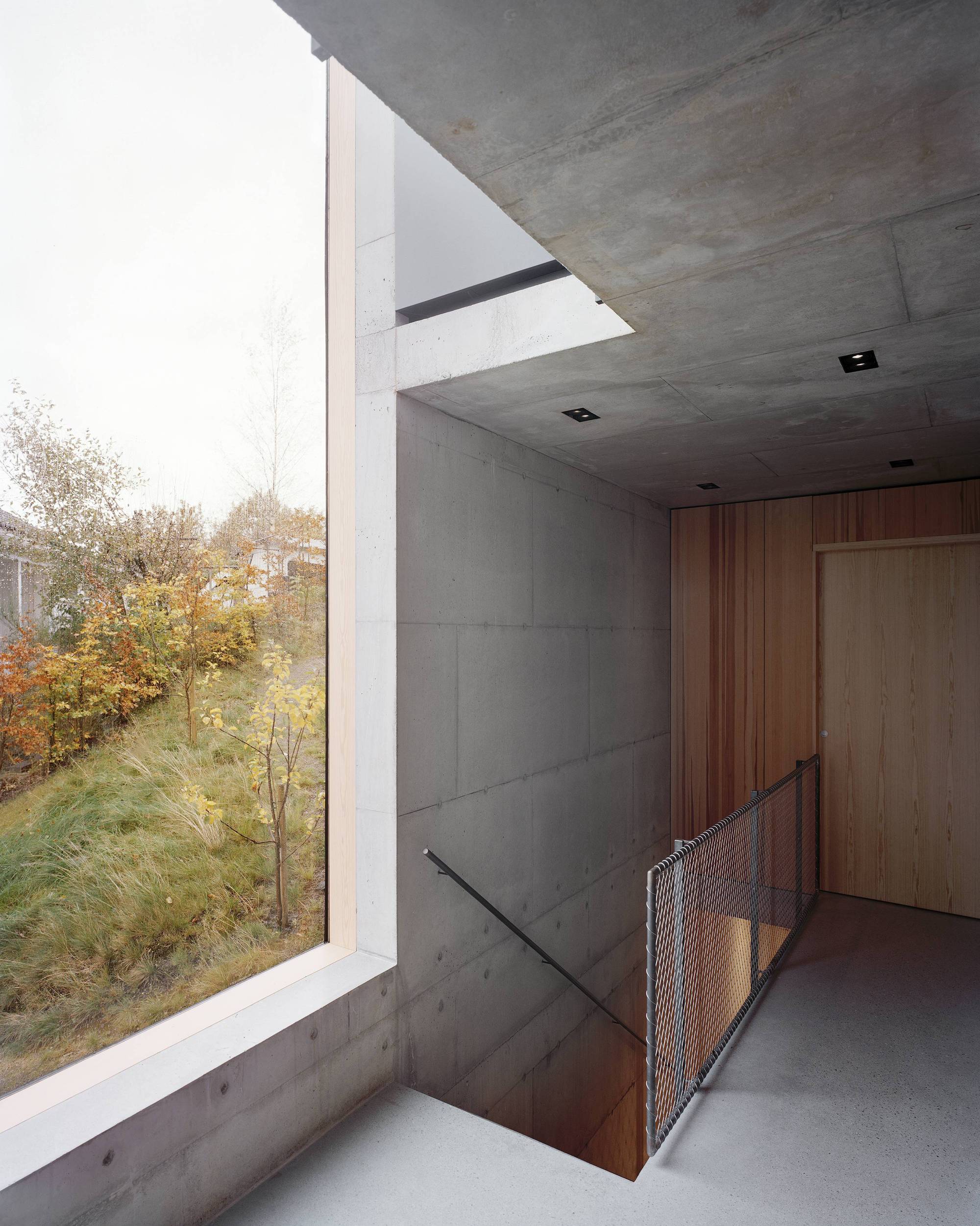 W domu dominuje minimalistyczna estetyka, naturalne materiały i surowe wykończenia. Woda deszczowa odprowadzana jest do oczka wodnego, tworząc element krajobrazowy. Nad kuchnią znajduje się antresola z drewnianą podłogą, pełniąca funkcję kącika do pracy lub nauki. Wszystkie nieotwierane okna są osadzone bezpośrednio w betonie, a prostokątne przeszklenia posiadają szerokie, betonowe parapety, które służą również jako miejsce do siedzenia.