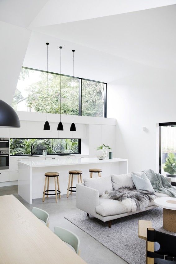 Założeniem projektu była zmiana konfiguracji istniejącego już domu, aby podkreślić znaczenie kuchni. Klient chciał, by architekci stworzyli długą i funkcjonalną przestrzeń kuchni dla czteroosobowej rodziny, w której będzie miejsce nie tylko na jedzenie, ale też wspólne spędzanie czasu. Problemem i sporym wyzwaniem było też kiepskie doświetlenie wnętrza oraz nienajlepsza wentylacja. Aby zachować pierwotny kształt domu, stworzono przybudówkę, która połączona jest z główną bryłą budynku tylko niewielką częścią. To połączenie tworzy dwa wewnętrzne dziedzińce, z których wpada światło słoneczne do sypialni i gabinetu.