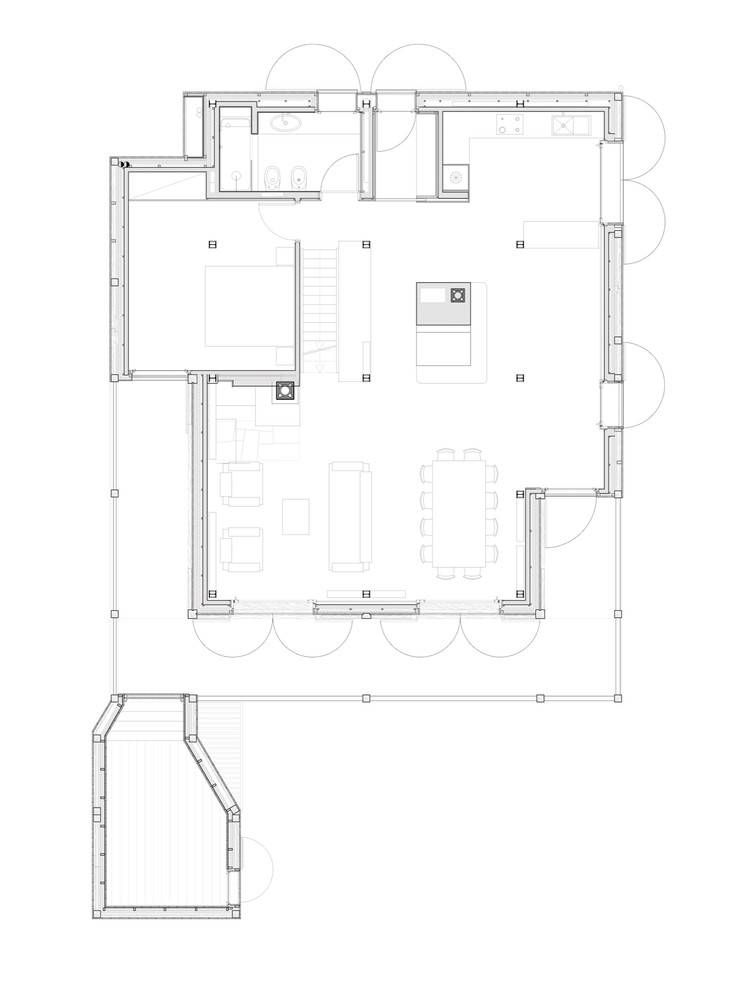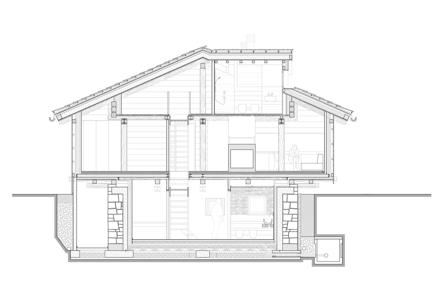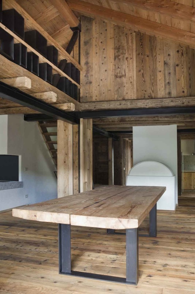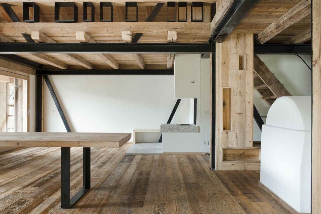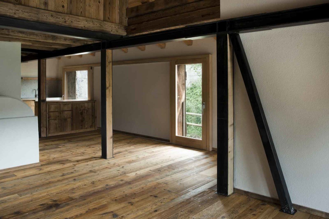 Prace rozpoczęto od demontażu oryginalnych elementów konstrukcyjnych, które następnie starannie oczyszczono i odnowiono. Część starego drewna zastąpiono nowym, impregnowanym materiałem, zachowując jednolitą kolorystykę i rytm konstrukcji. Usunięto zbędne aneksy, przywracając pierwotną, klarowną bryłę budynku. Nowa czarna stalowa konstrukcja, widoczna we wnętrzu, została zaprojektowana w zgodzie z modułową geometrią oryginalnej stodoły. Stalowe belki częściowo obłożono drewnem, co wprowadza nowoczesny kontrast i szlachetność materiałową.