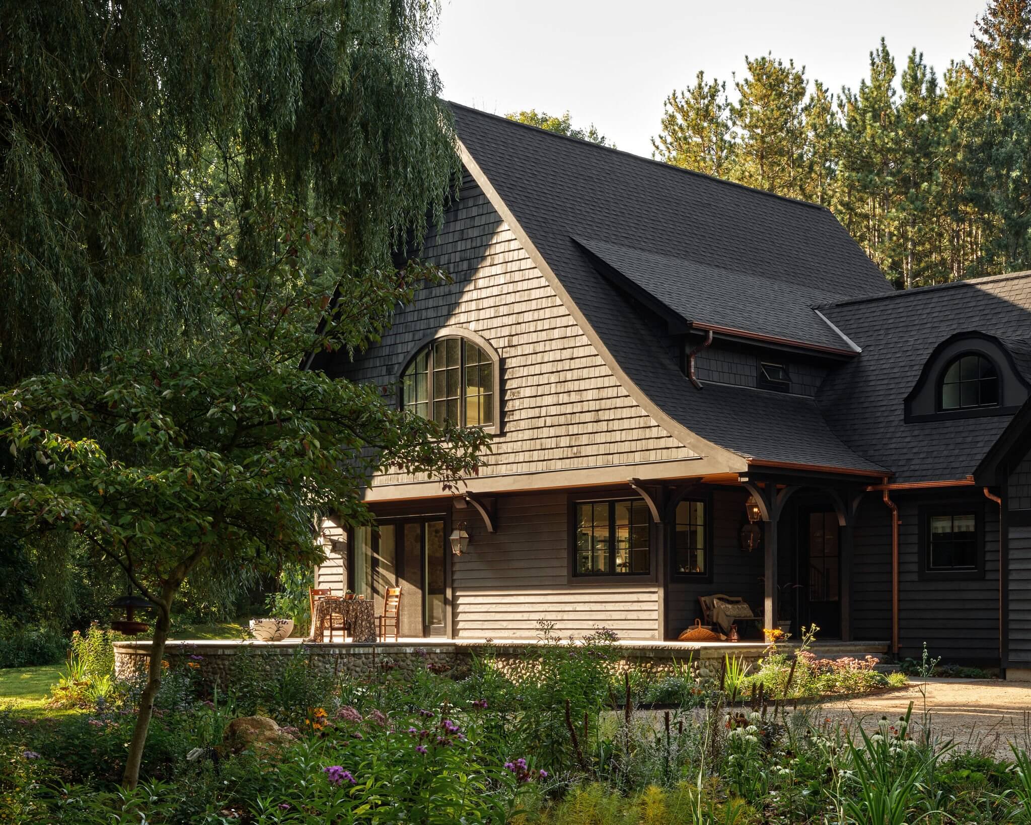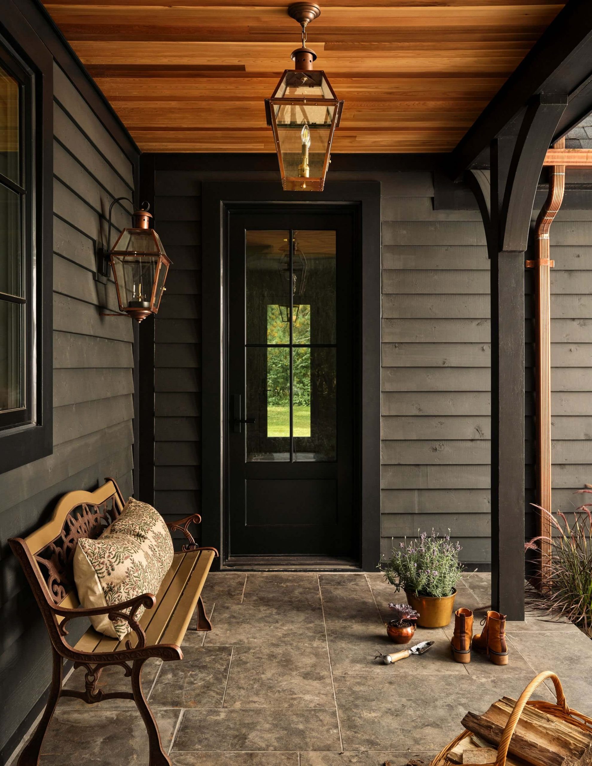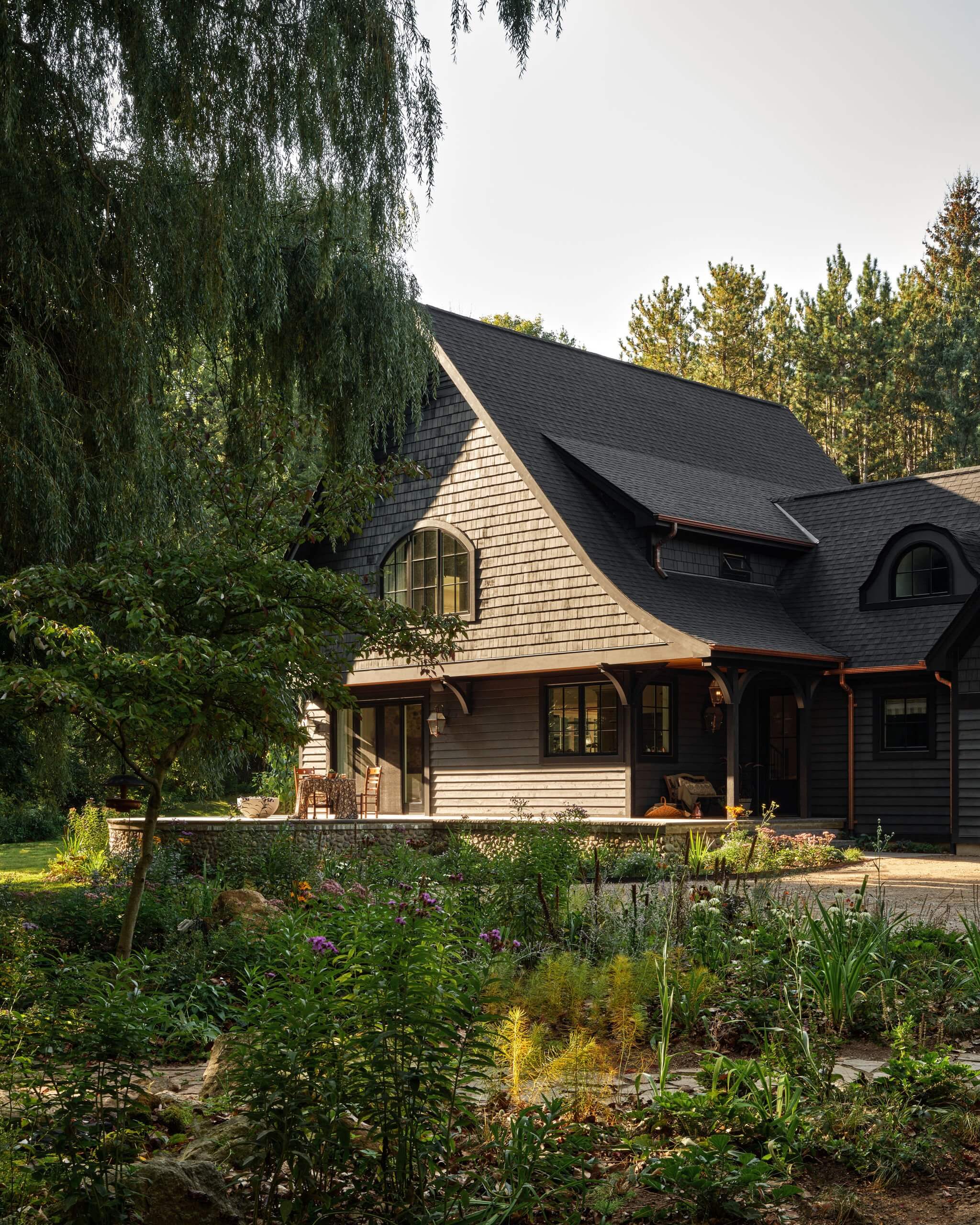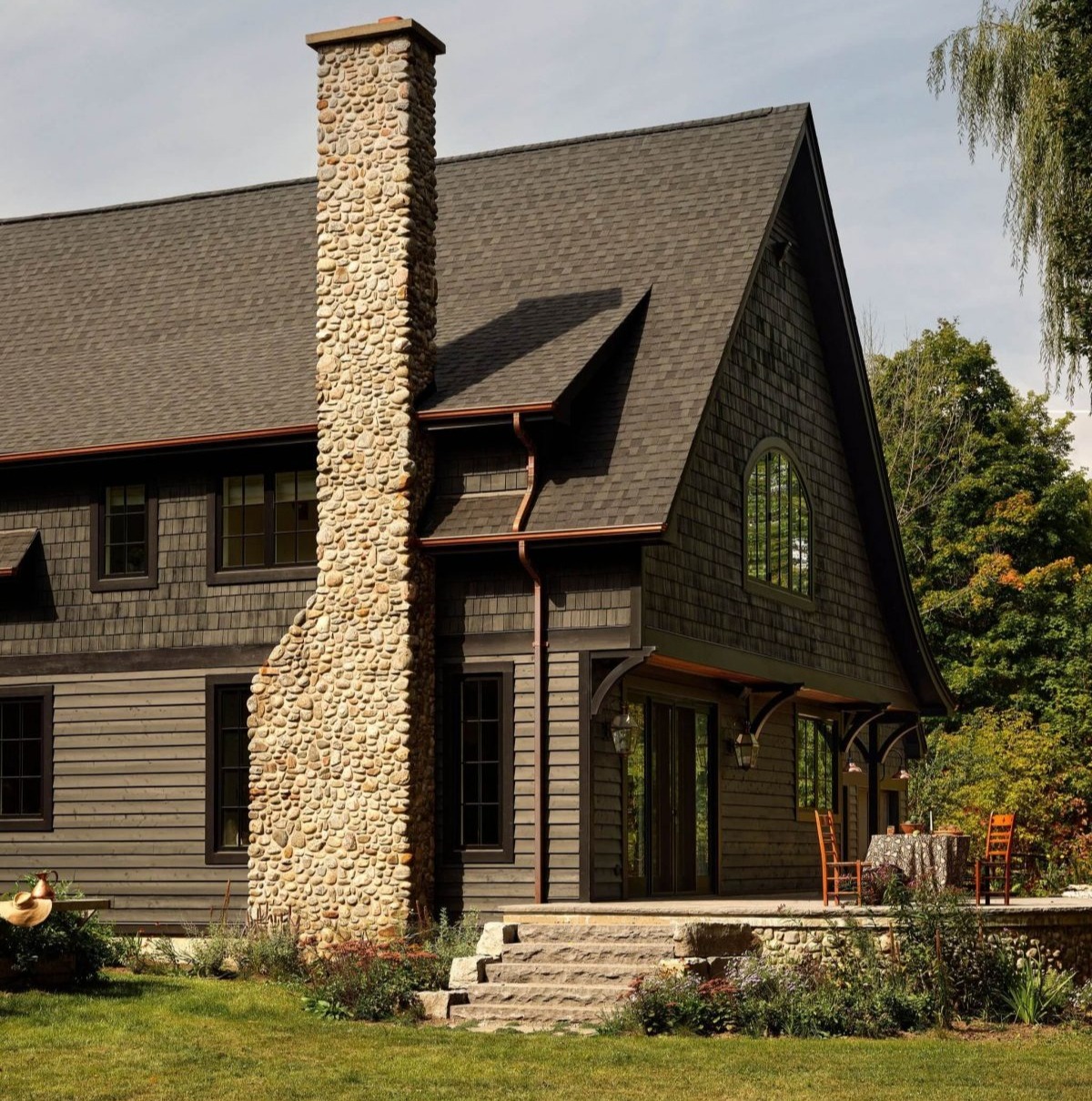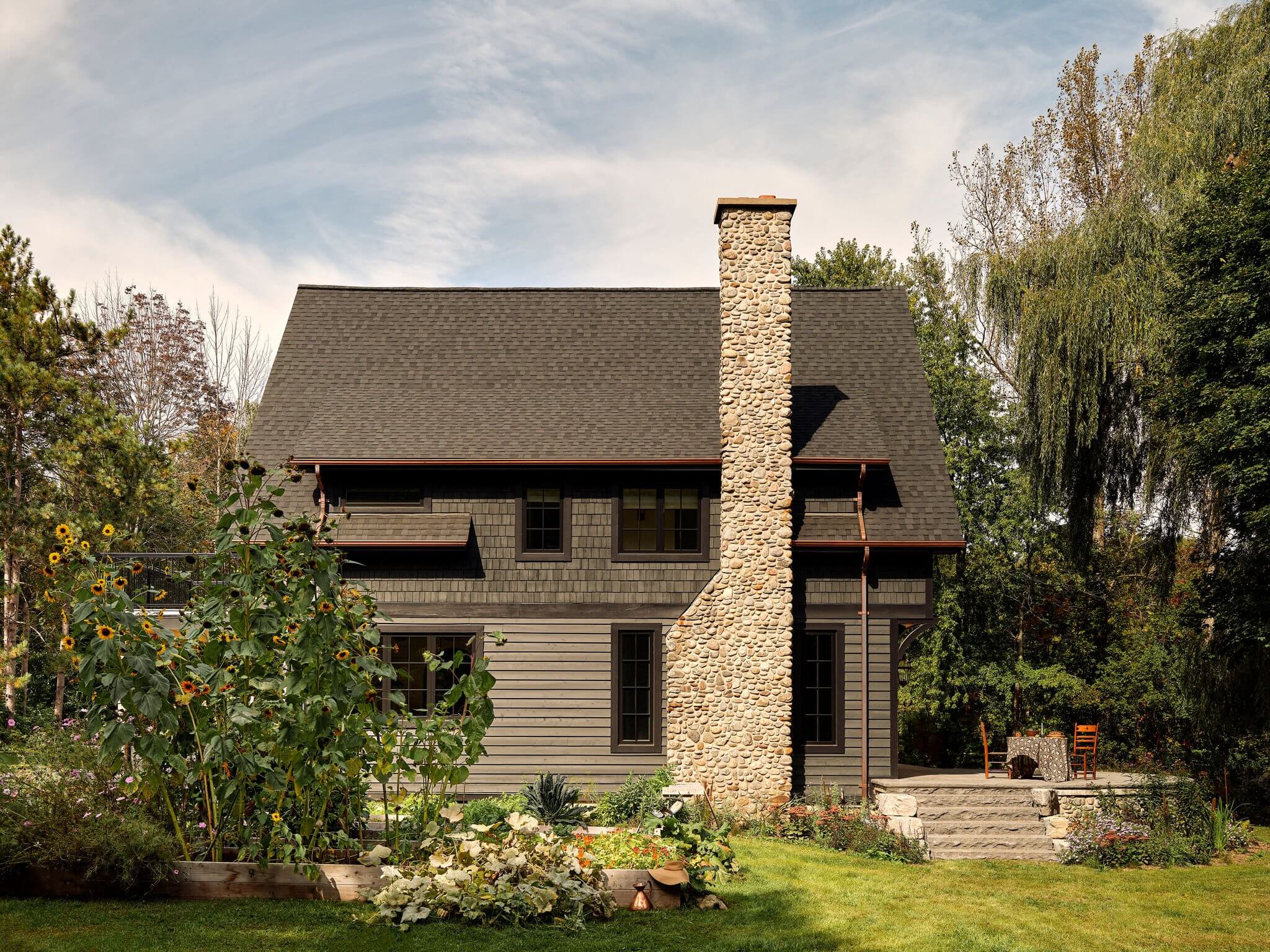 Aby wprowadzić spójność i wyeksponować oryginalny komin z kamienia rzecznego, architektka zdecydowała się na przemalowanie całej elewacji na ciemne, jednolite wykończenie. Efekt? Harmonijna, elegancka bryła, która idealnie oddaje charakter wnętrz – subtelnych, ponadczasowych i pełnych duszy.