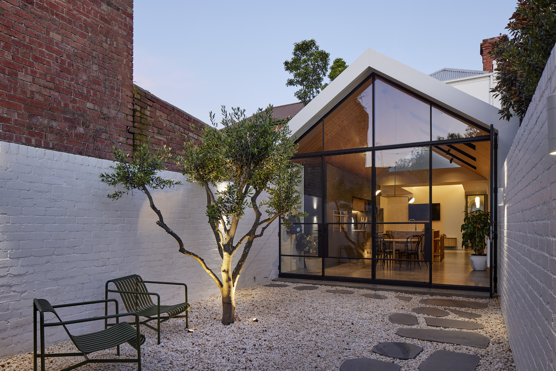 Kluczowym elementem modernizacji stała się nowa dobudowa z dwuspadowym dachem, w której umieszczono przestronną kuchnię i jadalnię. Dzięki dużym przeszkleniom i wprowadzeniu wewnętrznego dziedzińca, dom otwiera się na otoczenie, a granica pomiędzy wnętrzem i zewnętrzem zaciera się. Centralna klatka schodowa została przykryta świetlikiem, który śledzi ruch słońca w ciągu dnia i ożywia przestrzeń subtelnymi grami światła.