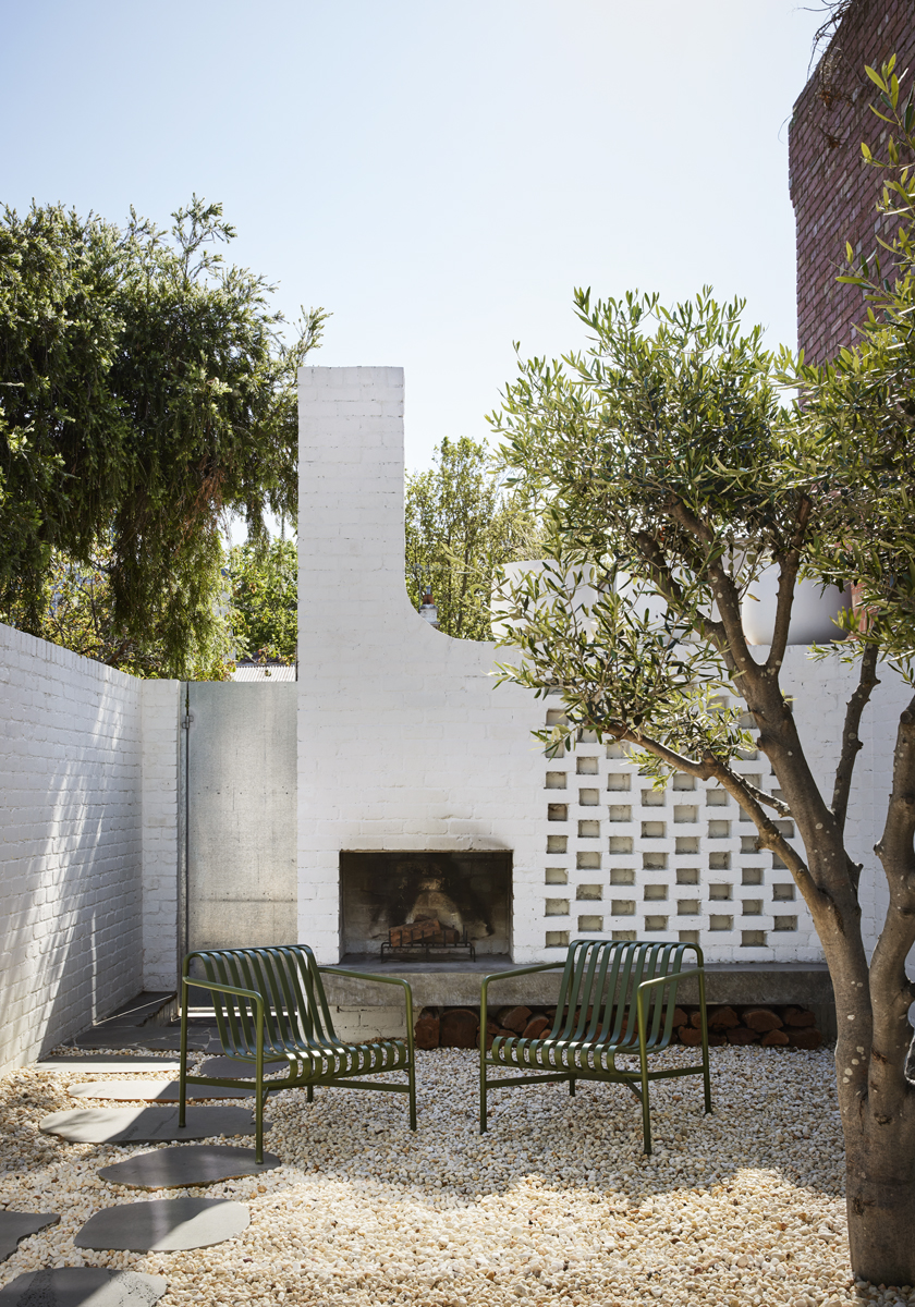 Projekt bazuje na szczerości i autentyczności materiałów. W rozbudowie zastosowano cegły z recyklingu pomalowane na biało, polerowaną betonową posadzkę i wykończenie sufitów w drewnie, co tworzy równowagę pomiędzy surowością a ciepłem. Cegła wykorzystana została również w dziedzińcu, gdzie współtworzy ścianę ażurową i kominek ogrodowy, czyniąc z tej przestrzeni centralny punkt domu. Drewno pojawia się konsekwentnie w całym projekcie, szczególnie w wyspie kuchennej, zestawionej z naturalnym kamieniem. W łazienkach zastosowano białe mozaiki palcowe i jasnoszare płytki lastryko, co dodaje wnętrzom subtelnej faktury.