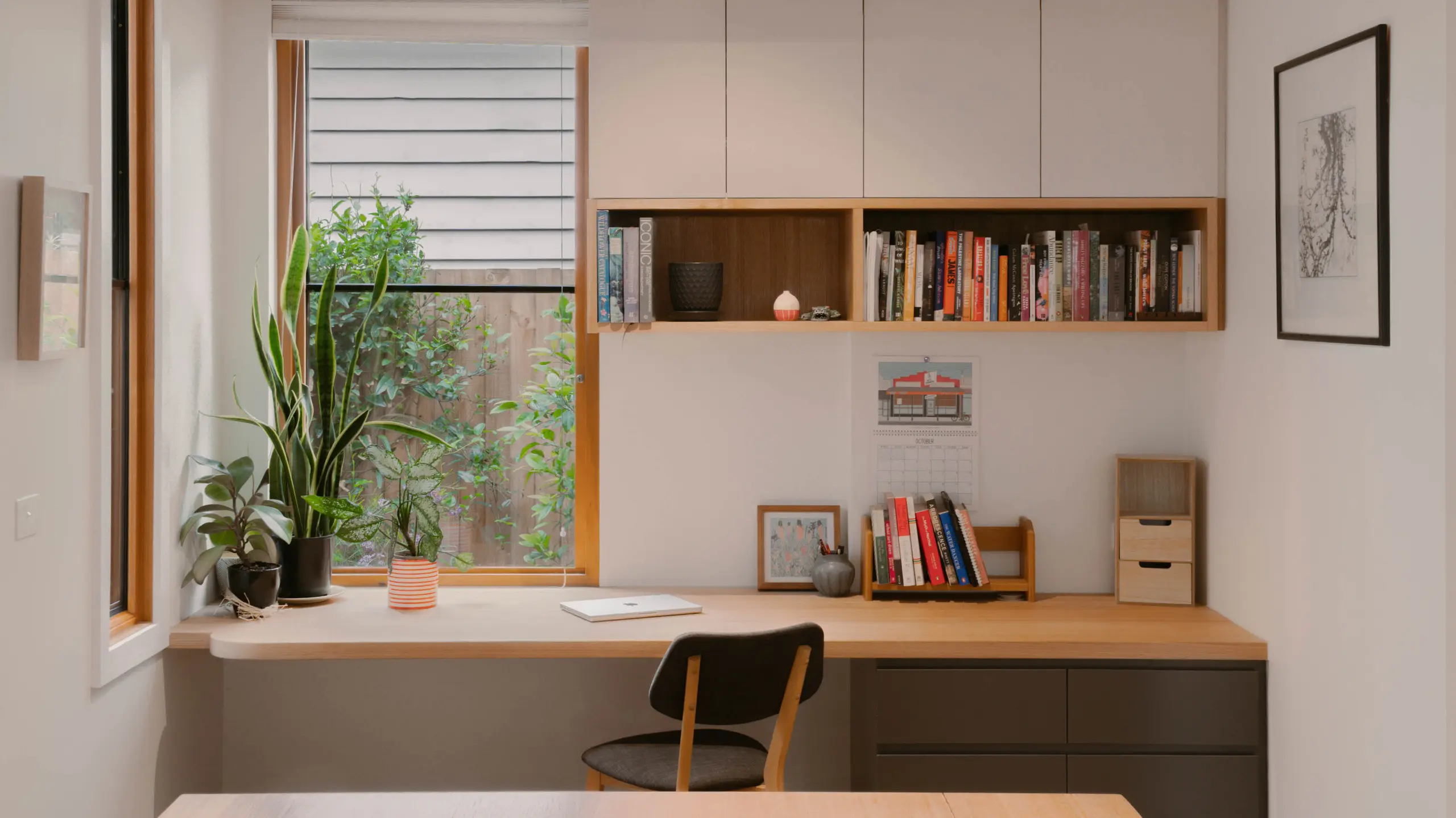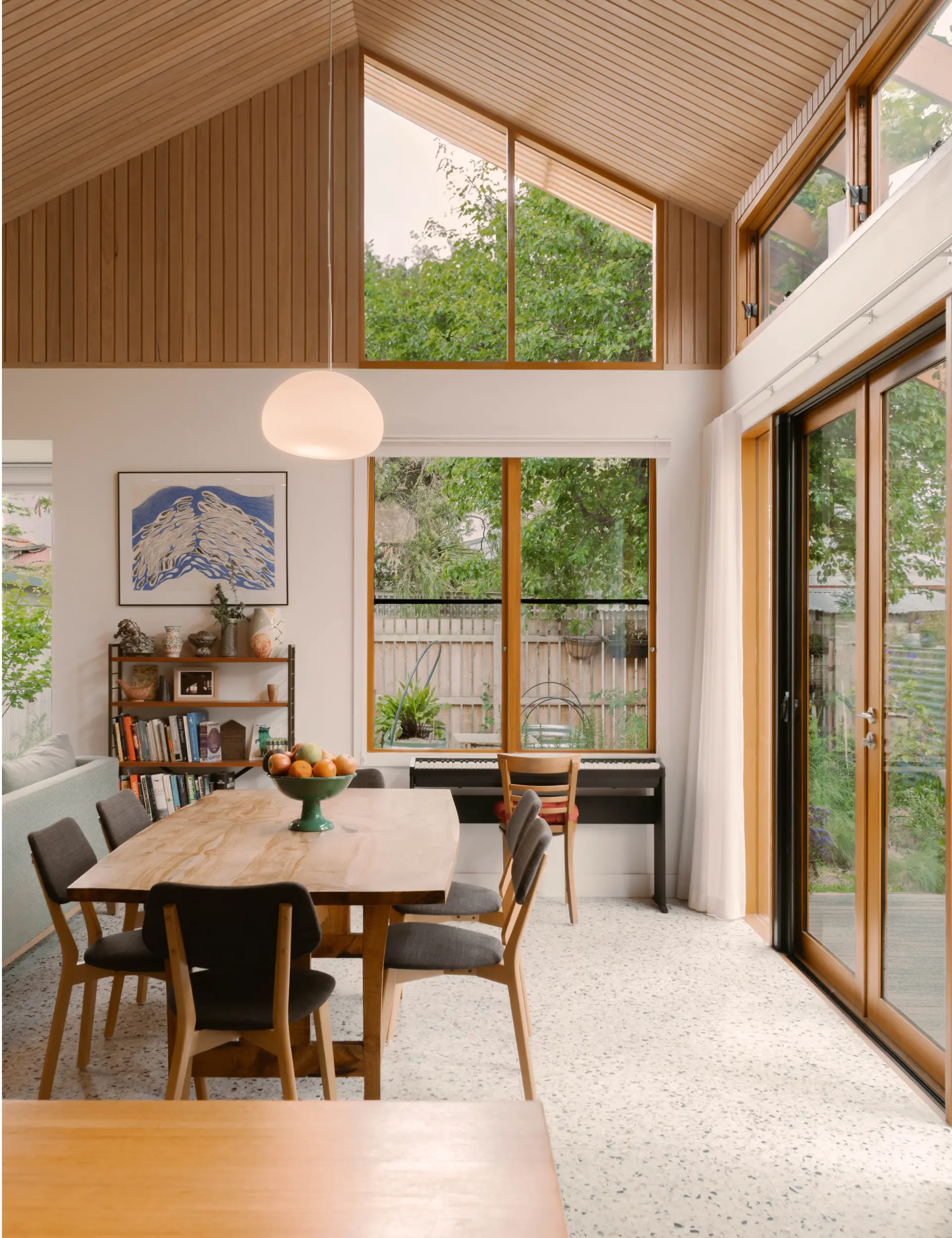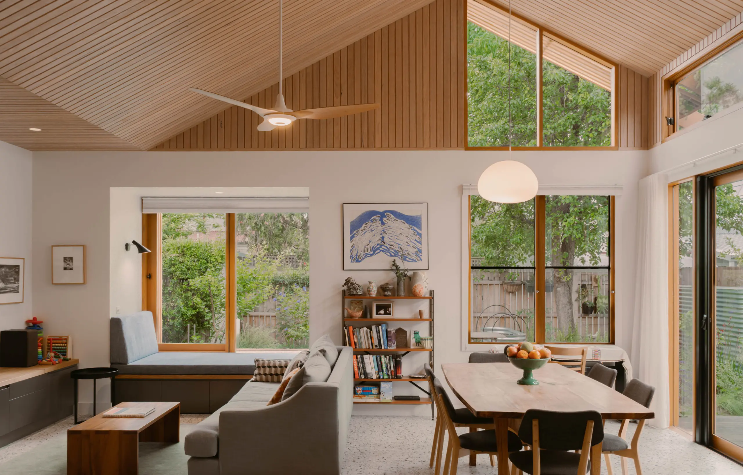 Ample House to odnowiony dom typu California bungalow w Brunswick, zaprojektowany przez Green Sheep Collective dla pary zbliżającej się do emerytury. Inwestorzy szukali możliwości „rightsizingu” — zmniejszenia skali domu bez rezygnacji z jakości życia, centralnej lokalizacji i kontaktu z ogrodem. Zamiast powiększać metraż pod dyktando rynku, projekt skupił się na tym, co rzeczywiście potrzebne do komfortowego, długoterminowego zamieszkania.
