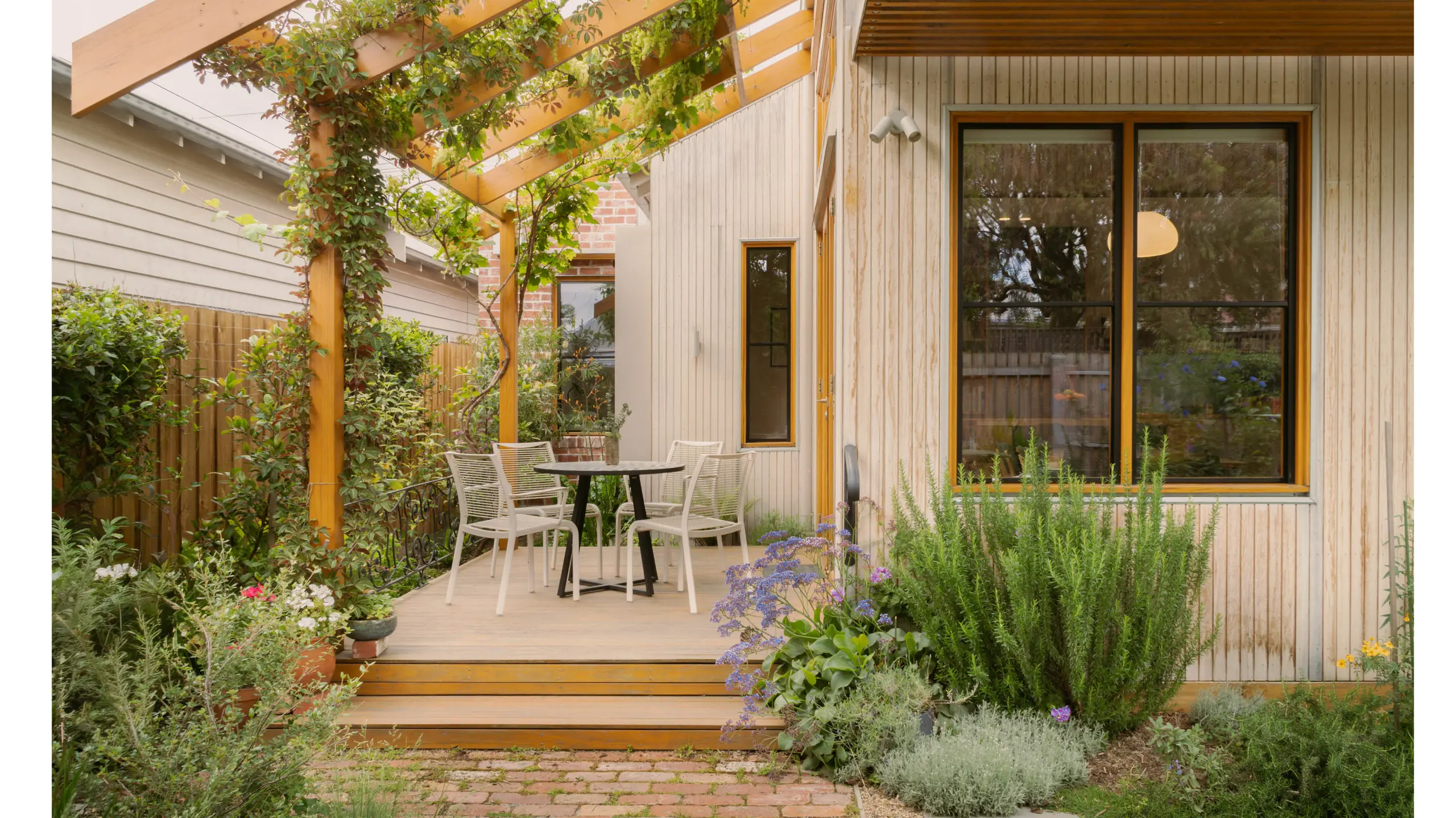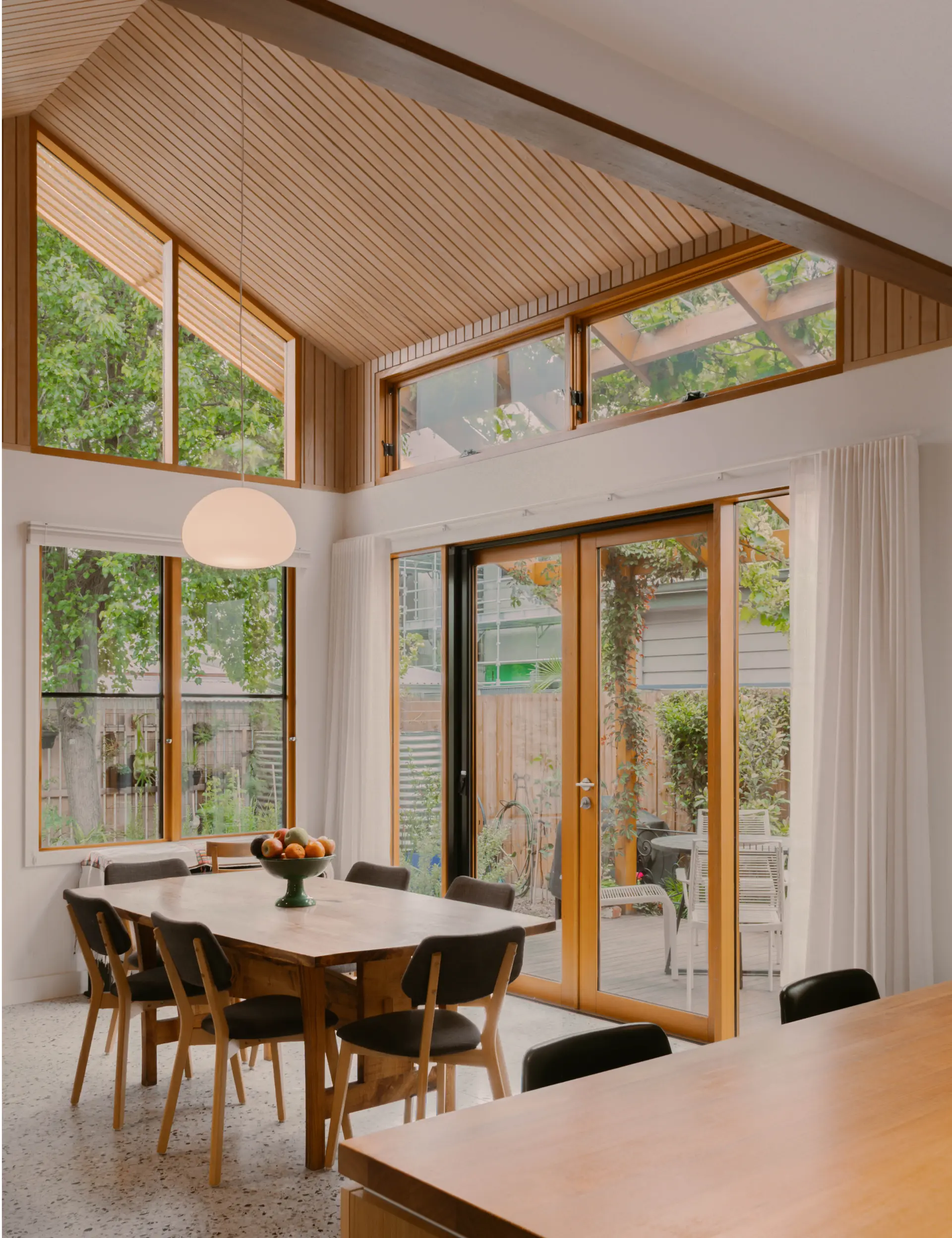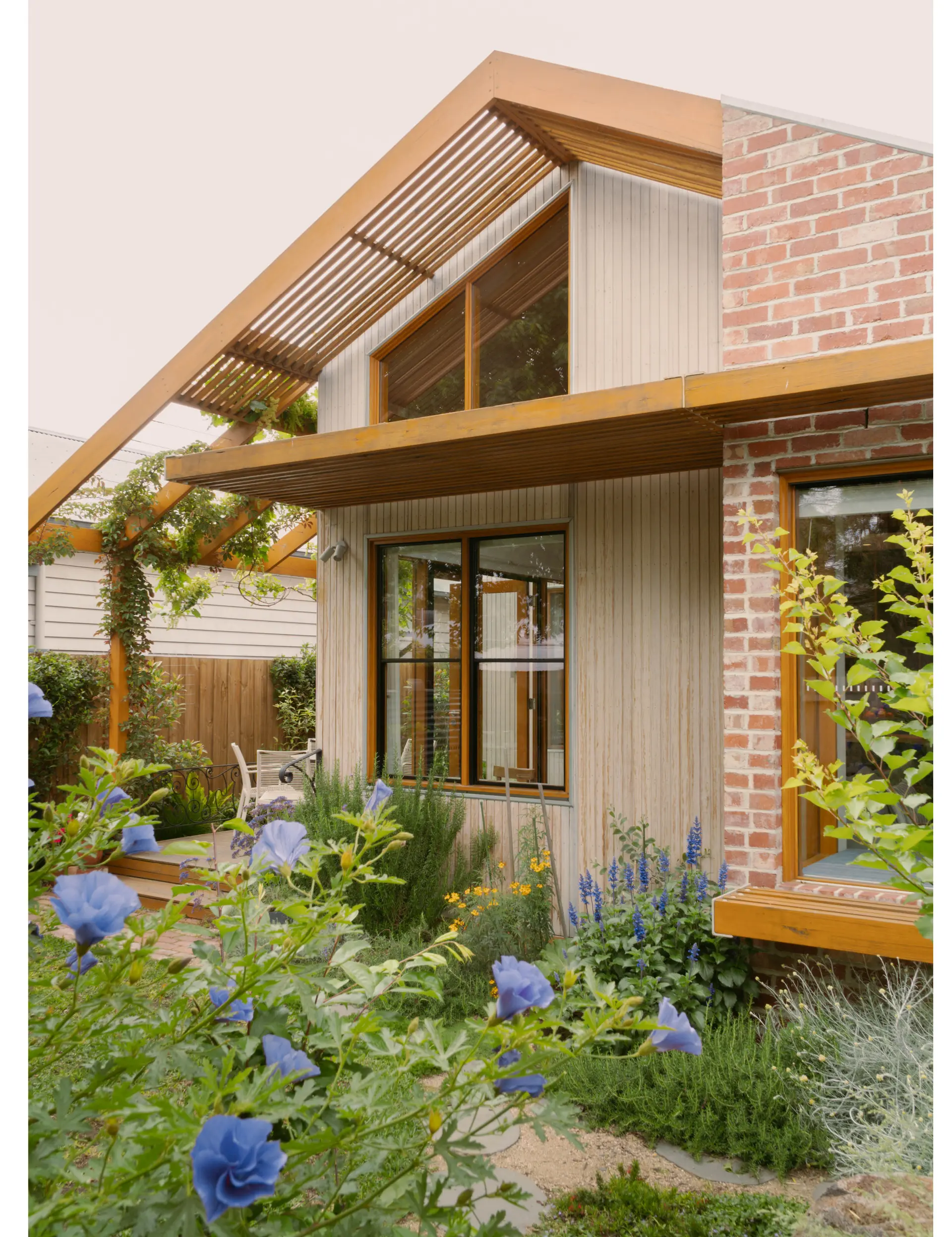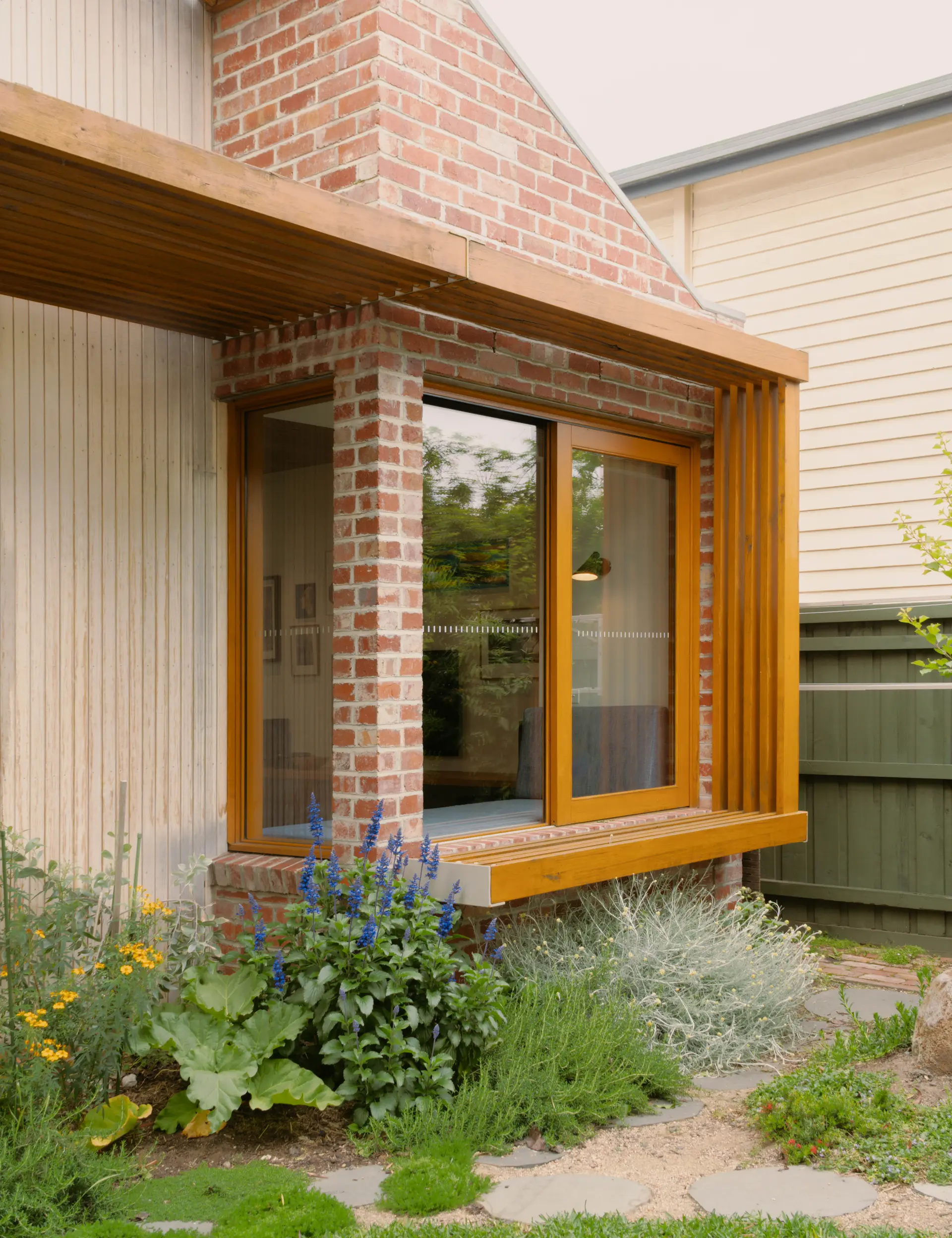 Nowa część od strony ogrodu łączy cegłę z odzysku, bieloną okładzinę typu shiplap oraz elementy drewniane w miodowym odcieniu. Ta radosna, ale wyważona kompozycja wpisuje się w charakter Brunswick, zachowując sąsiedzką skalę i przyjazny wyraz. Ogród — pielęgnowany przez właścicieli — dosłownie dochodzi do domu, zapewniając kojące widoki z każdego pomieszczenia na niewielkiej, 265-metrowej działce.