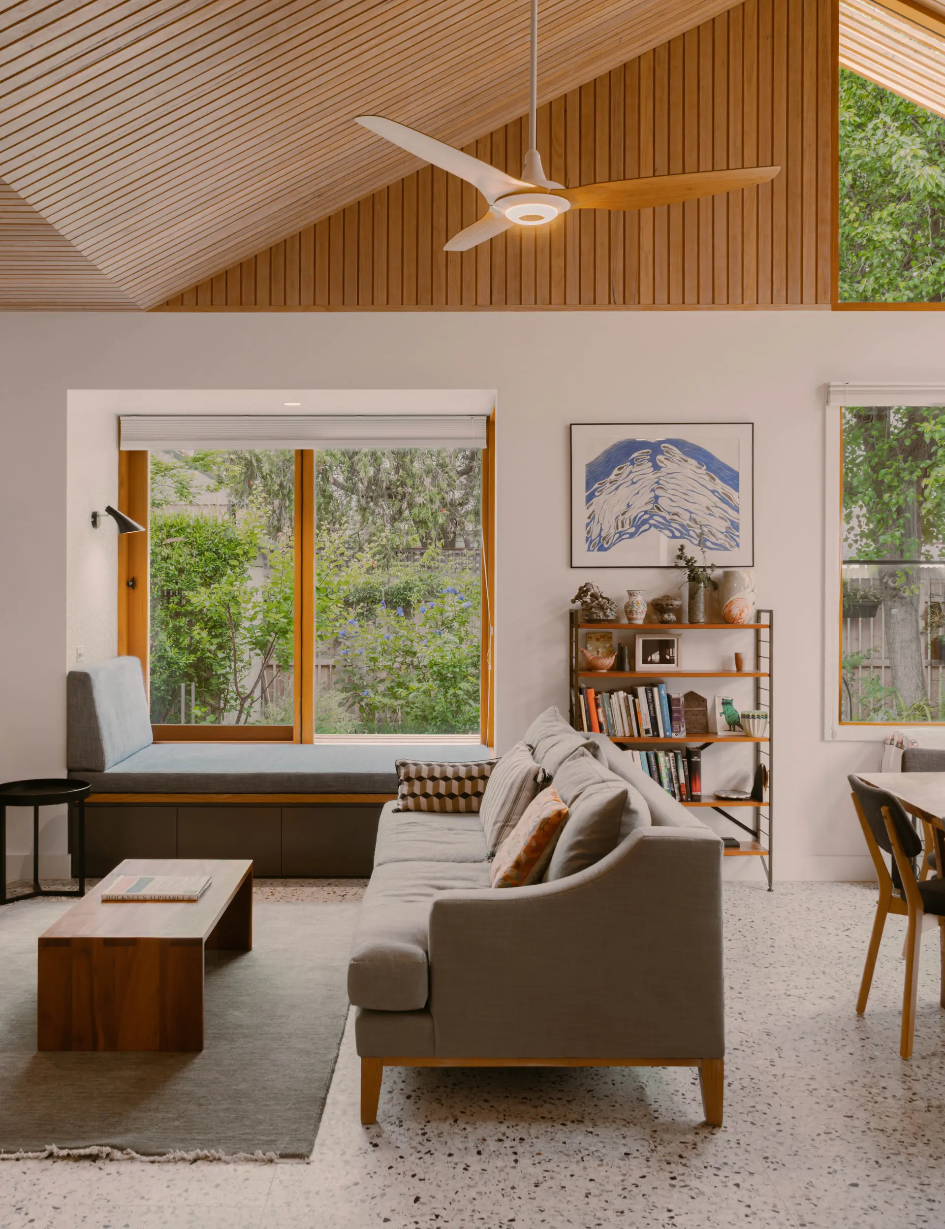 Paleta materiałowa jest stonowana, aby stanowić tło dla kolorowych, eklektycznych przedmiotów właścicieli. Drewno — szczególnie na suficie — wprowadza ciepło i poczucie przytulności, a terrazzo na posadzce dodaje subtelnej lekkości i gry. To wnętrza, które są spokojne, ale nie sterylne; funkcjonalne, lecz z charakterem.