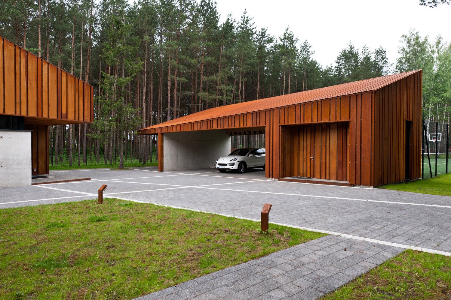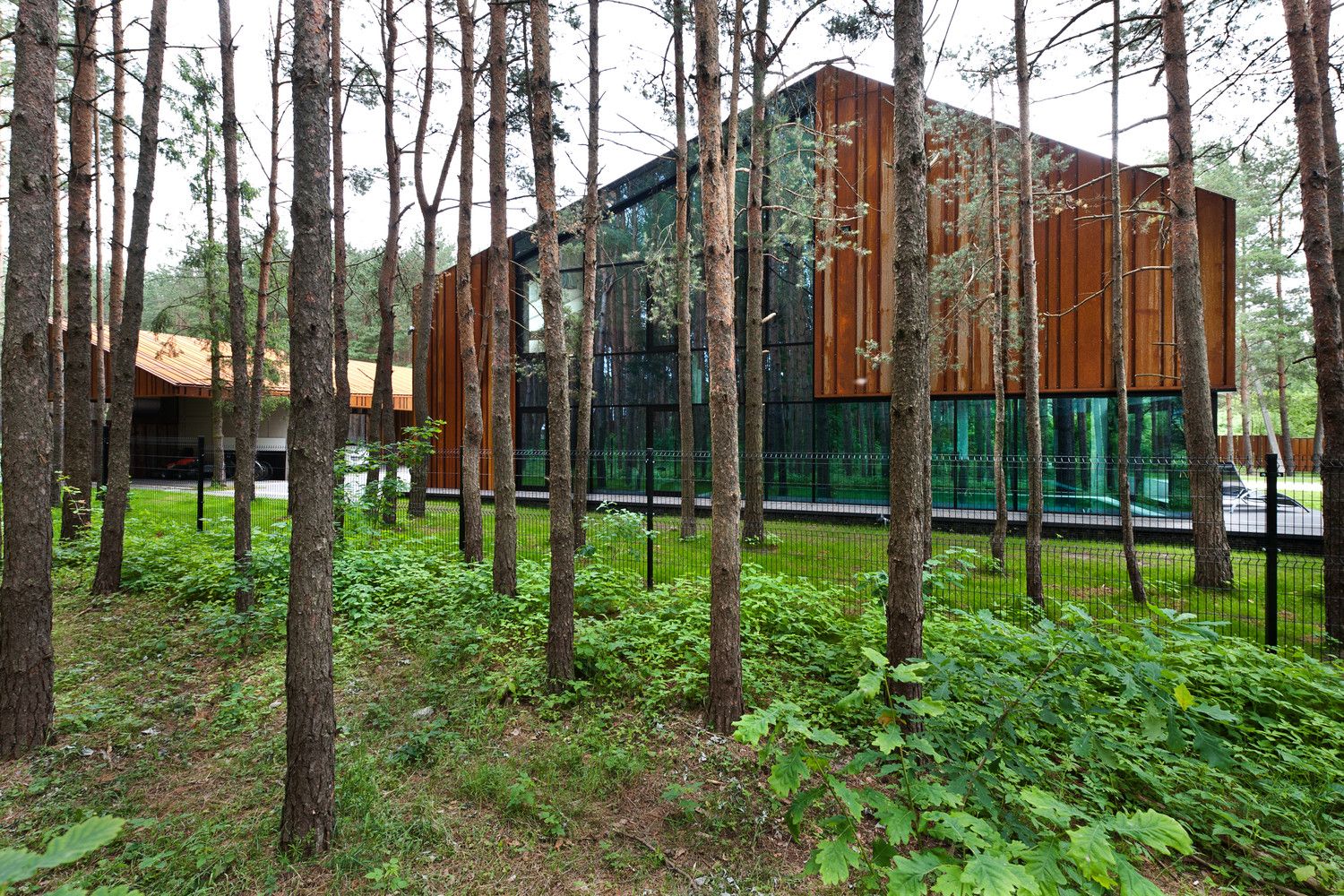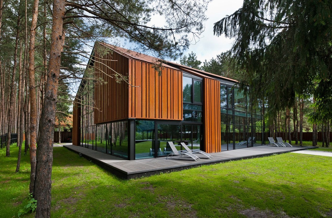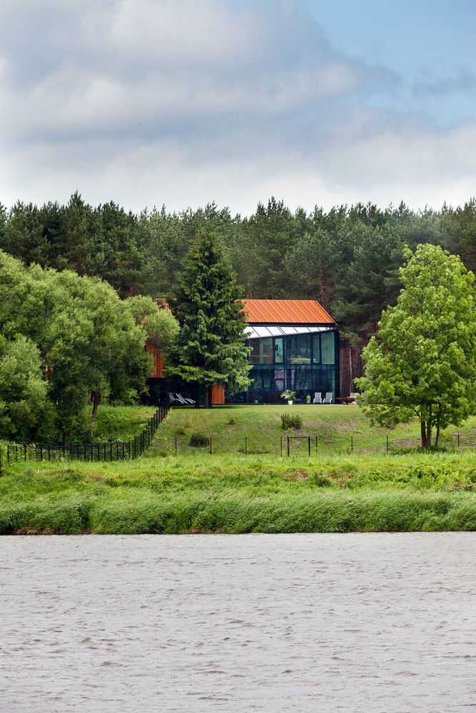 Nowoczesna stodoła stoi nad brzegiem rzeki, wyróżniając się zewnętrzną powłoką ze szkła i pionowo zamontowanych, „zardzewiałych” paneli stalowych, które nawiązują do pobliskich drzew sosnowych. Budynek łączy nowoczesne rozwiązania architektoniczne z otoczeniem przyrody, tworząc harmonijną relację między wnętrzem a krajobrazem.