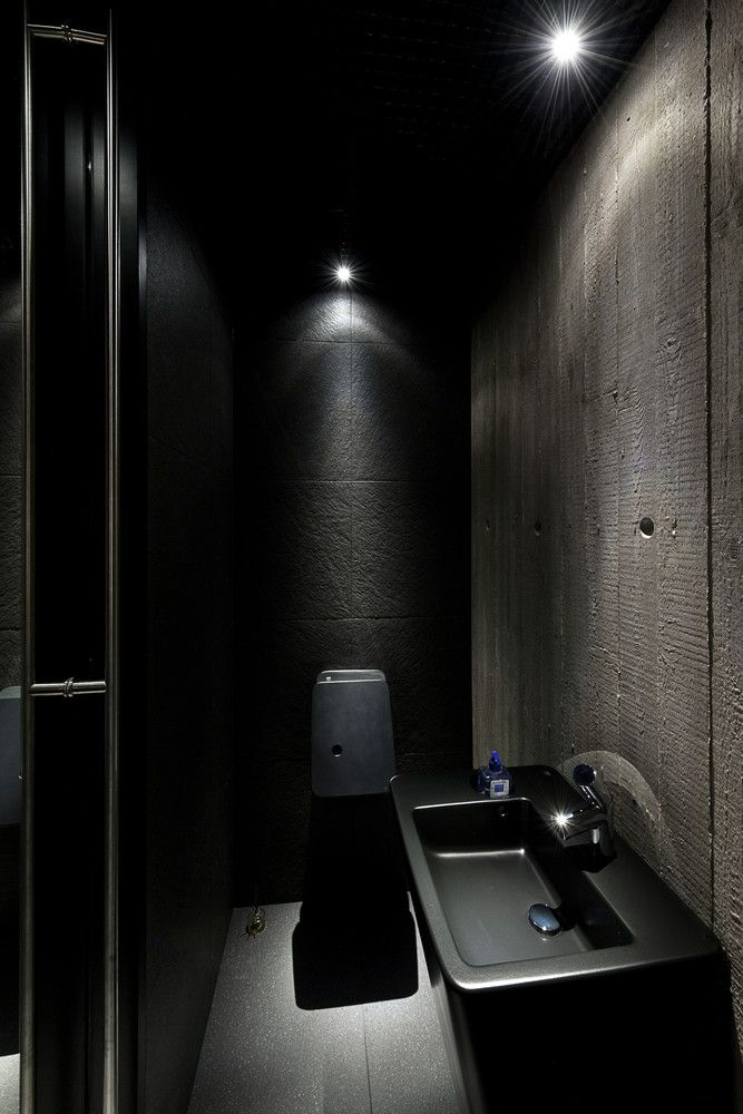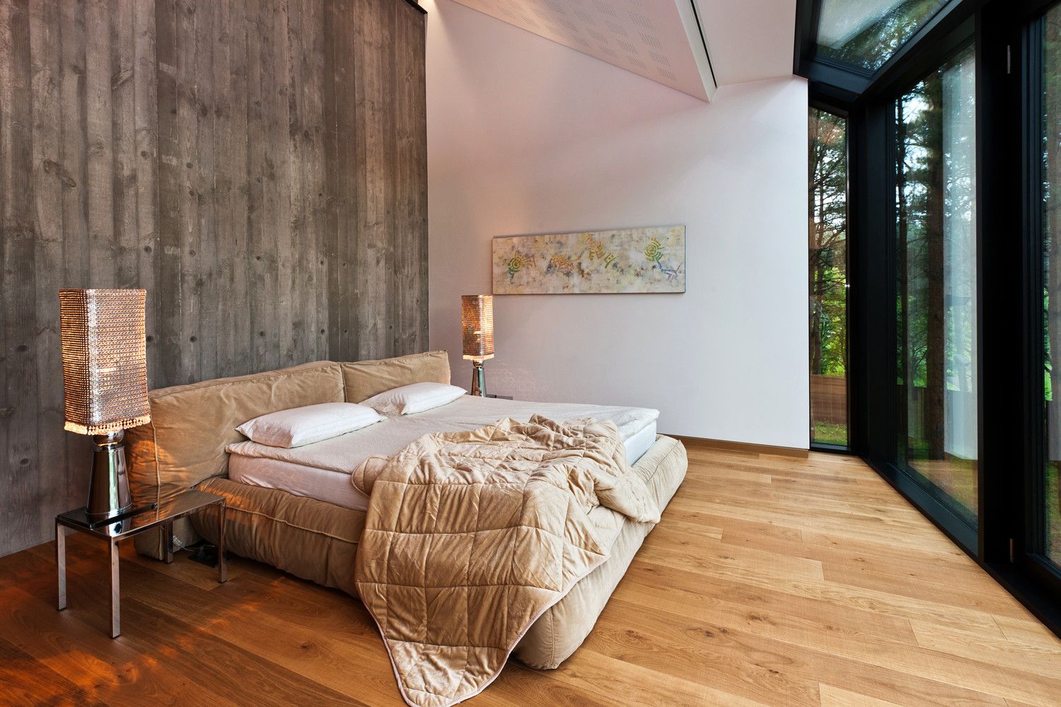 Wnętrze wykorzystuje śmiałe, nowoczesne elementy projektowe. Usunięcie drewnianych szalunków odsłoniło surowy beton, który stał się głównym elementem dekoracyjnym. Liczne szklane powierzchnie pozwalają maksymalnie zbliżyć przestrzeń do natury. Ważną rolę odgrywa także oświetlenie – salon wyposażono w funkcjonalne reflektory, które podkreślają strefy użytkowe, od stołu w jadalni po zaciszny kącik wypoczynkowy.