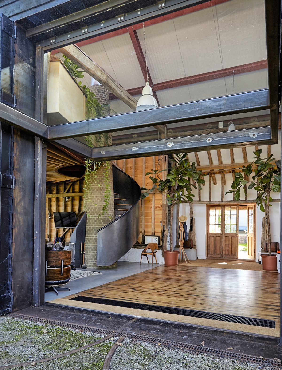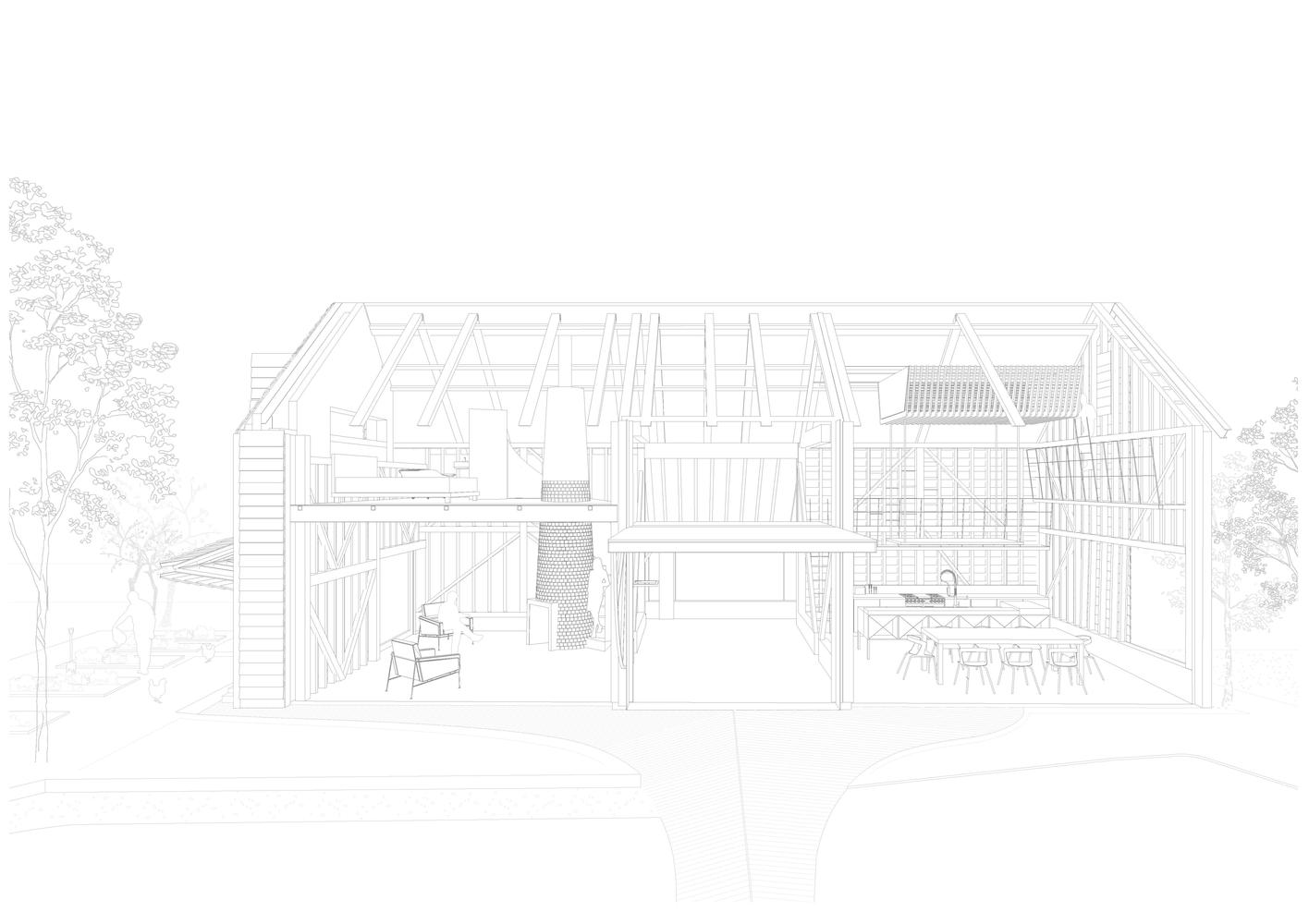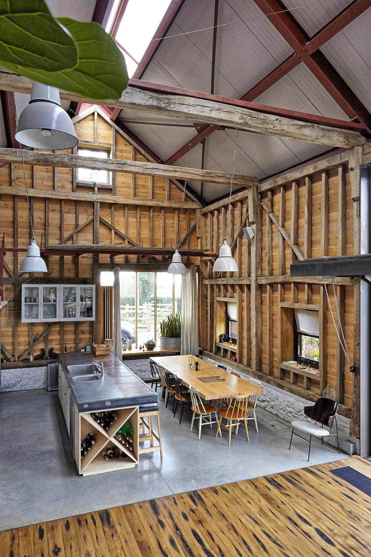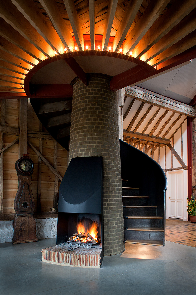 W projekcie wykorzystano dębową konstrukcję, która została rozebrana i naprawiona, oraz elementy stalowe, co pozwoliło przyspieszyć budowę. Antresola z przestrzenią do spania opiera się na ceglanym kominie, z stalowymi schodami wprowadzającymi nowoczesny kontrast.