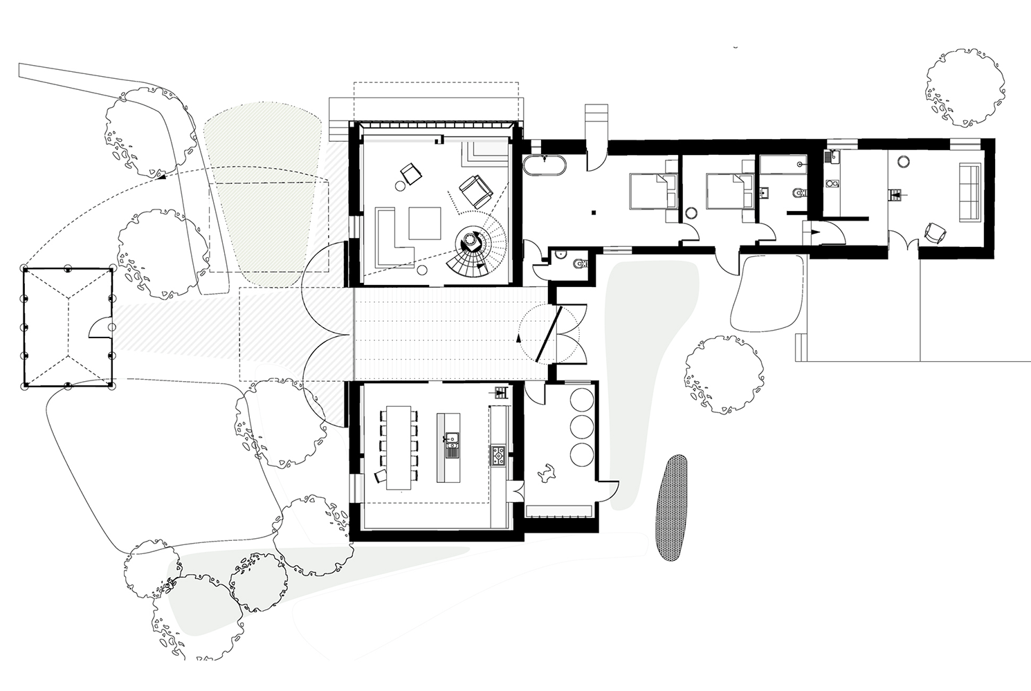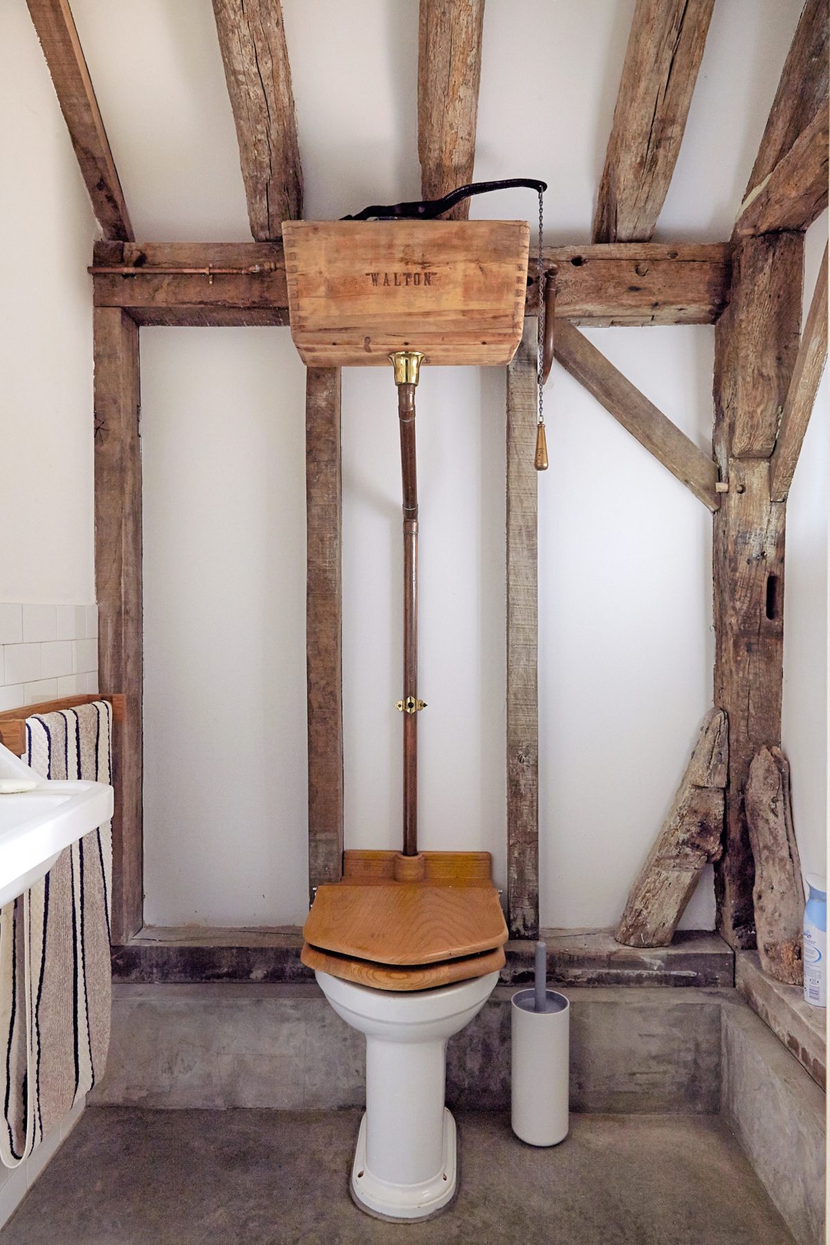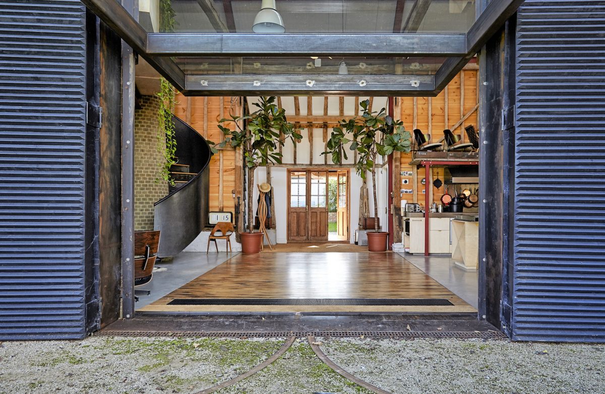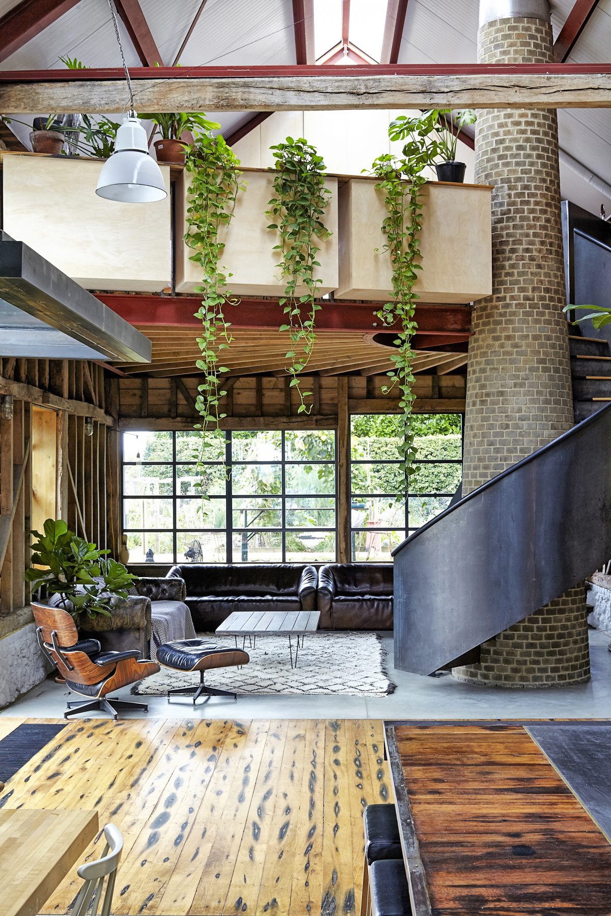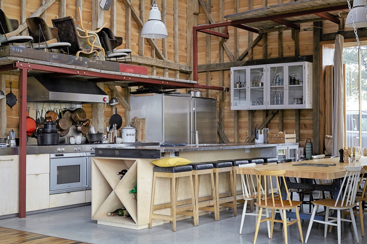 W projekcie wykorzystano dębową konstrukcję, która została rozebrana i naprawiona, oraz elementy stalowe, co pozwoliło przyspieszyć budowę. Antresola z przestrzenią do spania opiera się na ceglanym kominie, z stalowymi schodami wprowadzającymi nowoczesny kontrast.