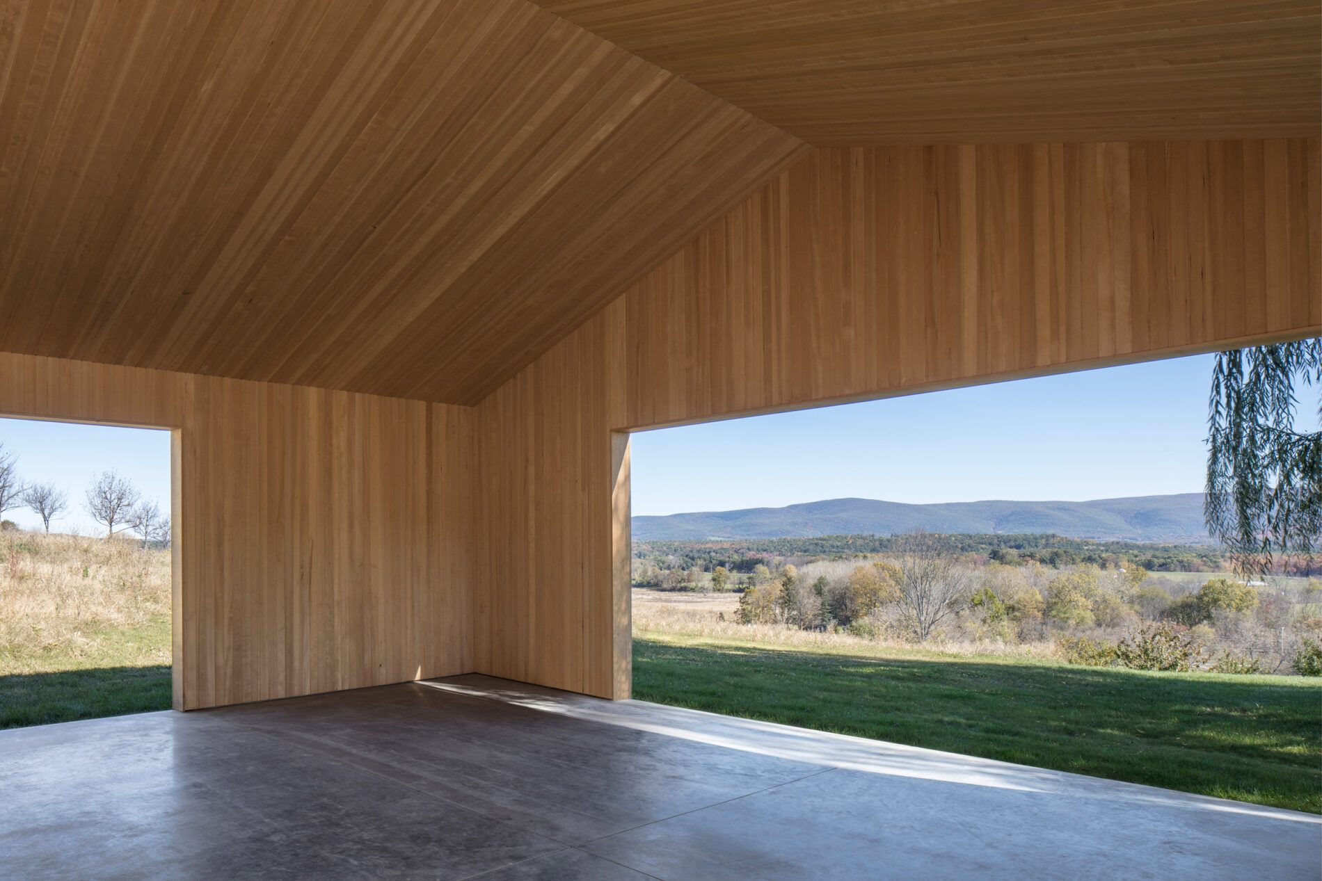 Minimalistyczny budynek jest dodatkowym elementem na pełnej tradycji, ogromnej działce o powierzchni 12 hektarów, która znajduje się w mieście Ancram w stanie Nowy Jork.
