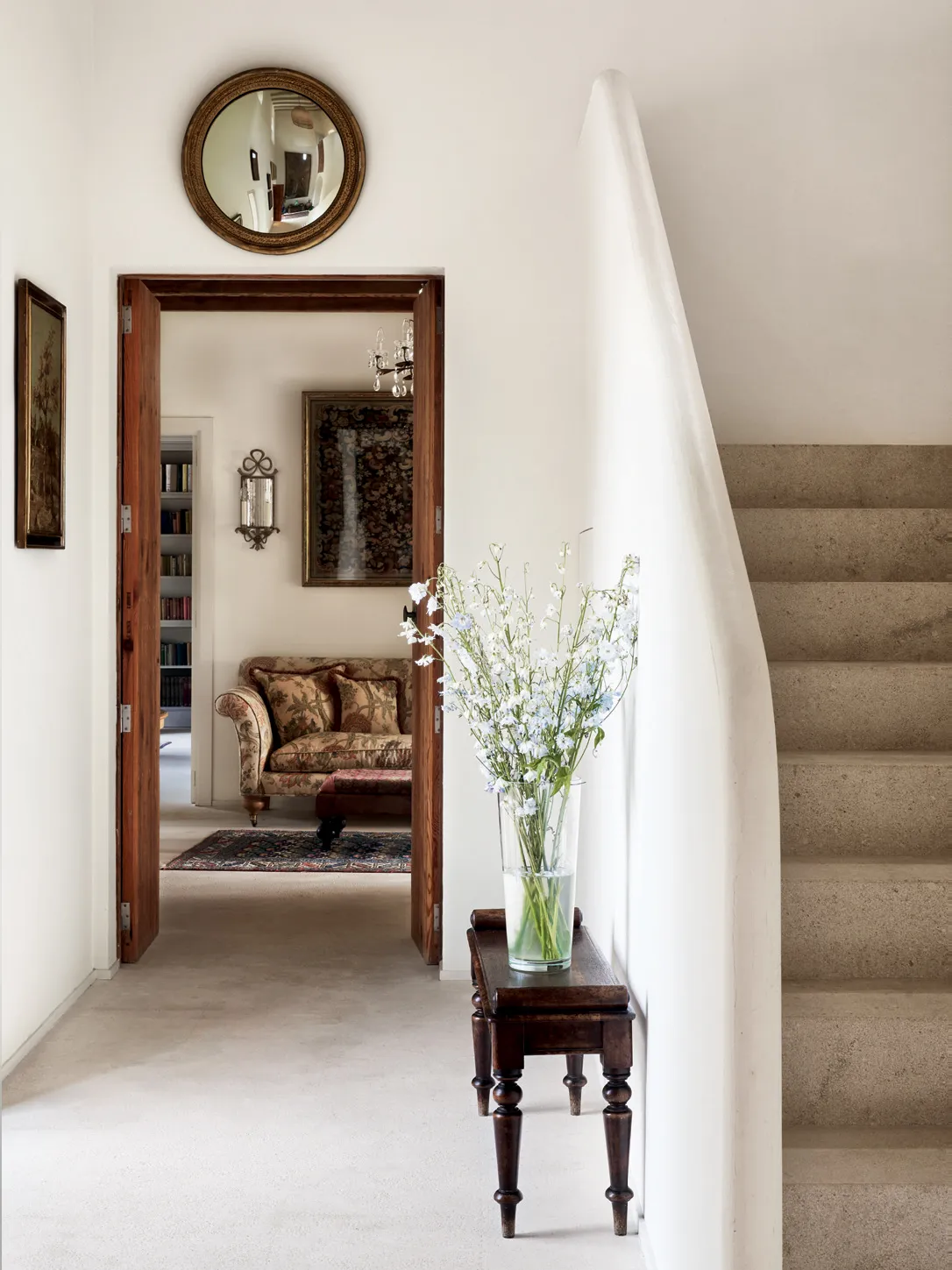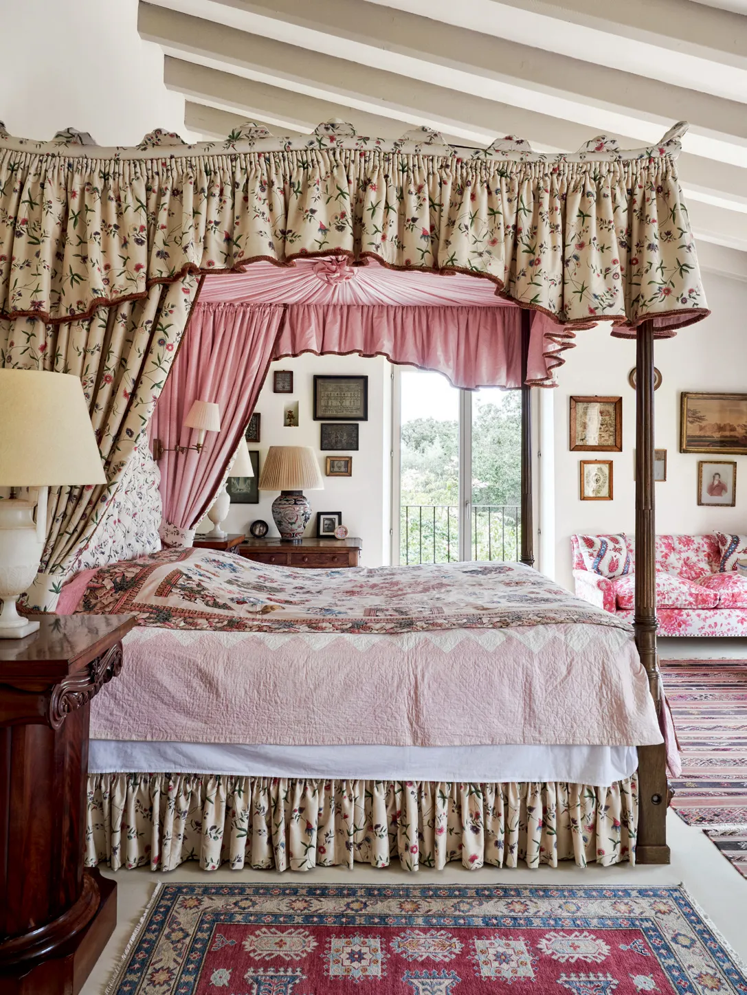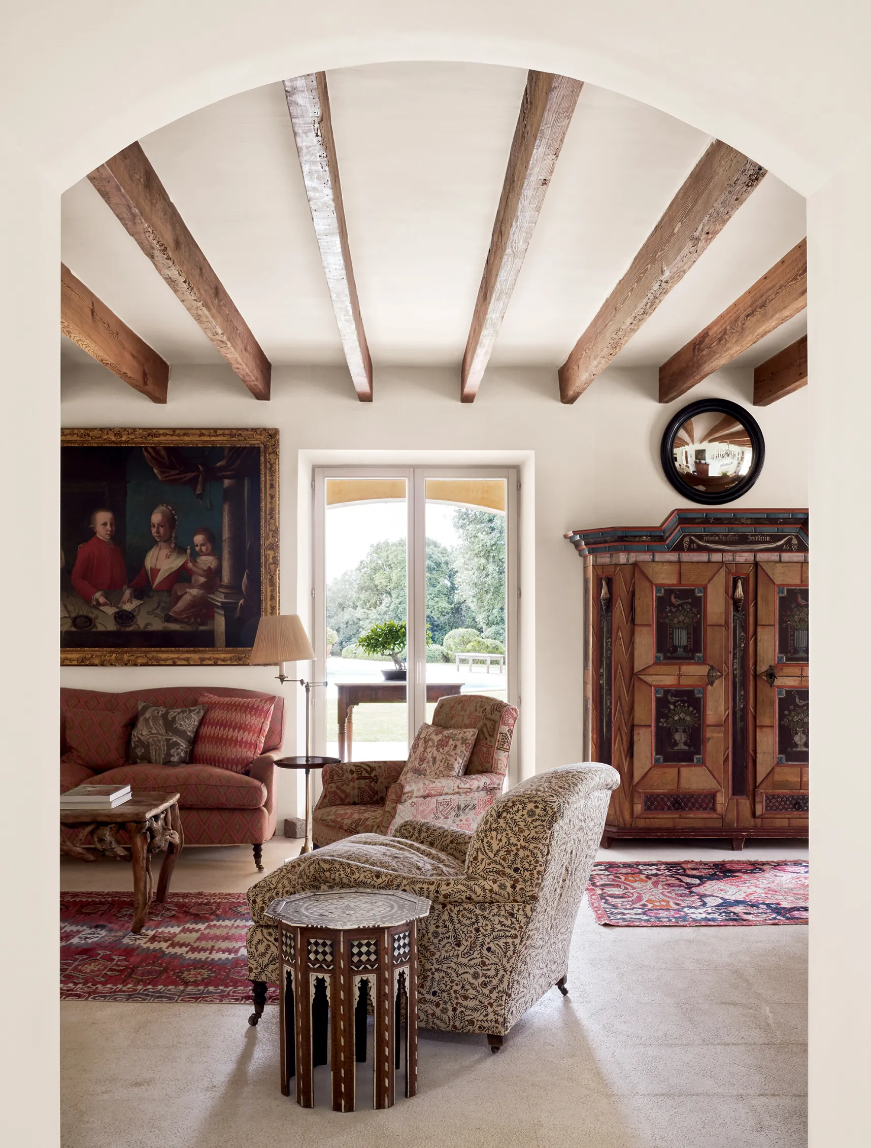 Dom to mistrzostwo aranżacji i wzornictwa: bielone ściany i wapienne podłogi stanowią neutralną bazę dla wyrazistej mieszanki lnu, jedwabiu, pasków i kwiatowych tkanin, charakterystycznych dla angielskiej estetyki. Pomarańczowo-różowa sofa w salonie kontrastuje z XVIII-wiecznym olejnym portretem rodziny Wertzów, a sam salon otwiera się z trzech stron na śródziemnomorski ogród.