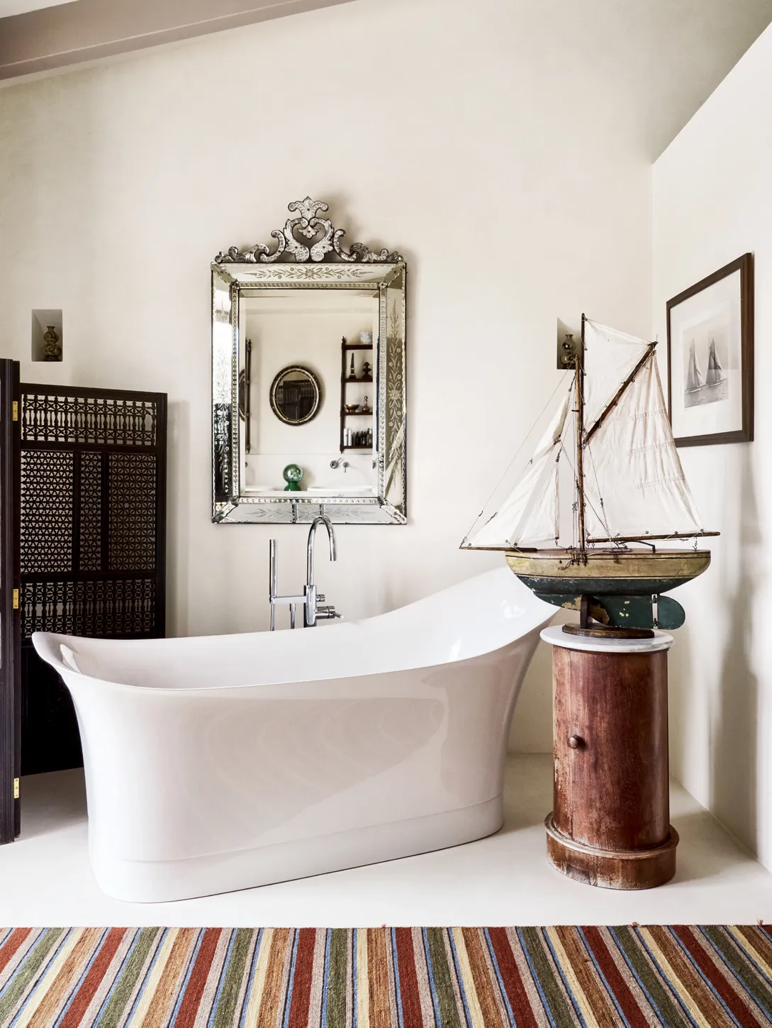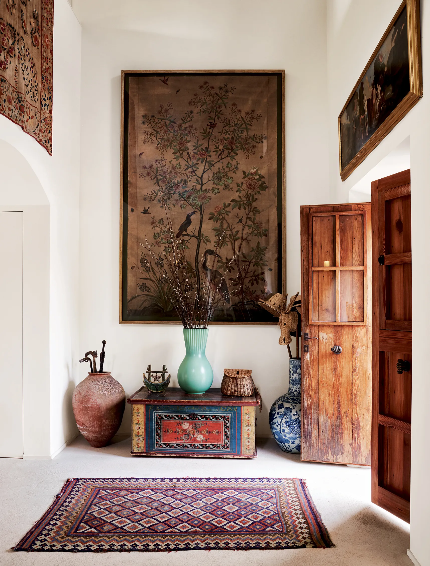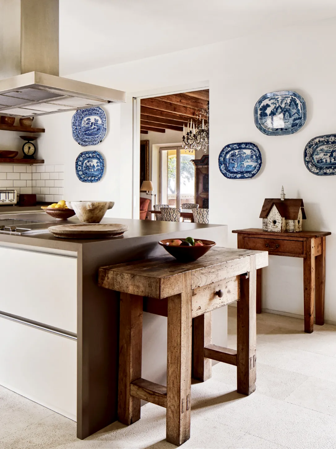 Dom to mistrzostwo aranżacji i wzornictwa: bielone ściany i wapienne podłogi stanowią neutralną bazę dla wyrazistej mieszanki lnu, jedwabiu, pasków i kwiatowych tkanin, charakterystycznych dla angielskiej estetyki. Pomarańczowo-różowa sofa w salonie kontrastuje z XVIII-wiecznym olejnym portretem rodziny Wertzów, a sam salon otwiera się z trzech stron na śródziemnomorski ogród.