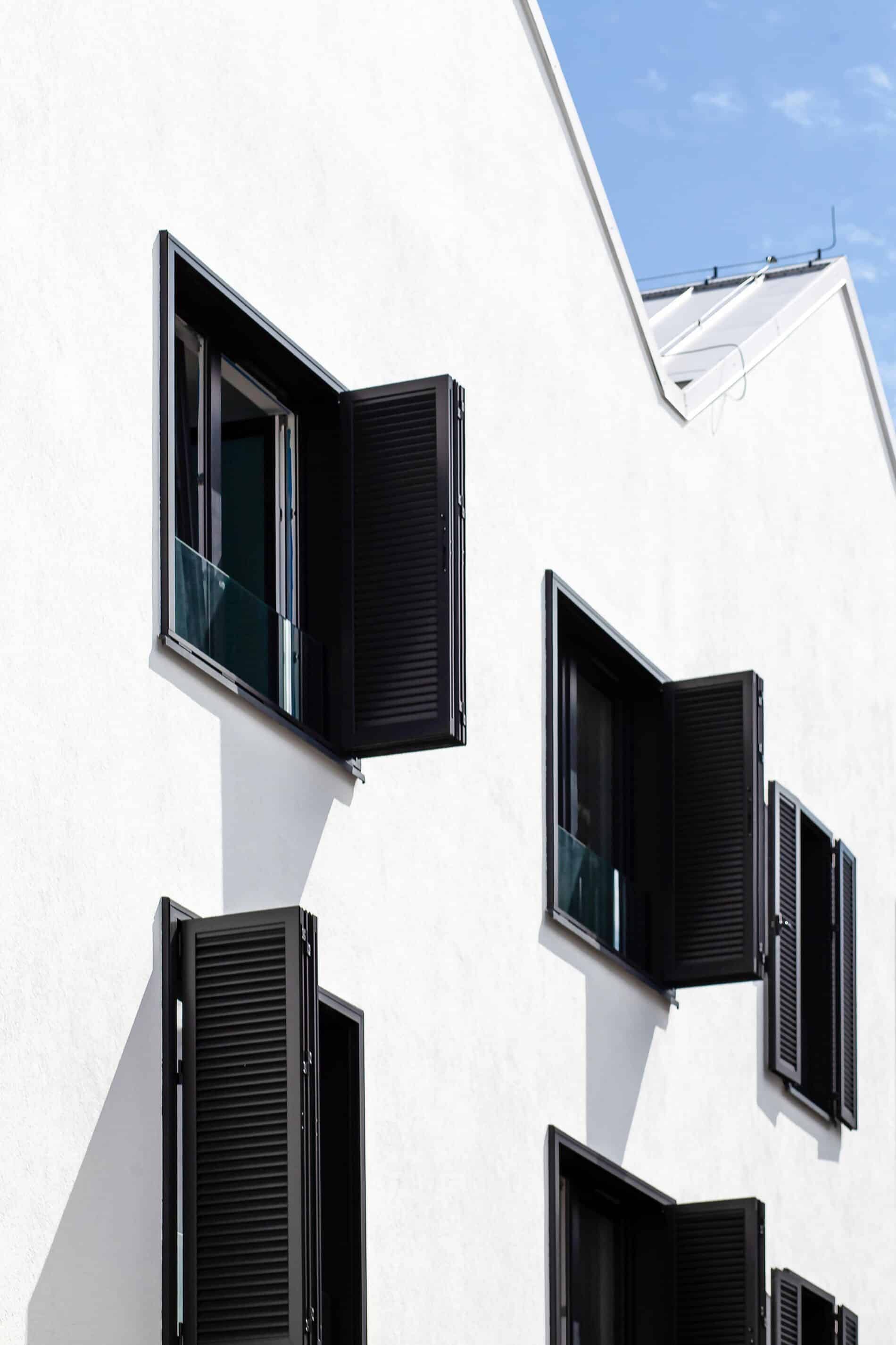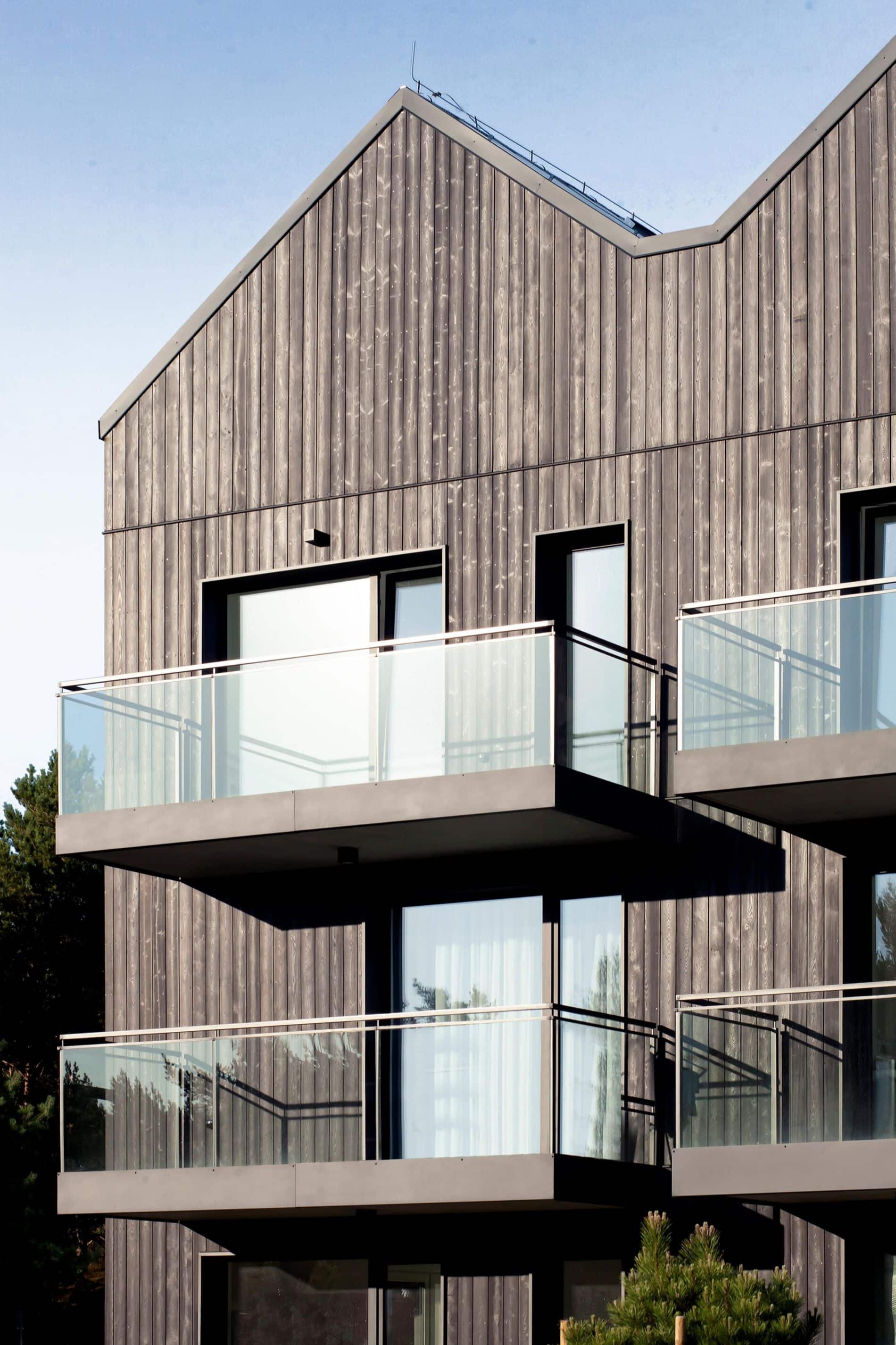 Architektura Porto Łeba odwołuje się do skandynawskich wzorców prostoty i funkcjonalności, które doskonale współgrają z nadmorskim otoczeniem. Stonowana kolorystyka, czytelna geometria i spokojne proporcje brył podkreślają naturalność miejsca. Elewacje wykonano z drewna opalanego metodą YAKISUGI — tradycyjną japońską techniką, która nadaje materiałowi głęboki kolor, wyrazistą fakturę i podnosi jego odporność na warunki atmosferyczne. To rozwiązanie nie tylko efektowne wizualnie, lecz także wyjątkowo trwałe i ekologiczne.