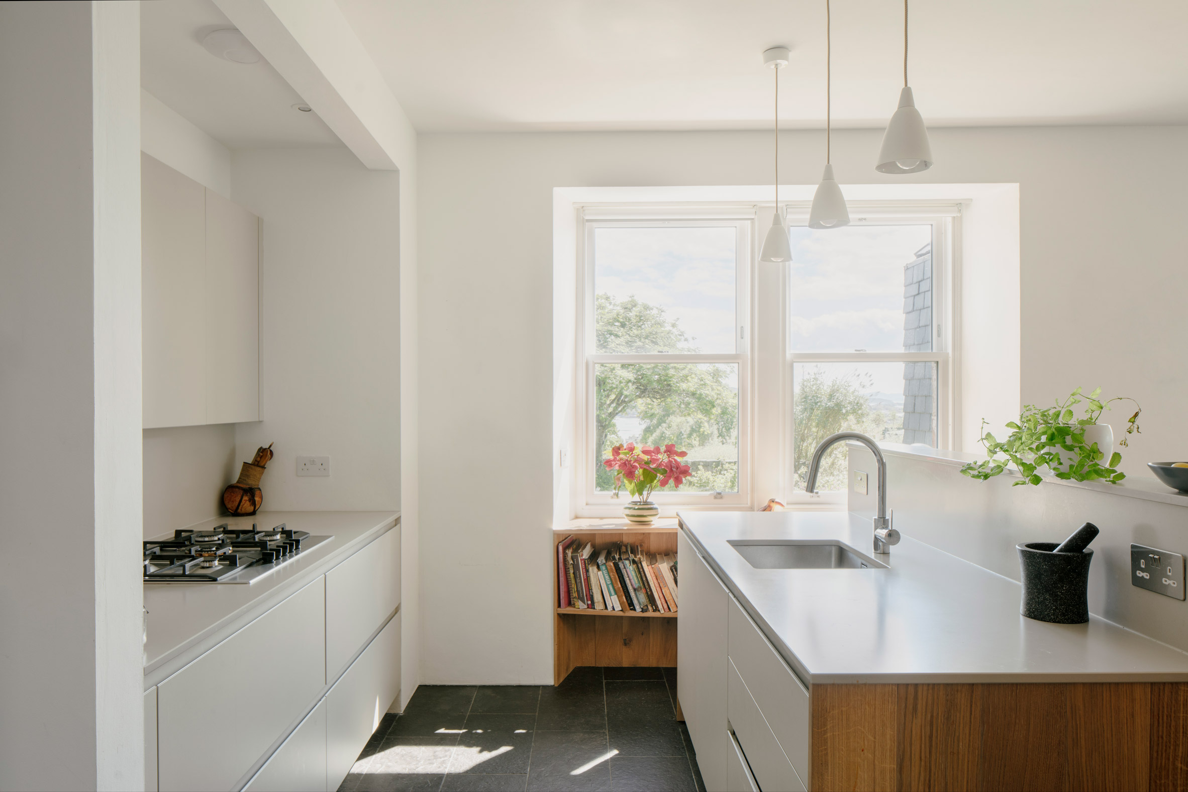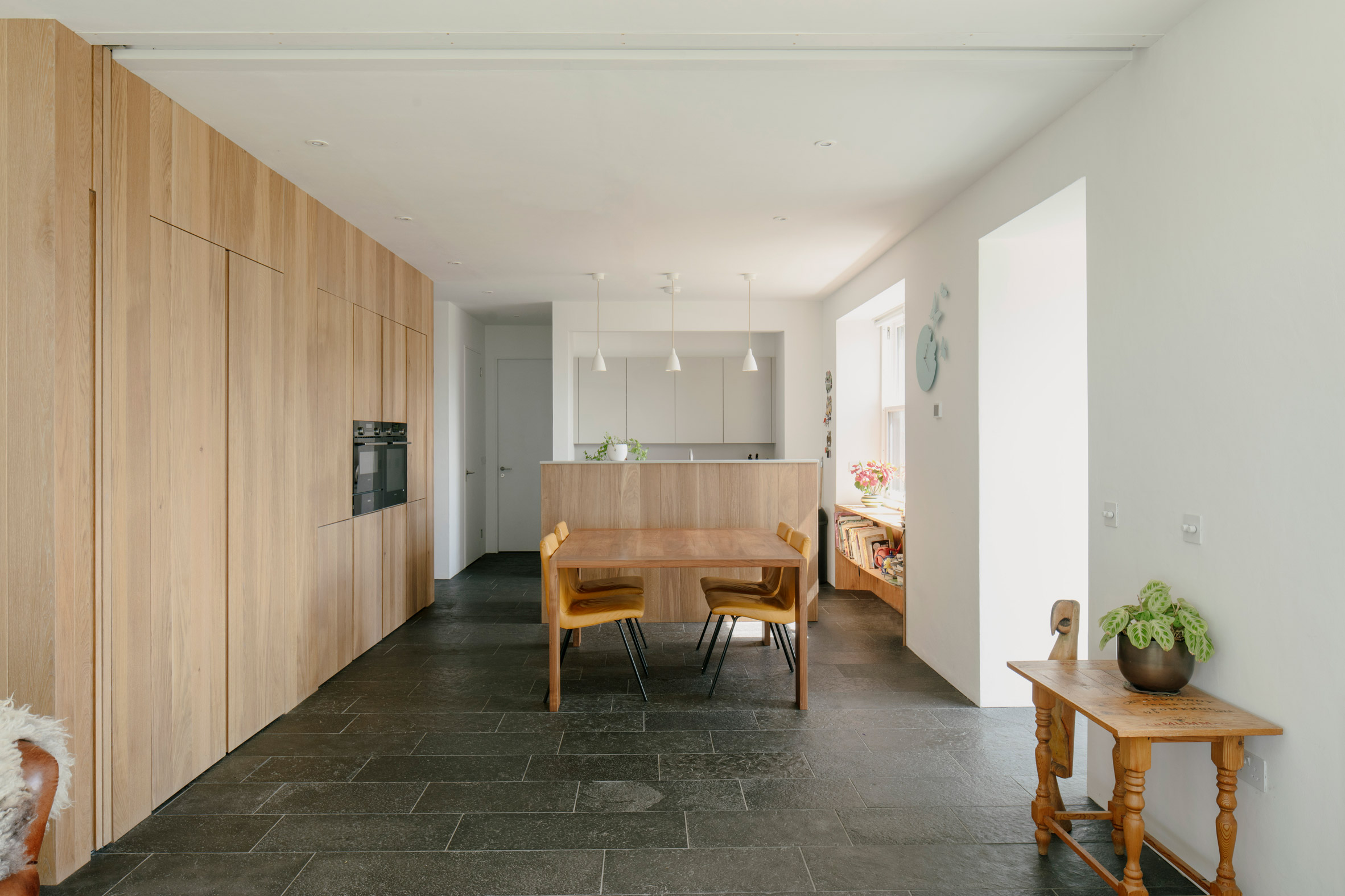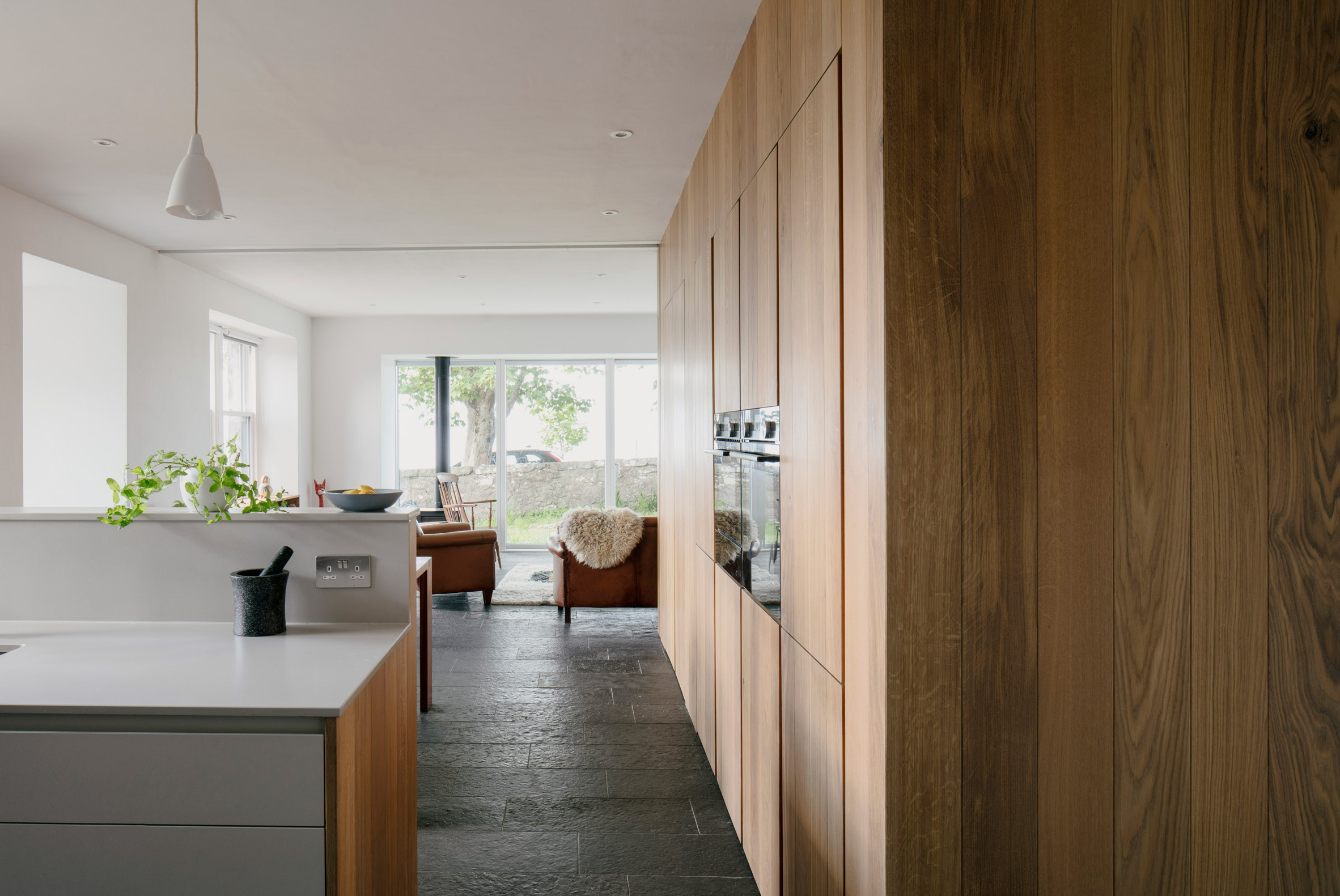 Ponieważ klient jest zapalonym kucharzem, kuchnia zajmuje centralne miejsce w Applecross Schoolhouse, obok salonu. Te dwie przestrzenie można połączyć za pomocą przesuwanej drewnianej ściany, podczas gdy nowy zestaw przesuwanych szklanych drzwi umieszczonych w wystającej bryle pokrytej łupkiem zapewnia dostęp do ogrodu.