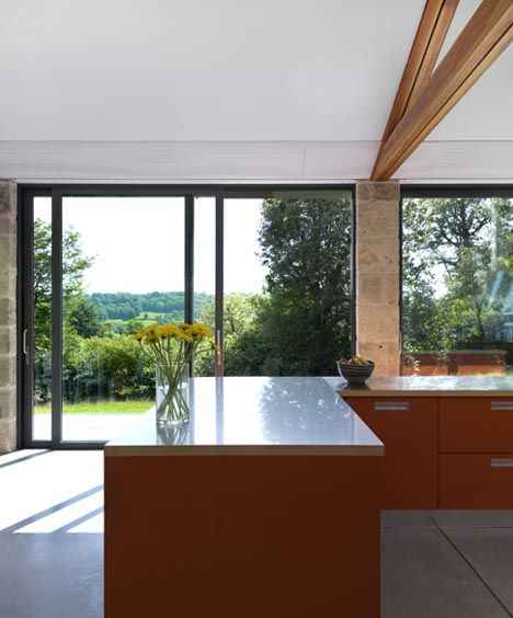 Kluczową rolę w projekcie odgrywa przeszklona ściana od strony południowej, która zalewa otwartą przestrzeń dzienną naturalnym światłem i otwiera wnętrze na panoramiczne widoki doliny oraz okolicznego krajobrazu. Salon stał się centralnym miejscem życia rodziny, podczas gdy sypialnia i łazienka zostały rozlokowane na dwóch poziomach po stronie wejścia, zapewniając większą prywatność. Całość stanowi przykład udanej rewitalizacji budynku poprzemysłowego, w której surowość dawnej architektury magazynowej została przełamana ciepłem drewna i współczesnymi rozwiązaniami przestrzennymi — charakterystycznymi dla domów inspirowanych estetyką nowoczesnej stodoły.