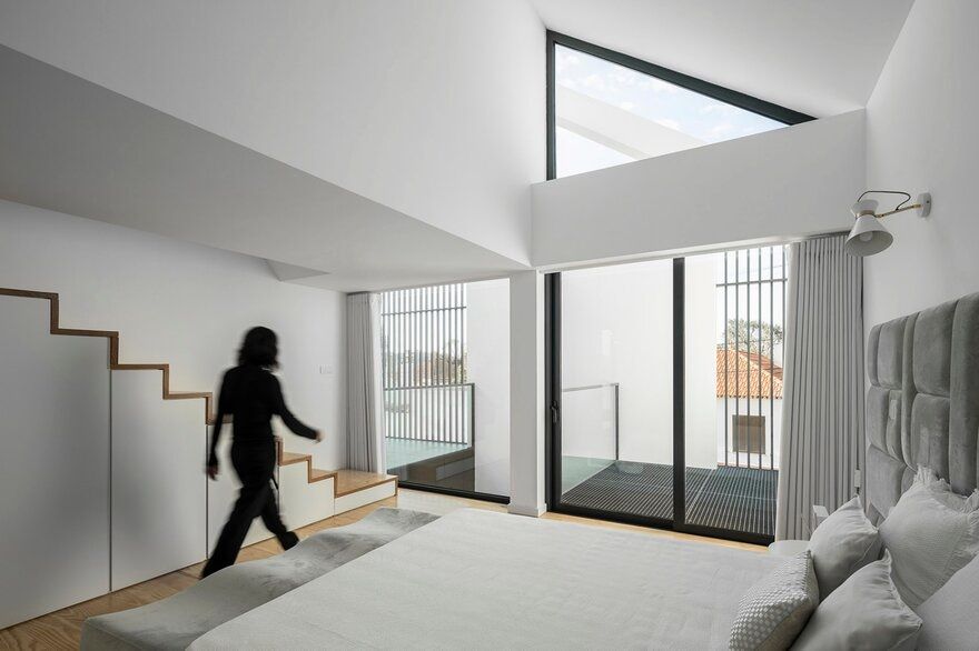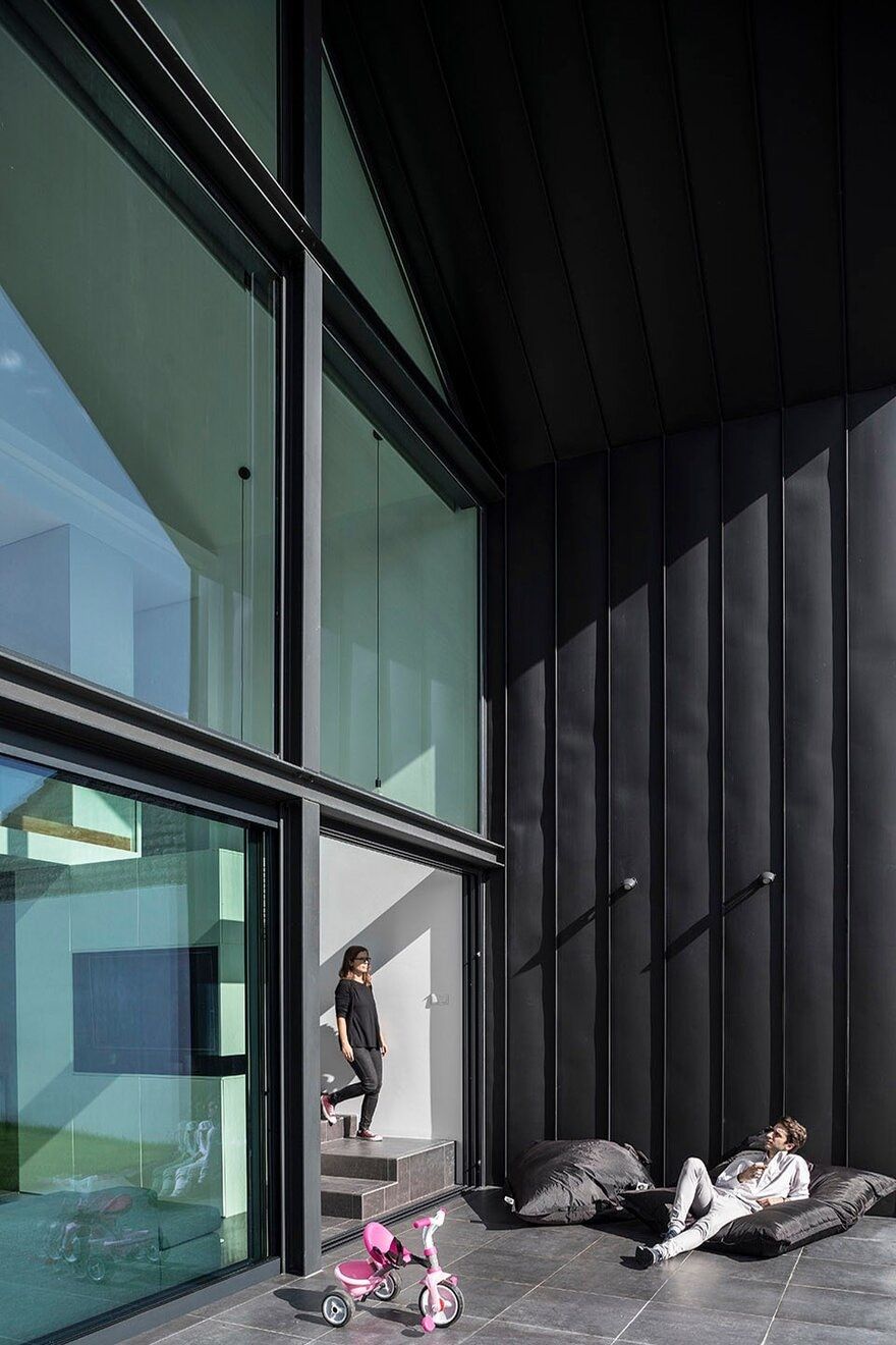 Główna fasada budynku naśladuje skalę i rytm sąsiednich obiektów, tworząc wizualną ciągłość zabudowy, a jednocześnie pozwala na swobodne przenikanie światła i widoków. Jej teatralny charakter stanowi jeden z kluczowych elementów projektu i definiuje jego tożsamość architektoniczną. Cofnięcie ściany szczytowej względem dachu i ścian bocznych umożliwiło stworzenie wewnętrznego patio – przestrzeni przejściowej, będącej symbolicznym „mostem” pomiędzy zewnętrzną, industrialną formą a bardziej intymnym światem wnętrza. To rozwiązanie wzmacnia relację domu z otoczeniem i podkreśla wielowarstwowość funkcjonalną budynku.
