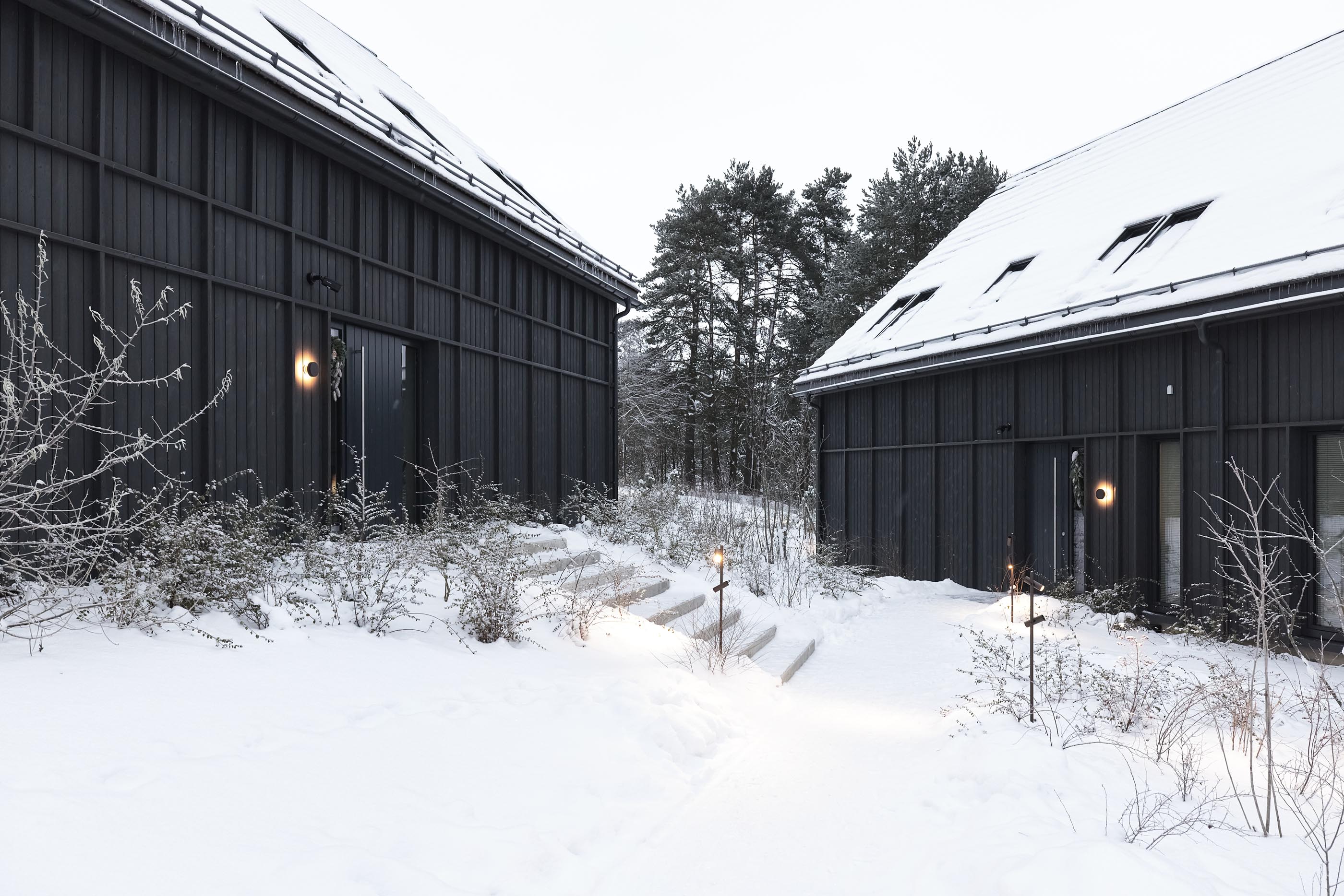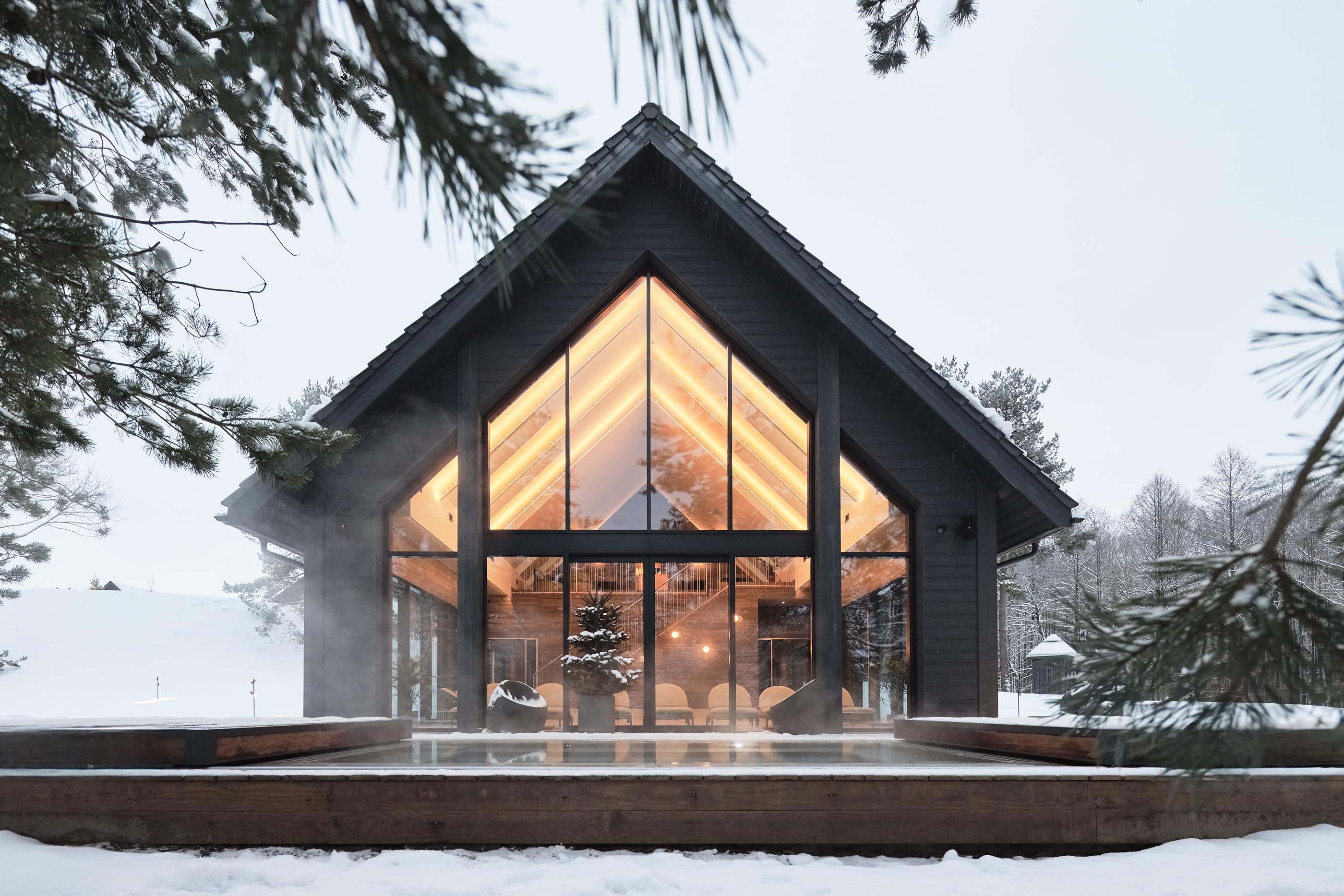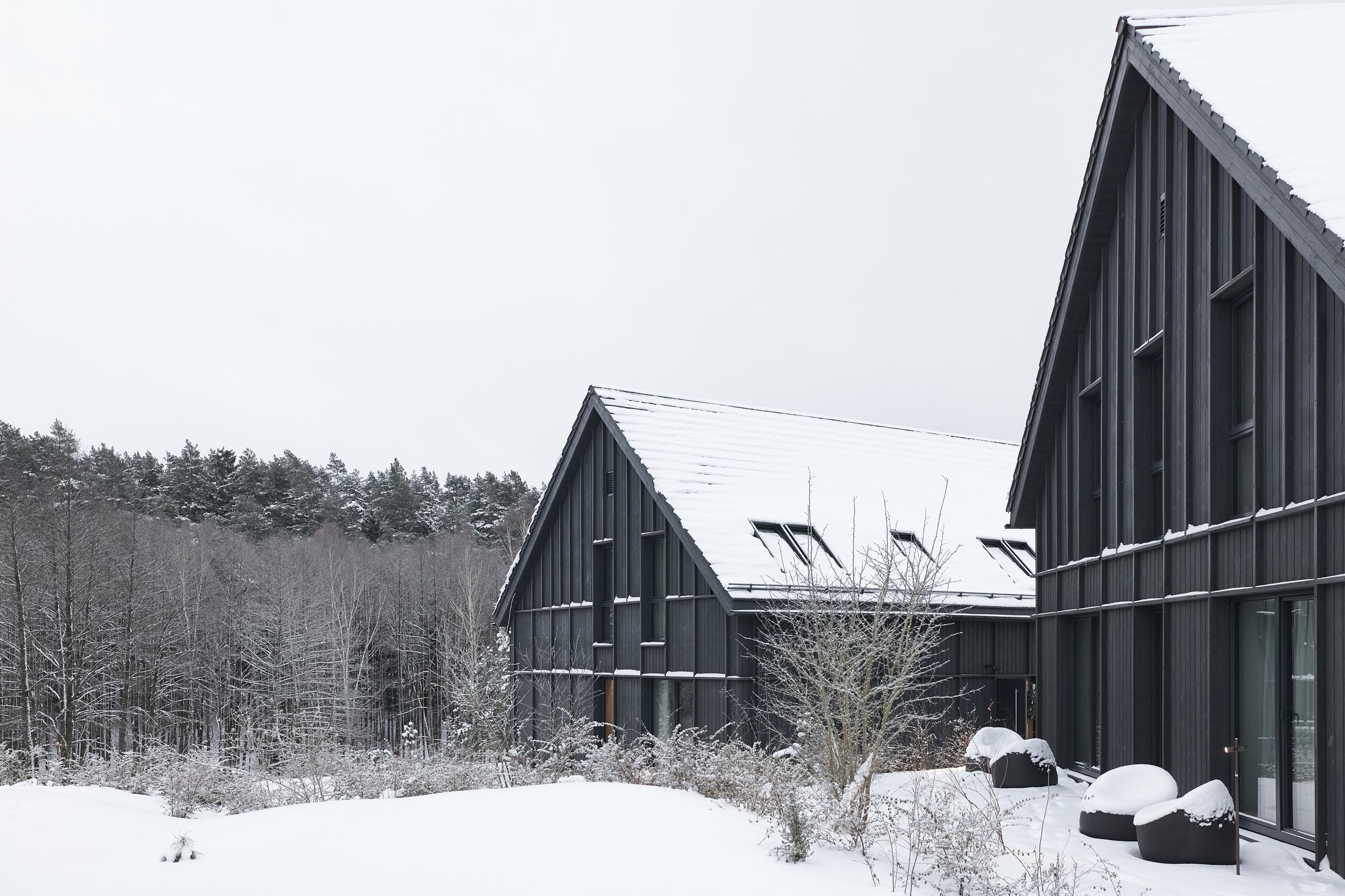 Rezydencja wellness & spa Aukštoji Liškiava została zaprojektowana jako spokojna, wyciszona forma zanurzona w naturalnym krajobrazie. Ciemna elewacja z drewna modyfikowanego termicznie sprawia, że bryła subtelnie wyłania się z otaczającego lasu, harmonizując z jego kolorystyką i strukturą. Kontrast pomiędzy ciepłem wnętrz a chłodnym, zimowym pejzażem podkreśla atmosferę miejsca - przestrzeni przeznaczonej do odpoczynku i kontaktu z naturą.