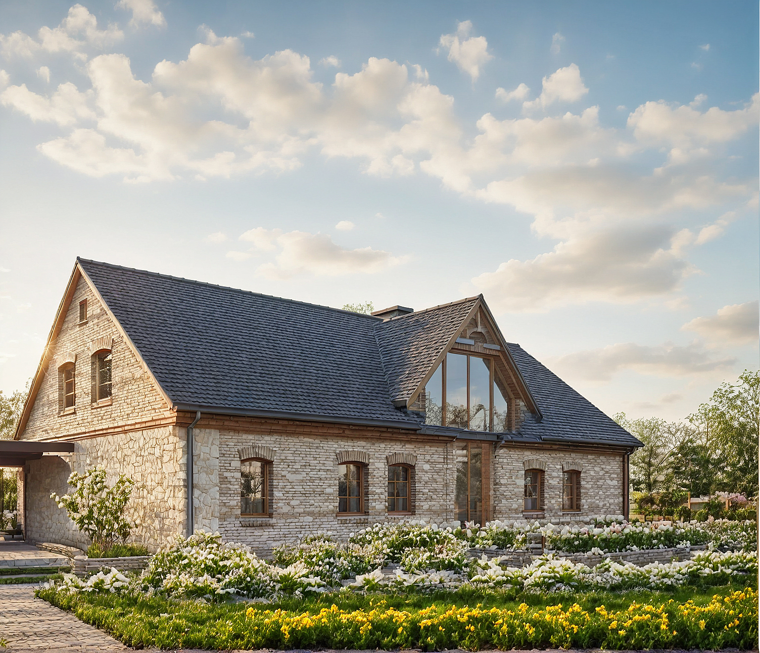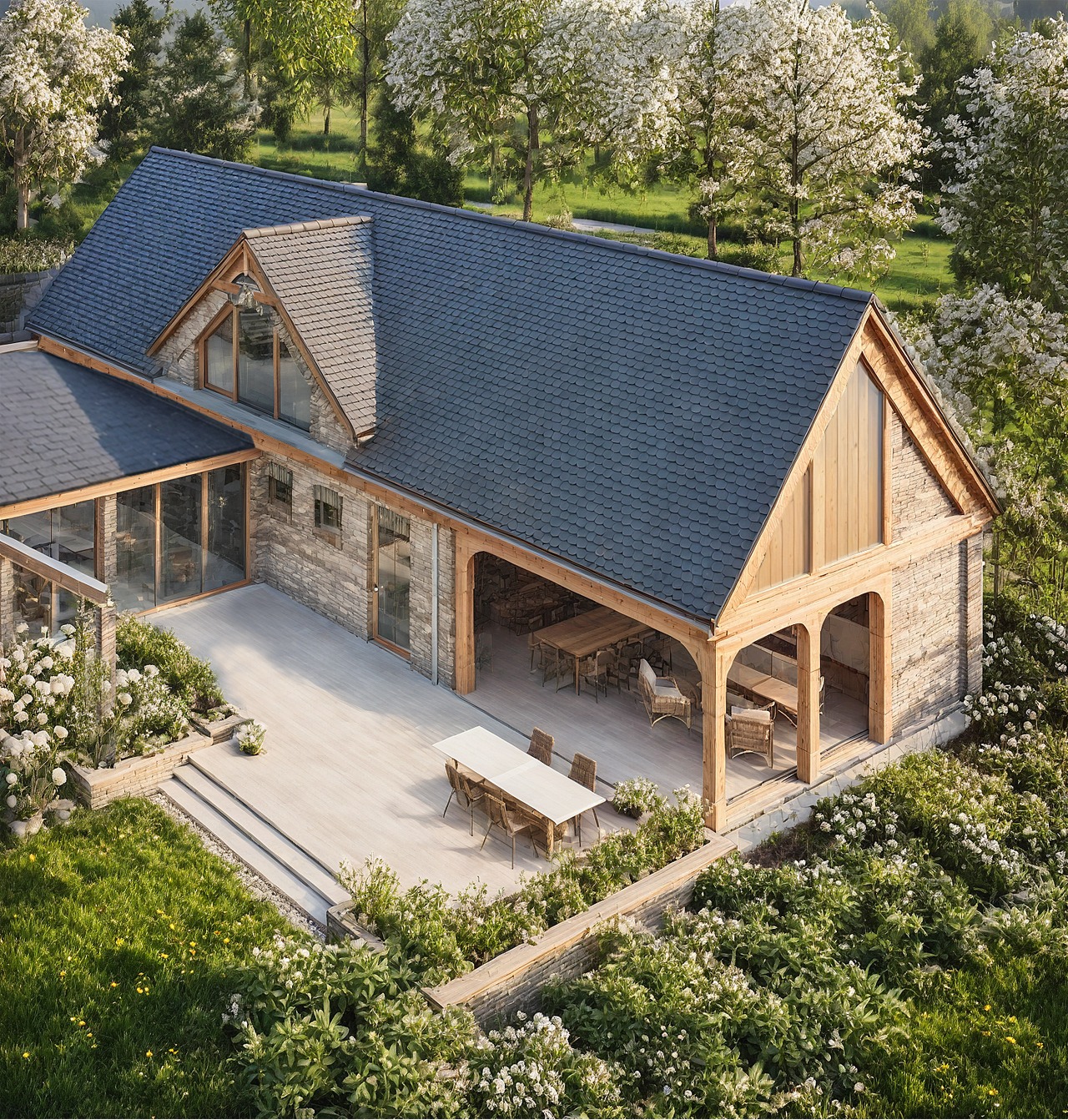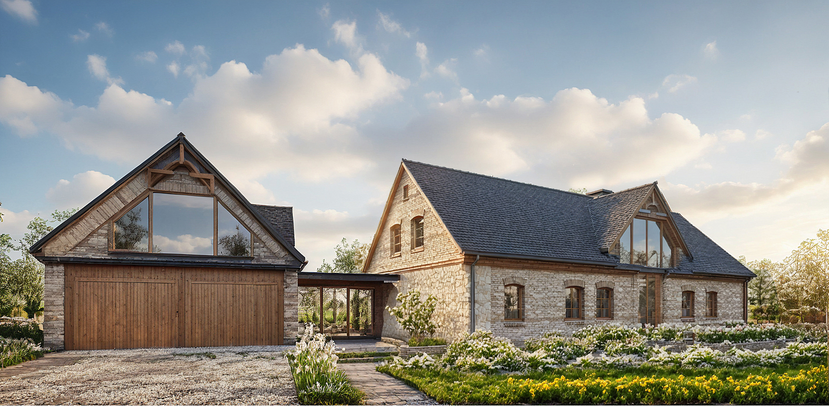 Bryła zyskała lekkość i harmonię dzięki połączeniu jasnego kamienia, cegły i łupka, a duże przeszklenia i drewniane akcenty dodają jej ciepła i nowoczesnego wyrazu. Obok głównego budynku powstała też strefa spotkań i odpoczynku – kuchnia letnia, zadaszony taras i część gospodarcza, dostępna przez cały rok.