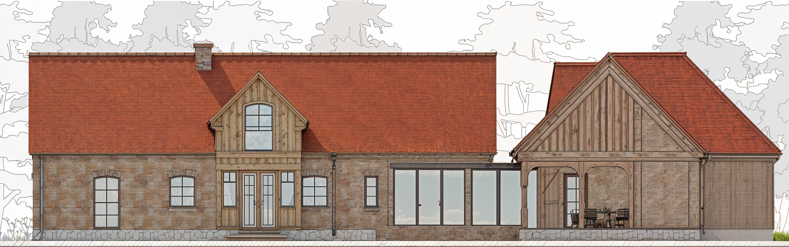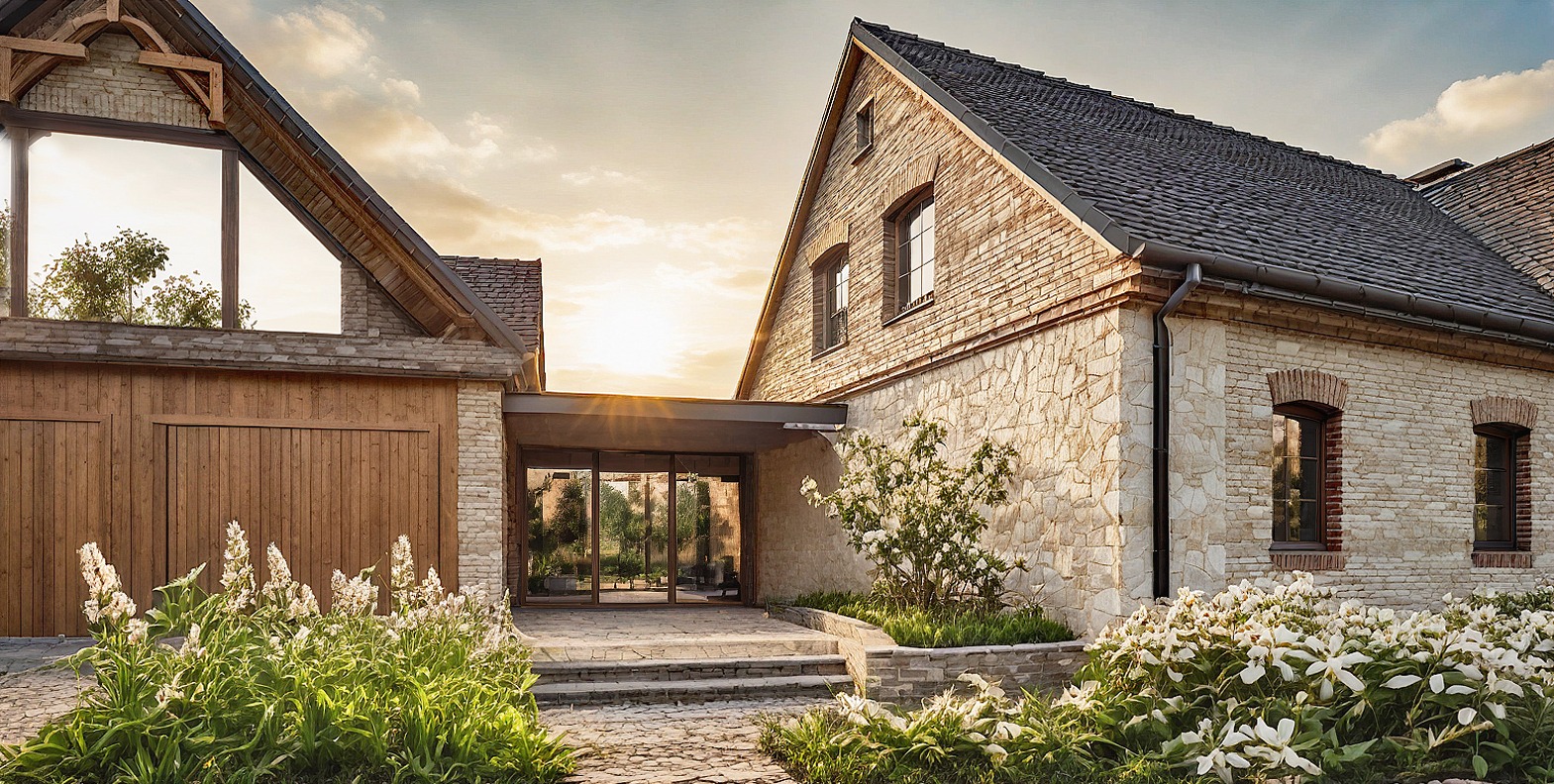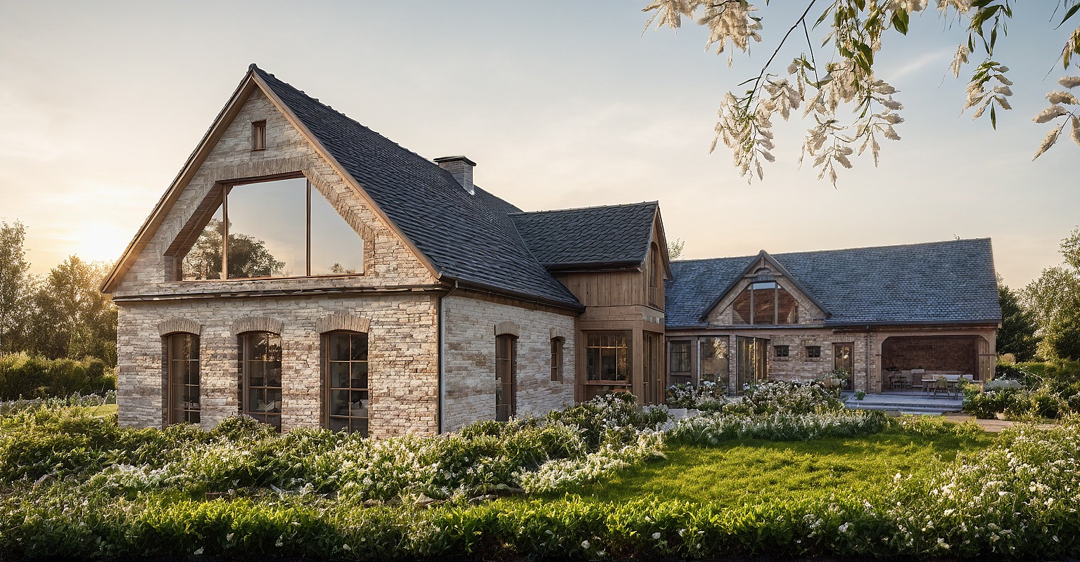 Bryła zyskała lekkość i harmonię dzięki połączeniu jasnego kamienia, cegły i łupka, a duże przeszklenia i drewniane akcenty dodają jej ciepła i nowoczesnego wyrazu. Obok głównego budynku powstała też strefa spotkań i odpoczynku – kuchnia letnia, zadaszony taras i część gospodarcza, dostępna przez cały rok.