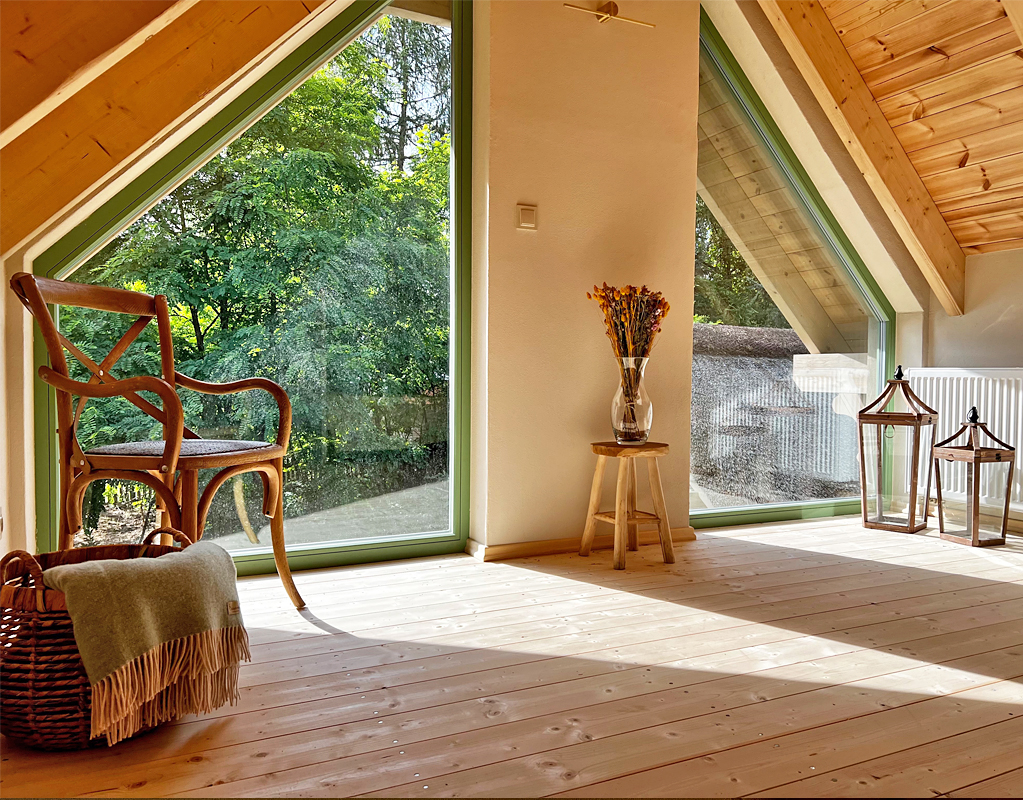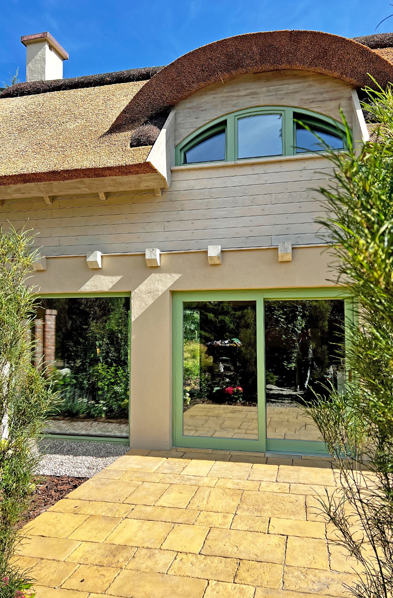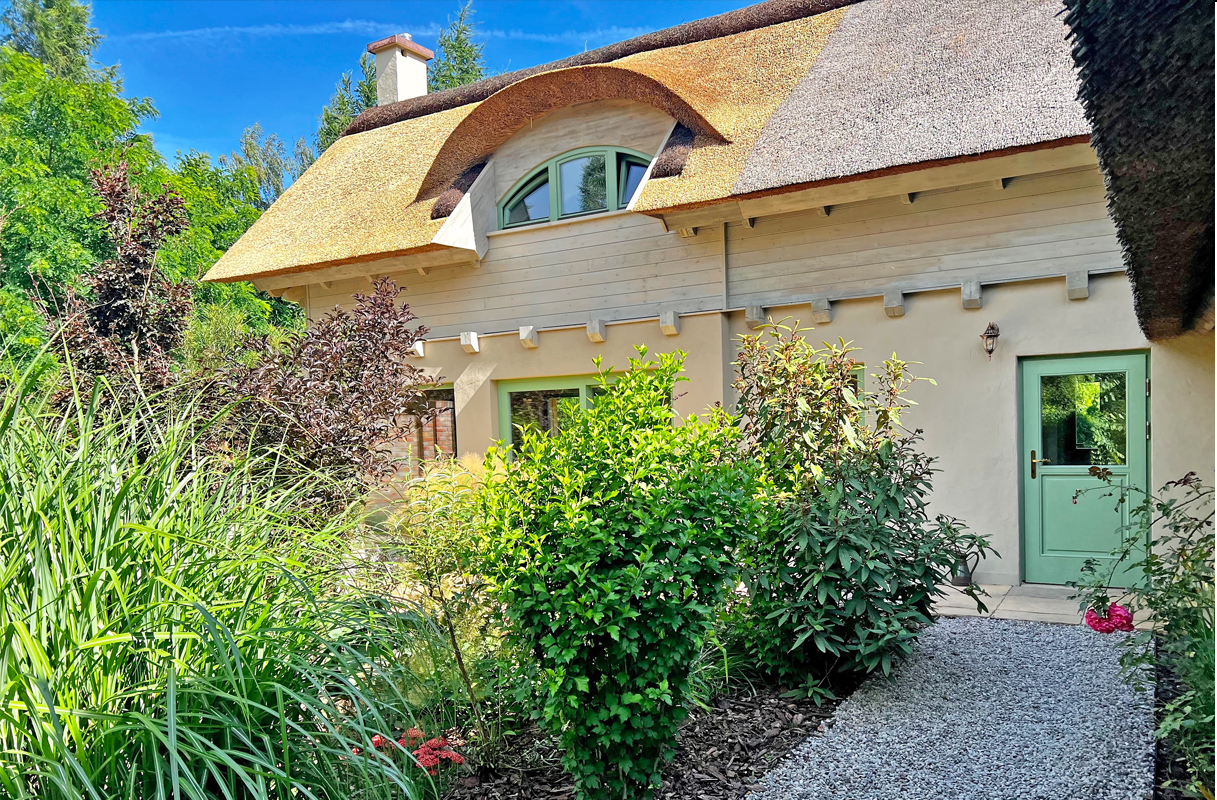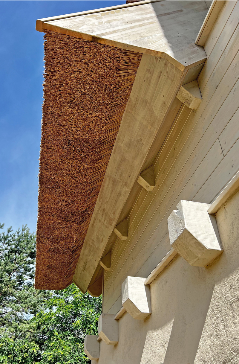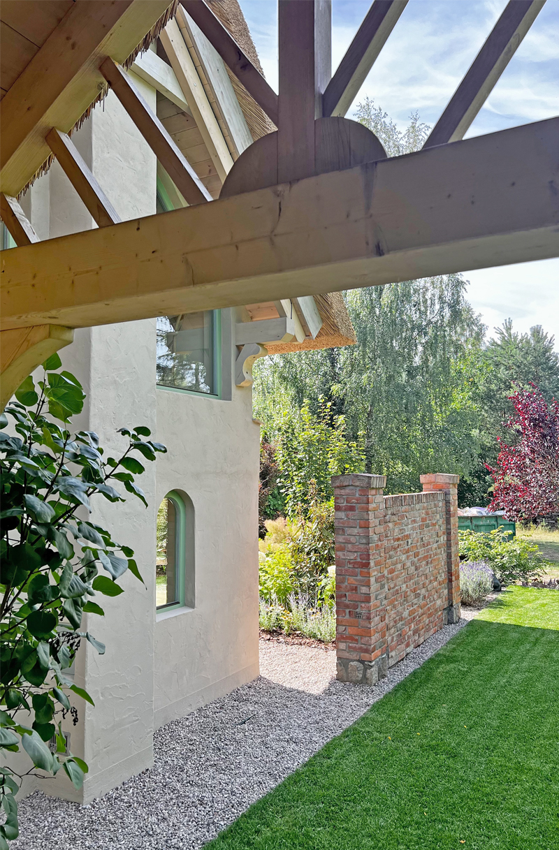 Elewacja została wykończona naturalnymi i przyjaznymi dla środowiska materiałami budowlanymi - szczotkowanym drewnem naturalnym, polnym kamieniem i ręcznie nakładanym tynkiem cementowo wapiennym. Jasny kolor elewacji, drewna i jasnozielone okna współgrają z trzcinowym dachem.