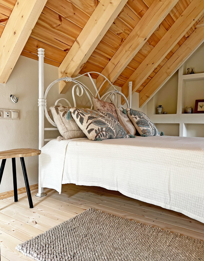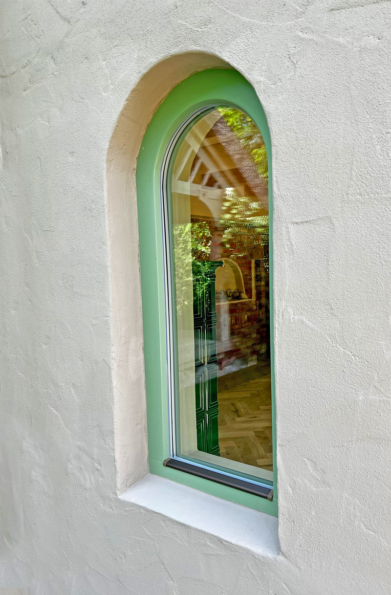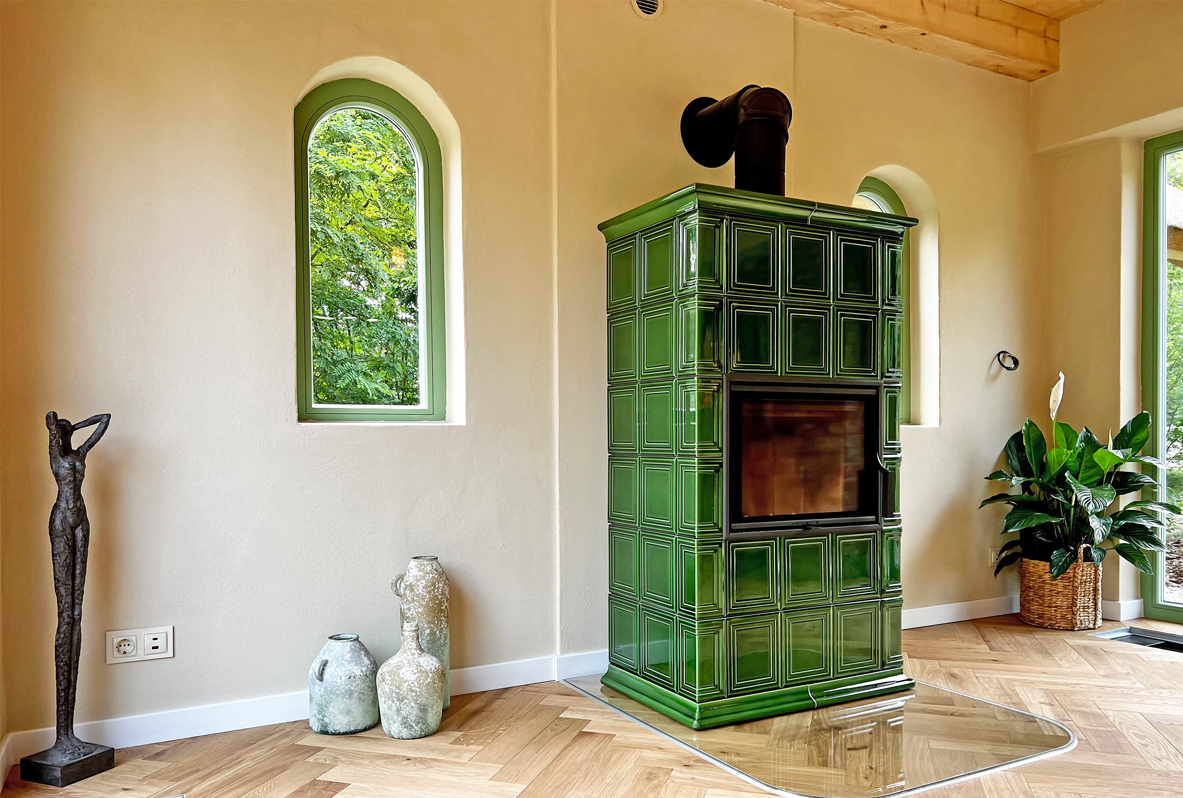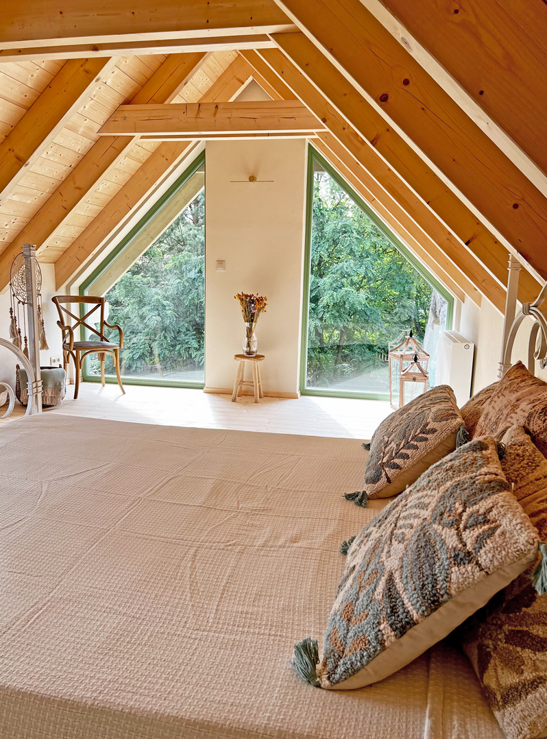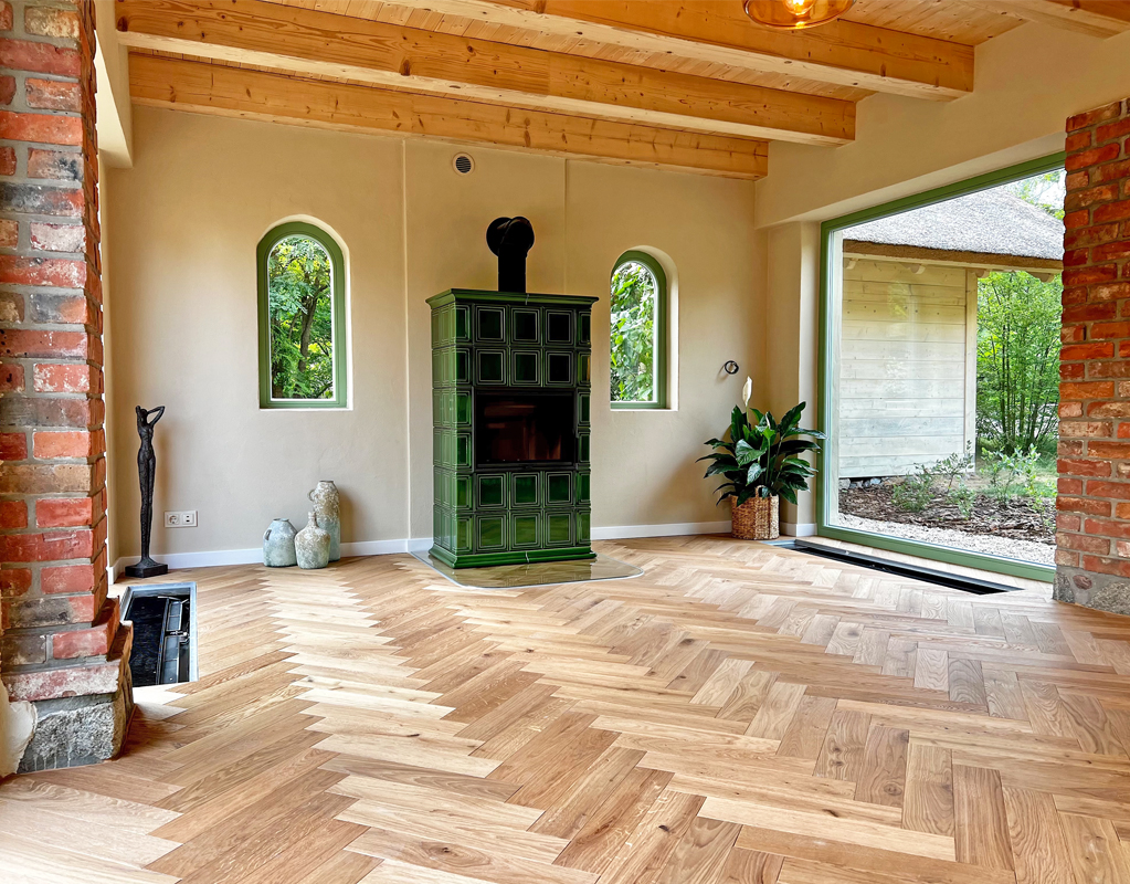 Elewacja została wykończona naturalnymi i przyjaznymi dla środowiska materiałami budowlanymi - szczotkowanym drewnem naturalnym, polnym kamieniem i ręcznie nakładanym tynkiem cementowo wapiennym. Jasny kolor elewacji, drewna i jasnozielone okna współgrają z trzcinowym dachem.