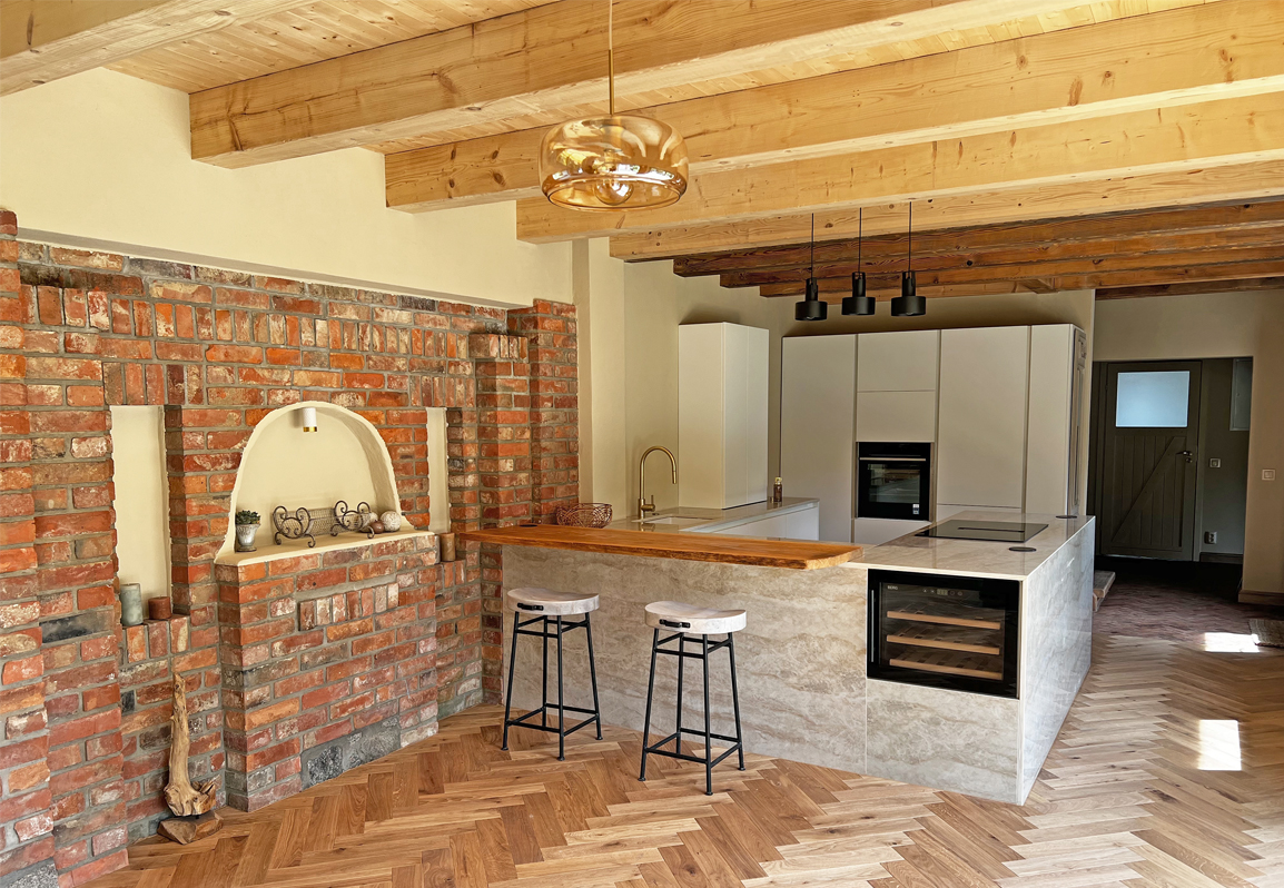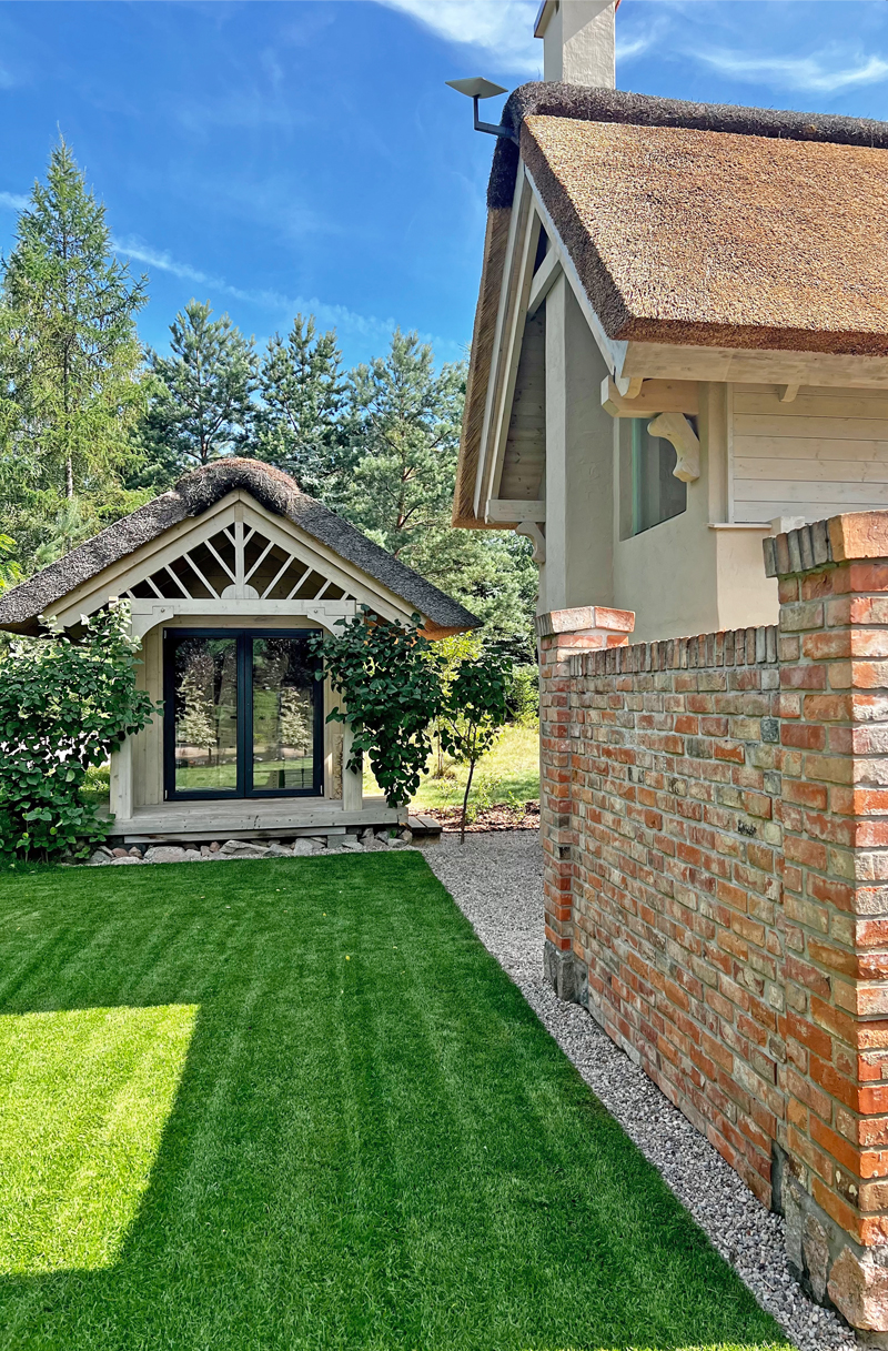Zaprojektowany i wybudowany przez nas dom łączy ciepło tradycji z nowoczesnym komfortem. Drewno, strzecha, umiar, tradycja i szereg rozwiązań przyjaznych środowisku były głównymi wartościami przy wykonywaniu szczegółowego projekt architektonicznego, projekt aranżacji wnętrz oraz ogrodu wraz z kompleksową realizacją budowlaną i wykonawczą.