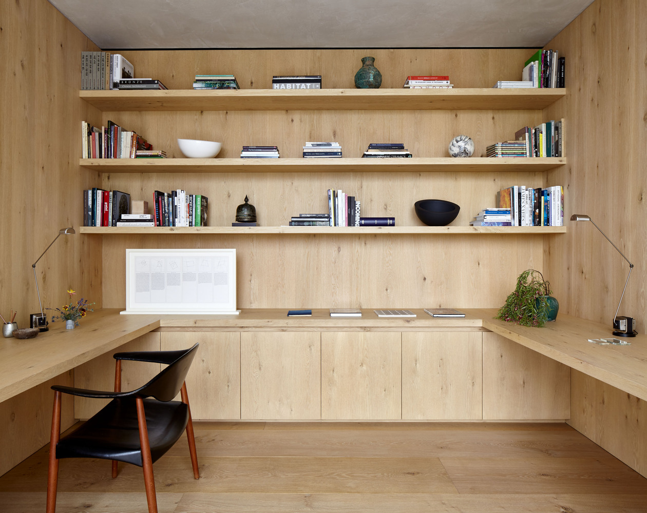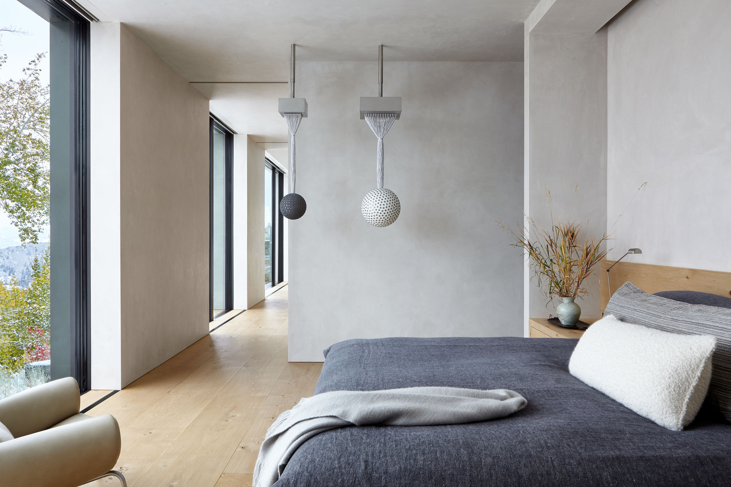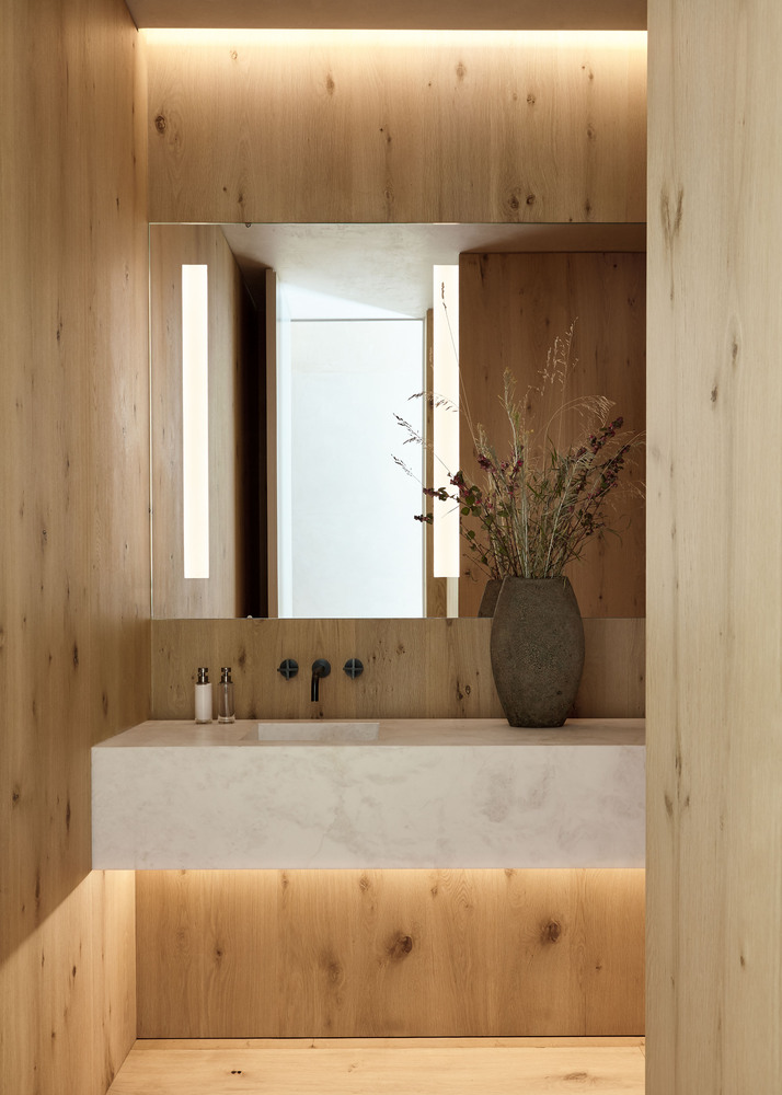 Elewacje wykończono deskami z drewna opalanego shou-sugi-ban, a oszczędnie rozmieszczone przeszklenia tworzą rytm, który „uspokaja” formę. Wnętrza buduje naturalna paleta: dąb, tynk, kamień i beton – materiały o przyjemnej taktylności, starannie zestrojone i precyzyjnie zlicowane.