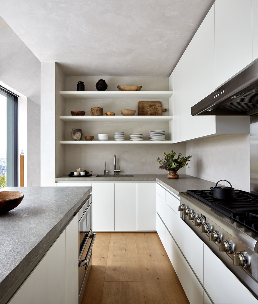 Powściągliwość palety uwydatnia fakturę materiałów i proporcje. Cienkie stalowe ramy, jasne drewno i honowane kamienie „niosą” światło, a precyzja łączeń porządkuje tło dla sztuki. Nic tu nie krzyczy – klimat budują tekstura, ton i rytm.