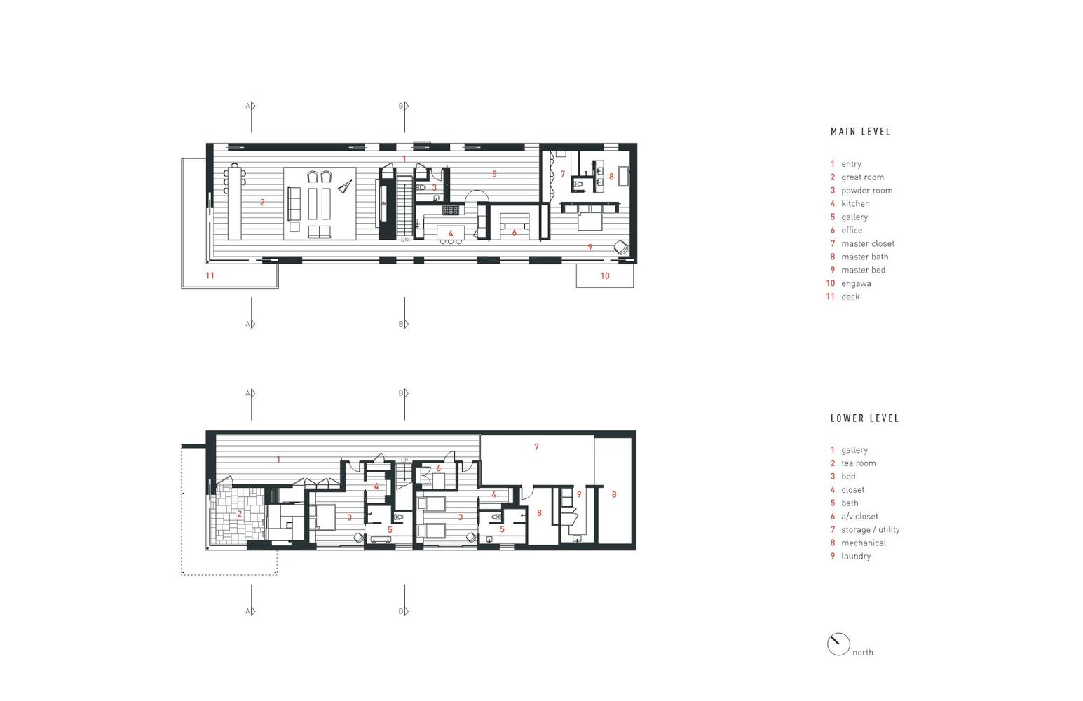 Kulminacją jest tea room – współczesna interpretacja japońskiej herbaciarni, ukryta za dyskretnymi drzwiami przy dolnej galerii wideo. Dwa wejścia – dla mistrza herbaty i gości – oraz duże, narożne drzwi przesuwne otwierające się na ogród dopełniają doświadczenie spokoju i uważności.