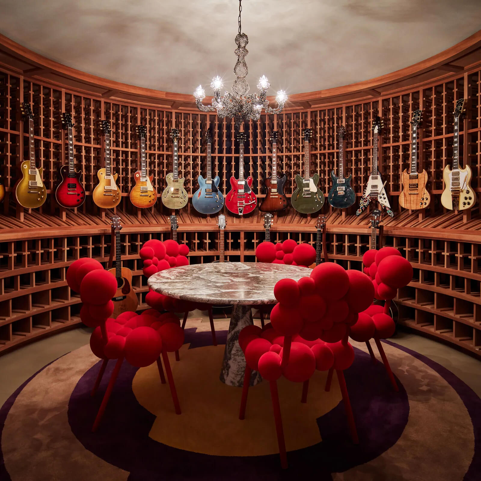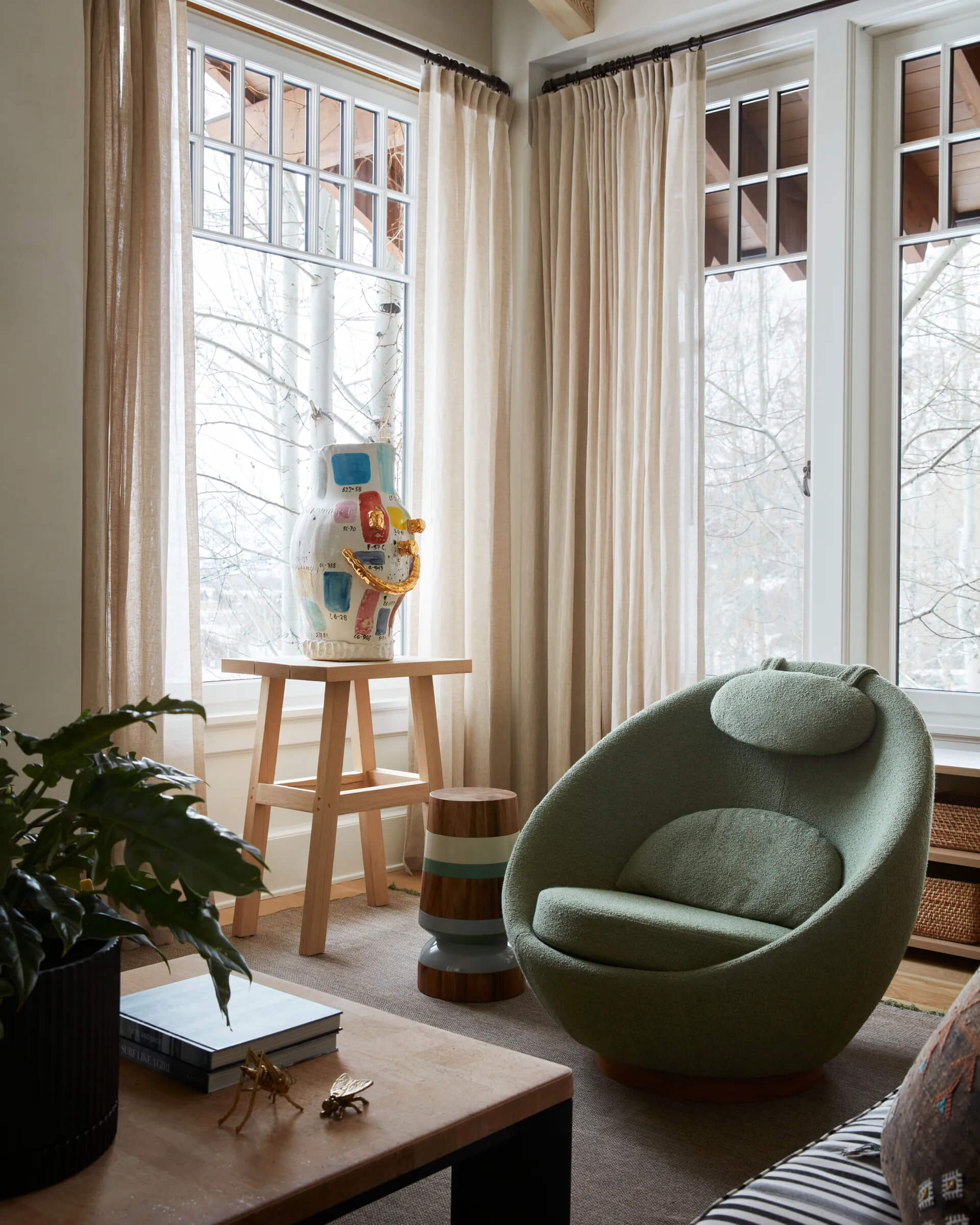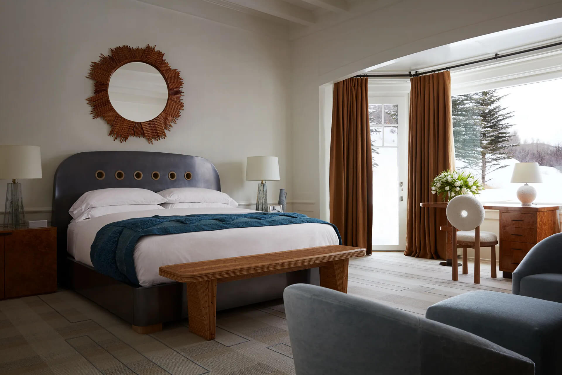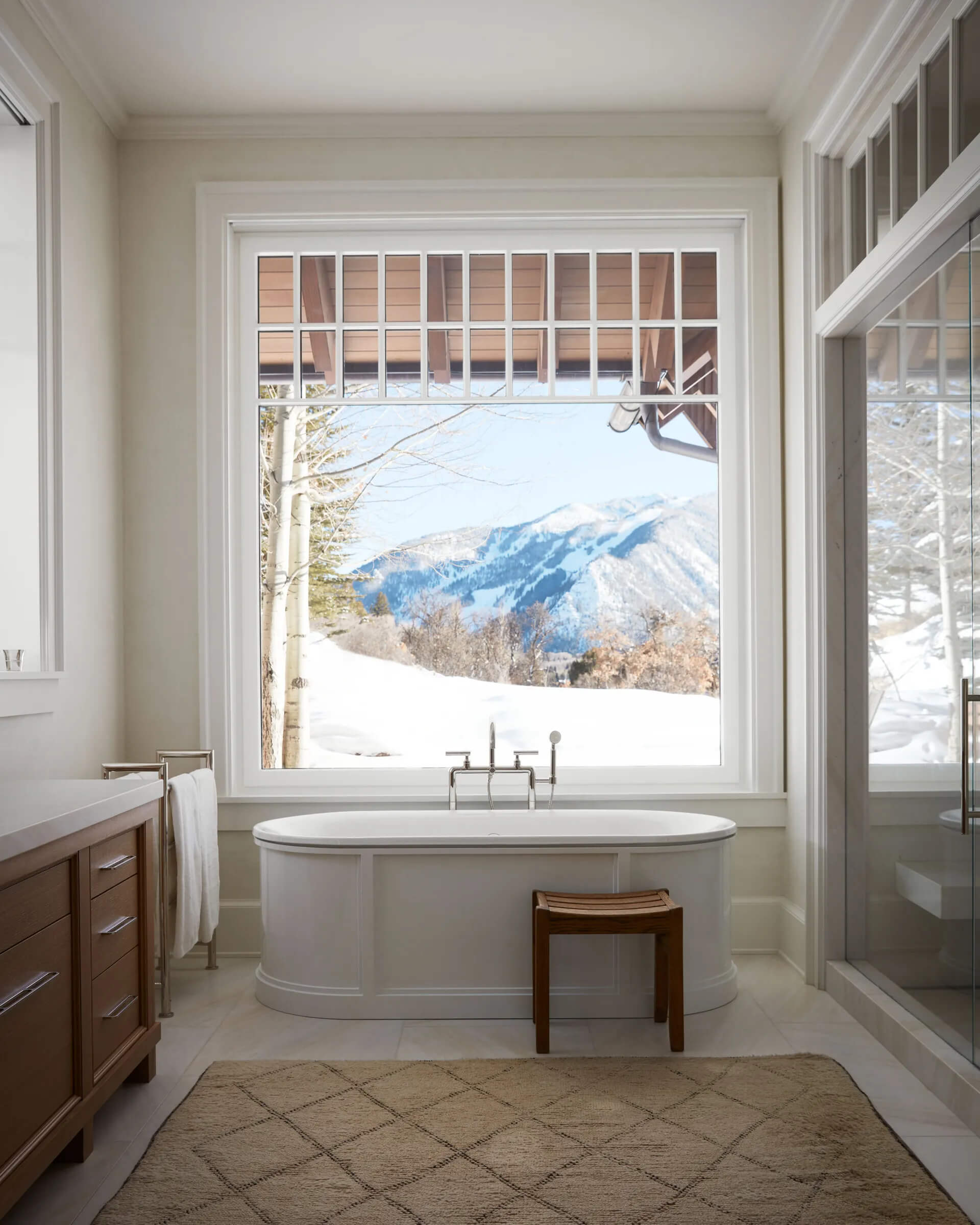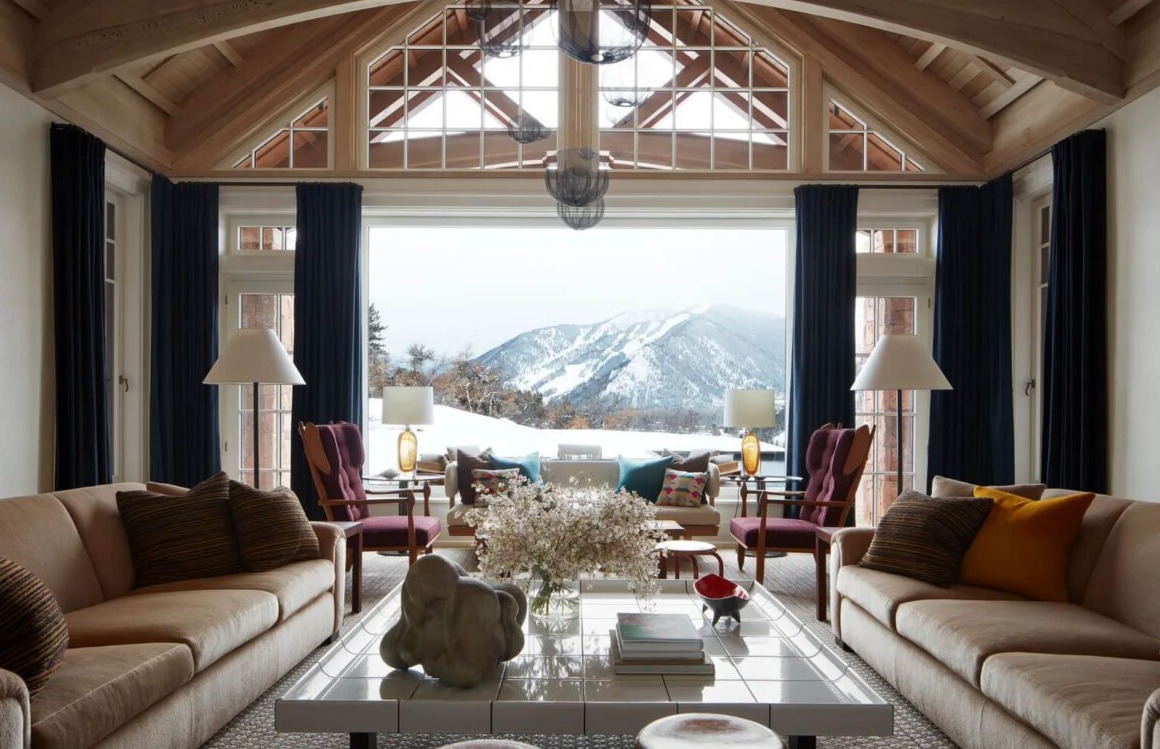 Lokalizacja była kluczowa – dom znajdował się w otoczeniu górskiego krajobrazu, zapewniając zarówno prywatność, jak i łatwy dostęp do atrakcji Aspen. Posiadłość wymagała jedynie odświeżenia wnętrz – pozostała część spełniała wszystkie oczekiwania. Projekt wnętrza powierzono renomowanemu projektantowi Shawnowi Hendersonowi, który doskonale zrozumiał wizję właścicieli. „Sara miała jasno określony styl – naturalność, elegancję i funkcjonalność” – mówi Henderson. Dzięki tej współpracy udało się stworzyć nowoczesne, ale przytulne wnętrze.