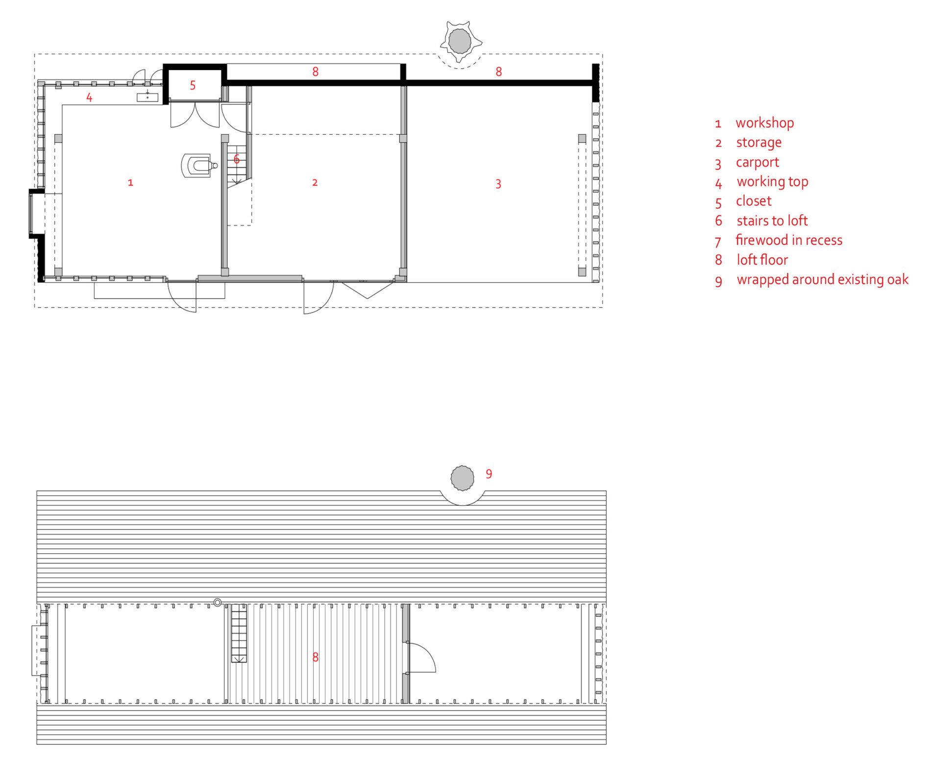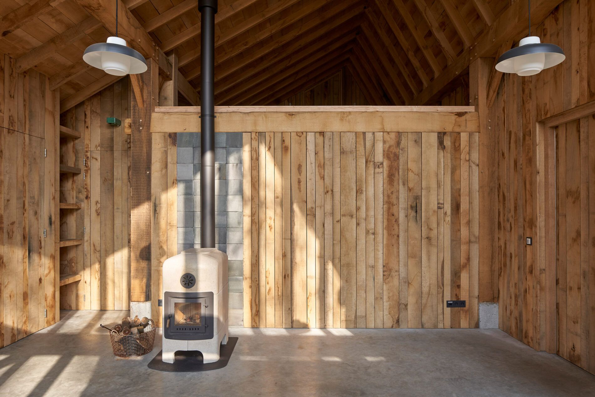 Drewno, beton i szkło to jedyne materiały wykorzystane w tym projekcie. Duże okna zapewniają wnętrzu sporą ilość światła, jednocześnie otwierając warsztat na widoki na otaczającą go posiadłość. Drewniane słupki okienne narzucają pionowy rytm, który podkreślają też krokwie dachowe. Betonowy piecyk ustawiono przy ścianie z pionowo ułożonych desek, za którymi kryją się schody prowadzące na wyższy poziom.