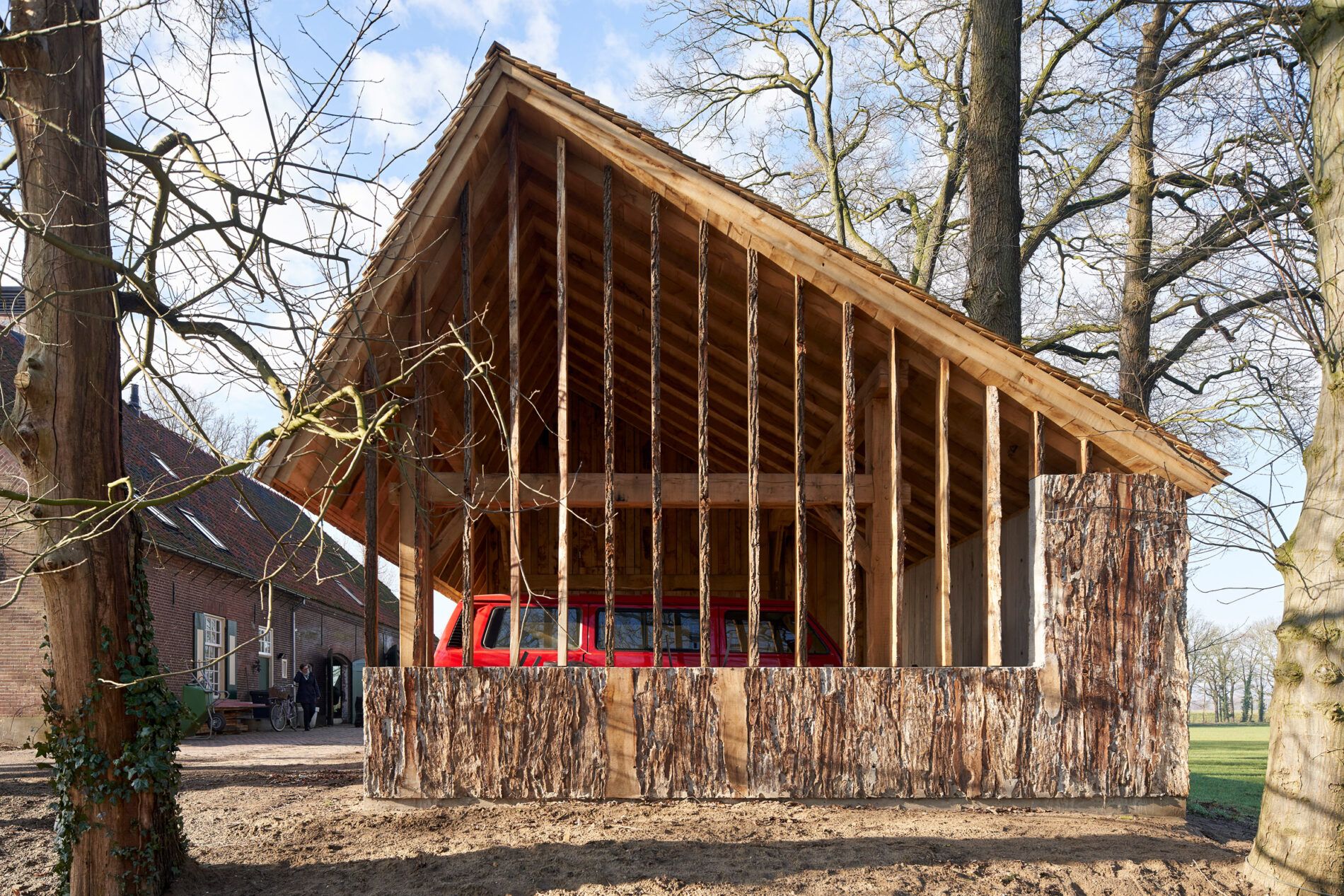 Architekci stworzyli stodołę, kiedy okazało się, że kilka stuletnich dębów, stojących na ich działce w regionie Meierij w Holandii, wymaga ścięcia. Na działce działa już studio firmy, które urządzono w odnowionym, wiejskim domu. Architekci nie chcieli sprzedawać drewna do wytwórni papieru i postanowili wykorzystać je do budowy własnej stodoły w tradycyjnym, rodzimym stylu tego regionu. „Zastępując szereg niepotrzebnych, starych szop, chcieliśmy zbudować nową stodołę z lokalnie pozyskanych materiałów, stosując tradycyjne techniki zgodne z charakterem naszej farmy”.