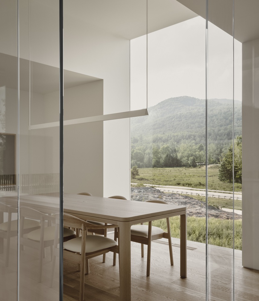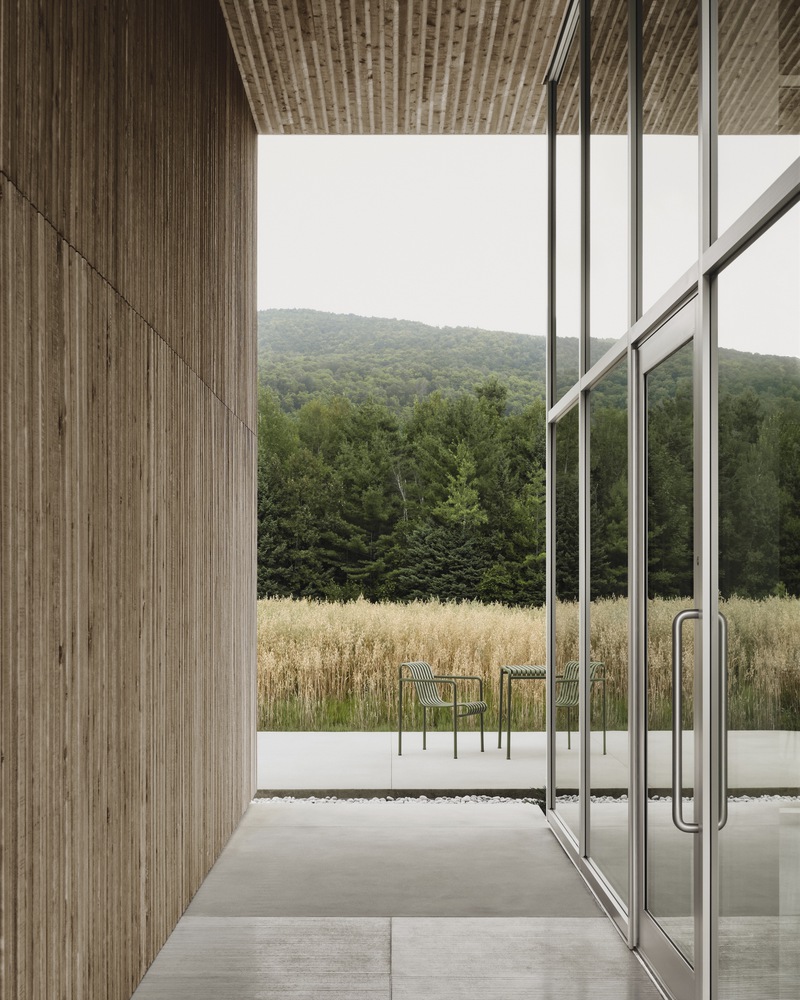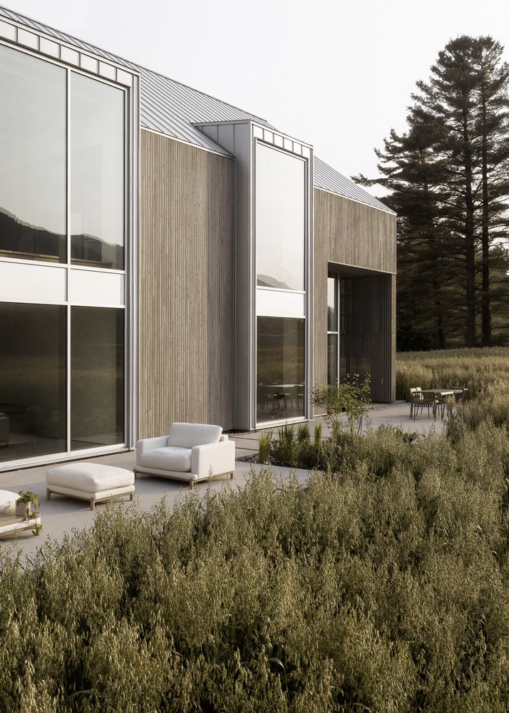 Elewacje zostały pokryte surowym białym cedrem, pozostawionym bez impregnacji – z czasem drewno przyjmie naturalną srebrzystą patynę, harmonizując z otoczeniem i podkreślając ideę budynku, który „starzeje się” z krajobrazem.