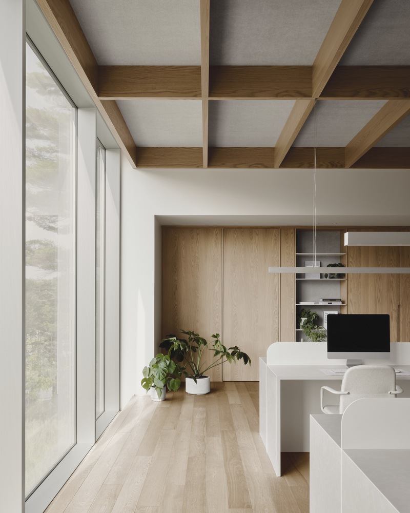 Wnętrze budynku łączy w sobie przestronność z kameralnością. Na parterze, pełniącym obecnie funkcję showroomu, dominuje otwartość i możliwość dostosowania układu do zmieniających się potrzeb – w przyszłości przestrzeń ta może zostać zaadaptowana jako dodatkowa część biurowa. Na piętrze znajdują się pracownie twórcze – ciepłe w odbiorze dzięki zastosowaniu elementów z dębu, sklejki brzozowej i tkanin. Centralnym punktem jest rzeźbiarska klatka schodowa wykonana z giętej stali, przykryta dębowymi stopniami.