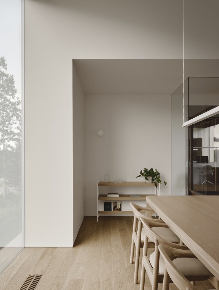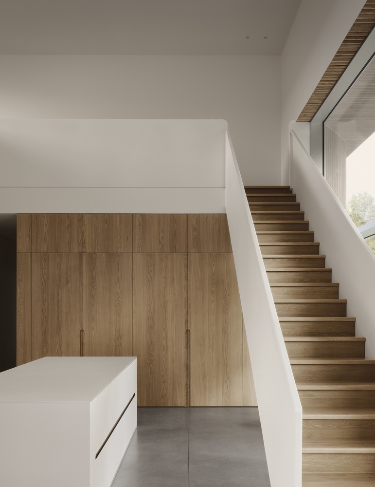 Światło dzienne odegrało kluczową rolę w kształtowaniu architektury. Projektanci potraktowali je jako żywy materiał – zmienny i wpływający na atmosferę przestrzeni. Elewacja południowa otrzymała cofniętą szklaną ścianę, która pełni funkcję bufora termicznego – latem chroni przed przegrzaniem, zimą wspiera pasywne zyski ciepła. Od zachodu zastosowano zewnętrzne drewniane żaluzje, które filtrują światło popołudniowe i tworzą przyjemny półcień bez rezygnacji z widoku.