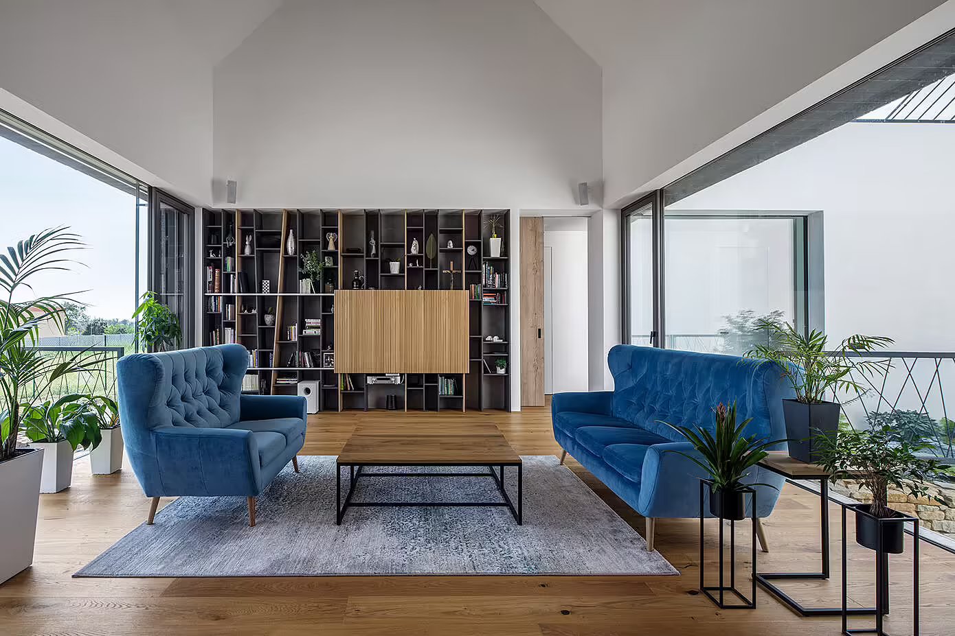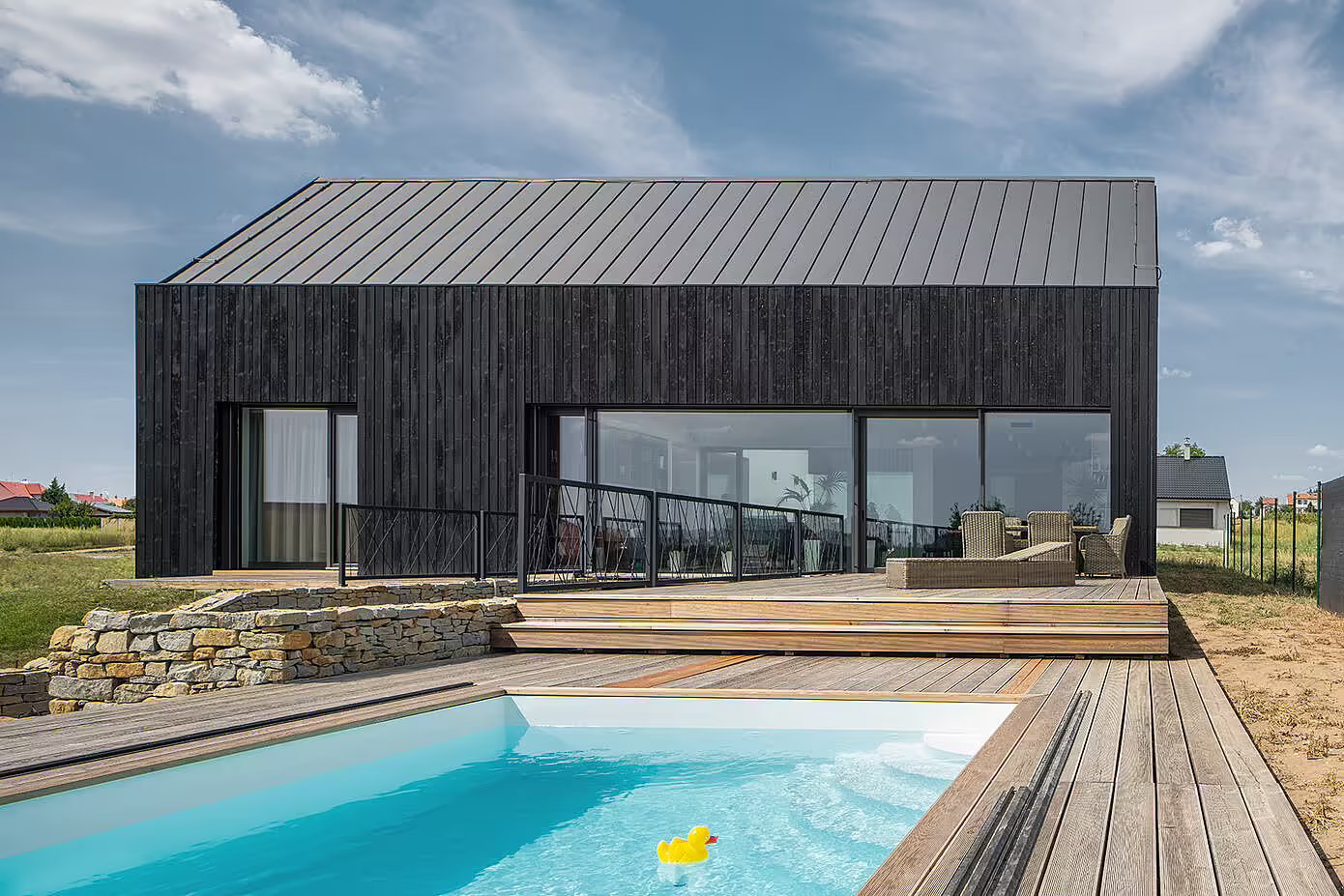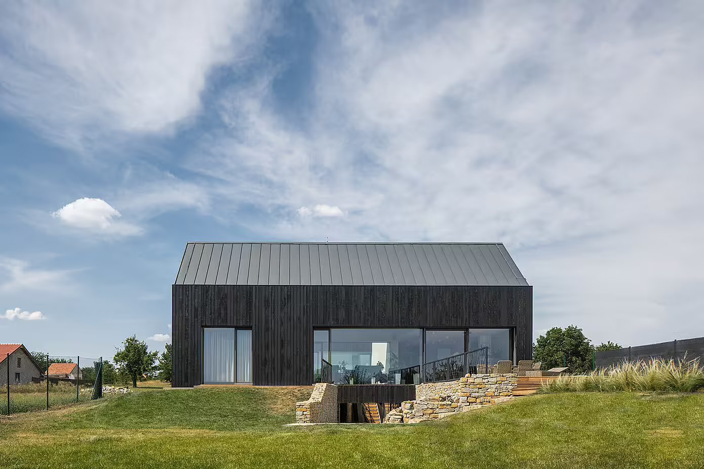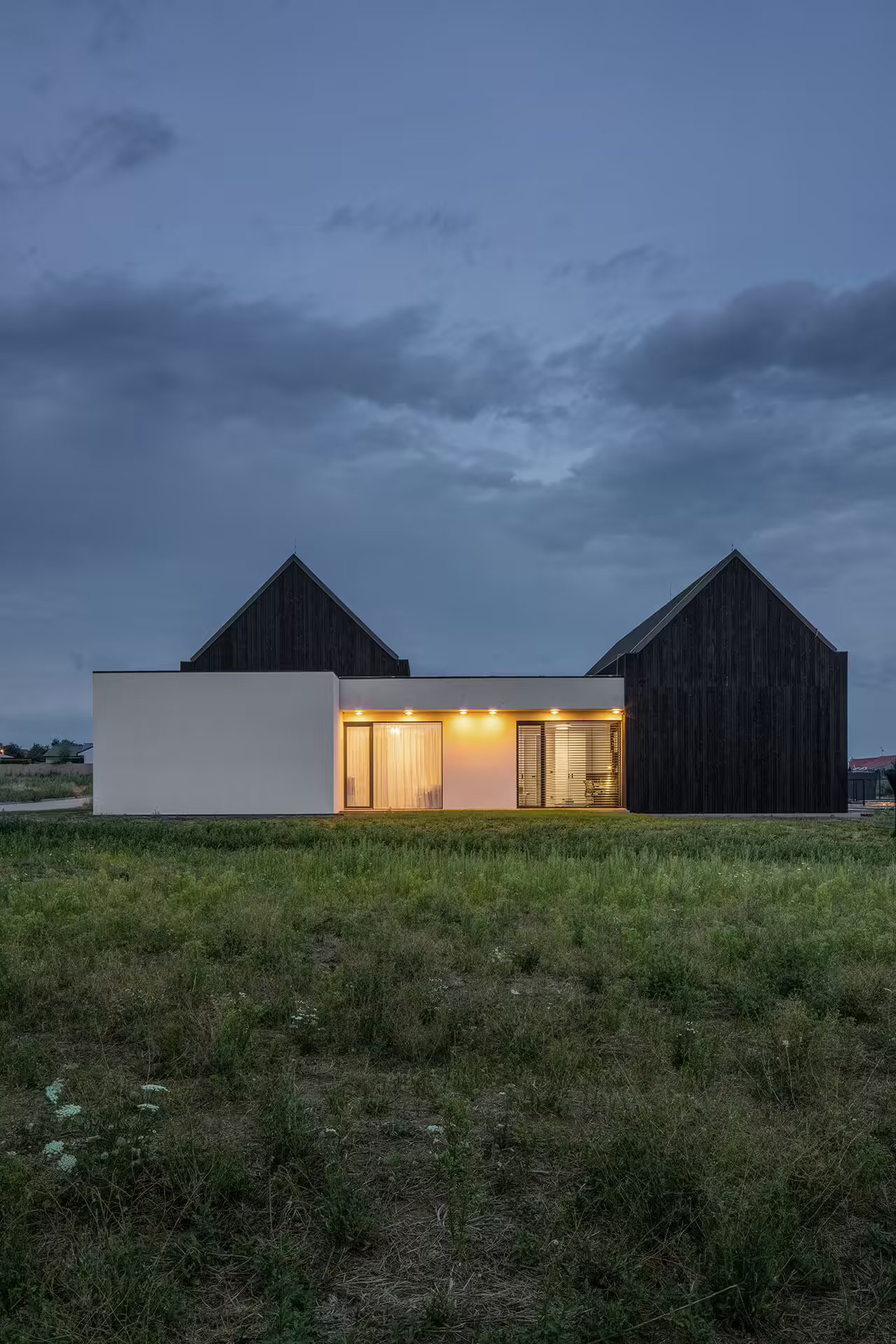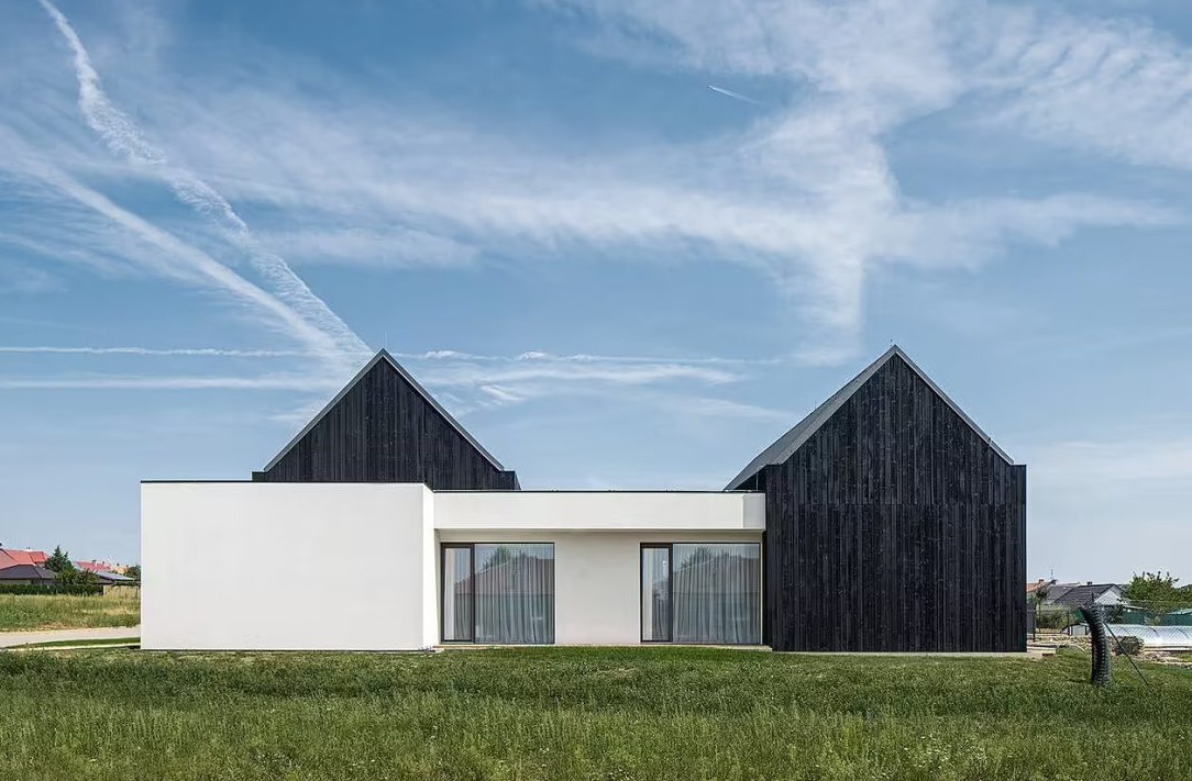 Nowoczesna interpretacja wiejskiej architektury jednorodzinnej w rozwijającej się części małej wsi to dom o zwartej bryle i wewnętrznym dziedzińcu. Projekt bazuje na formie dwóch jednopiętrowych brył, które przywołują tradycyjne domy atrialne i nawiązują do archetypicznej wiejskiej zabudowy. Całość tworzy kompaktowy układ z wewnętrznym patio, który zapewnia prywatność i komfort życia. Architekci podkreślają, że zależało im na stworzeniu parafrazy klasycznej zagrody – z przestrzenią wewnętrzną otwierającą się na ogród, ale ukrytą przed otoczeniem.