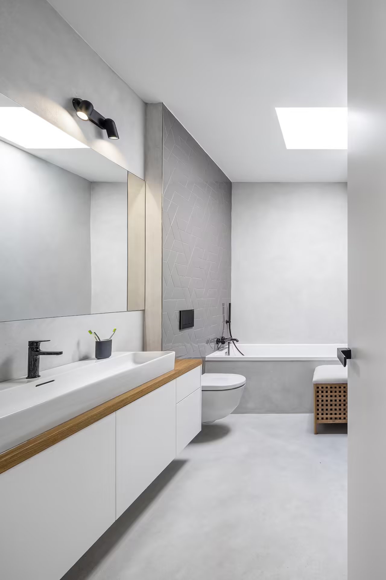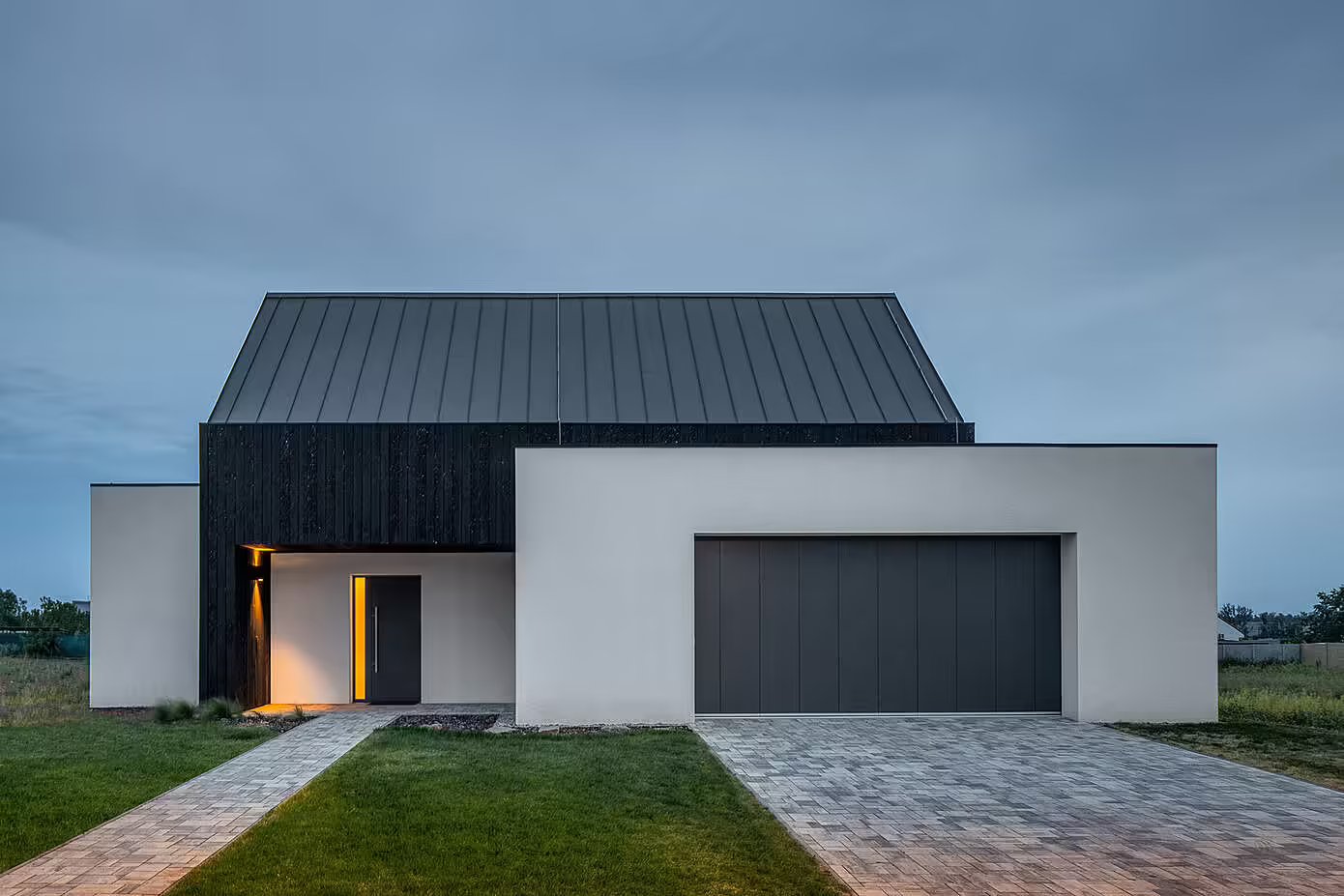 Dom wyróżnia się także doborem materiałów. Dwie wieże w formie nowoczesnej stodoły pokryto garbowanym drewnem oraz blachą na rąbek, co podkreśla ich współczesny, minimalistyczny charakter. Kontrastem dla tych struktur jest biała bryła z tynku, która łączy obie części w jedną, harmonijną całość. Ten projekt to doskonały przykład nowoczesnego podejścia do budownictwa jednorodzinnego – zrównoważonego, estetycznego i funkcjonalnego, jednocześnie wpisującego się w lokalny kontekst i tradycję.