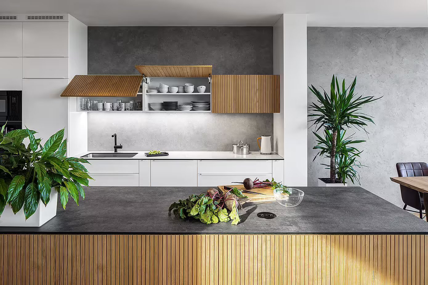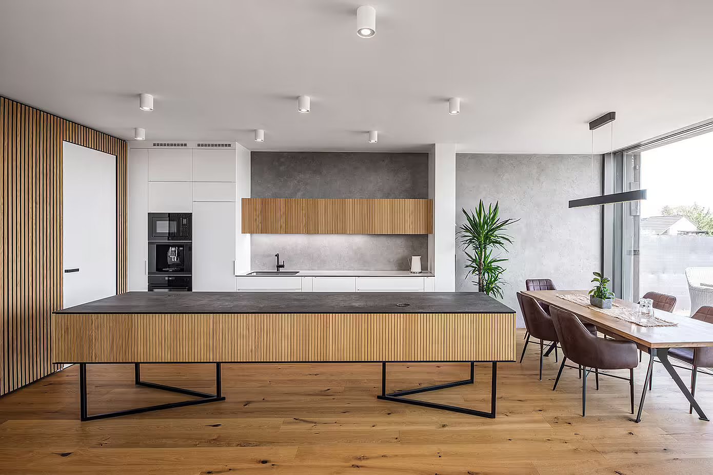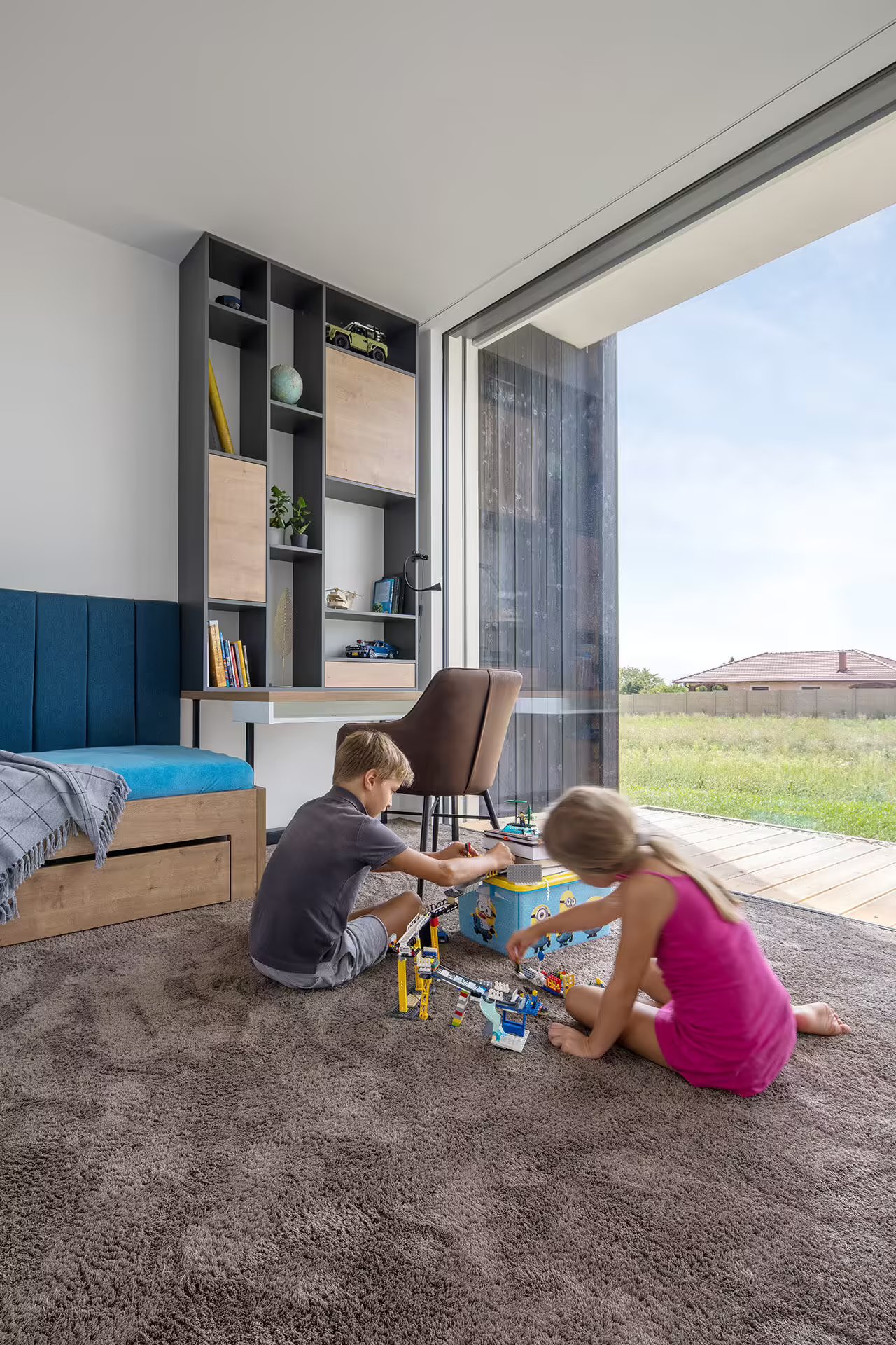 Wnętrze domu zostało zaprojektowane z wyraźną gradacją przestrzeni. Przez niewielki przedsionek przechodzimy do skrzyżowania ciągów komunikacyjnych – można tu dotrzeć do ogrodu przez atrium, do części dziennej lub do skrzydła z sypialniami. Na poziomie -1 znalazły się sala muzyczna i pokój zabaw, które otwierają się na przestrzeń zewnętrzną. Centralnym punktem części dziennej jest kuchnia z wyspą, która została zaprojektowana jako lekka konstrukcja „zawieszona” nad podłogą. Przestrzeń salonu otwiera się na dach i jest przeszklona poprzecznie, co tworzy dynamiczne połączenie z otoczeniem. Telewizor został ukryty, ponieważ przestrzeń ta służy przede wszystkim spotkaniom i wspólnemu spędzaniu czasu.
