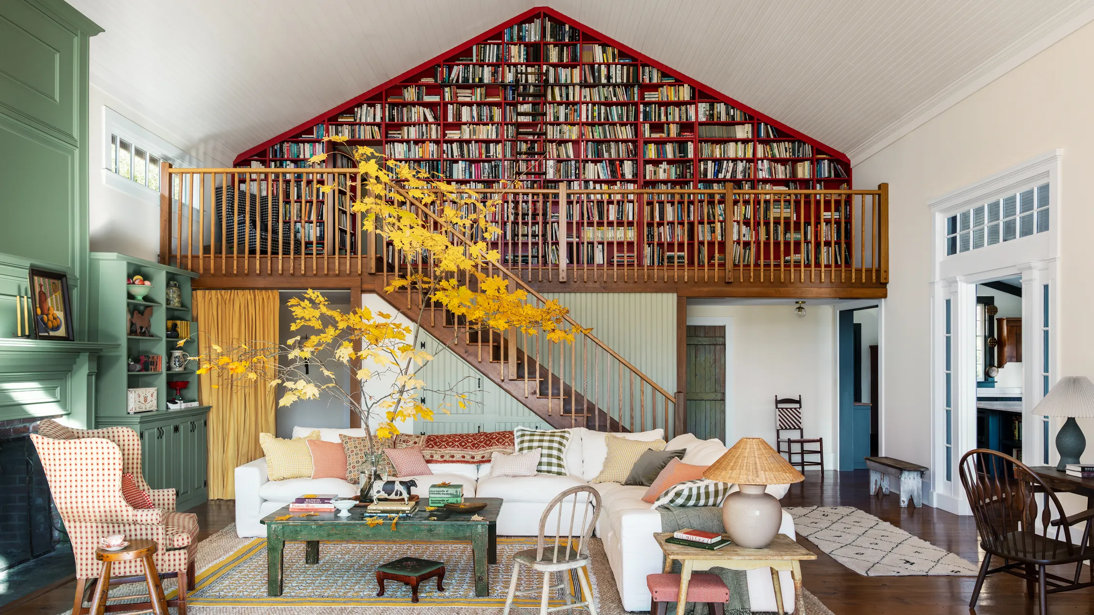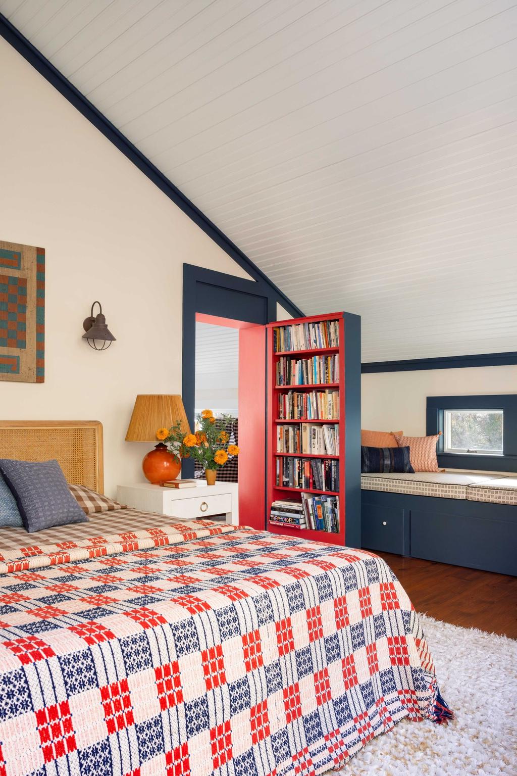 Szczególnym miejscem jest biblioteka z czerwonymi regałami w kształcie litery A. Zostały one wykonane przez poprzedniego właściciela domu – nauczyciela literatury – i kryją sekretne przejścia prowadzące do dwóch sypialni. Ten element nadaje wnętrzu nieco baśniowego charakteru i podkreśla jego nieformalny, rodzinny klimat.