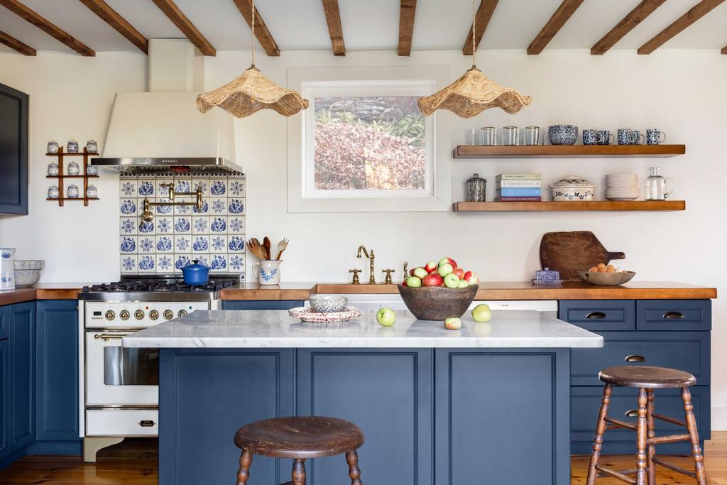 Kuchnia została całkowicie przebudowana, ale zaprojektowano ją tak, aby wyglądała, jakby była częścią domu od zawsze. Blaty z litego drewna, historyczne kolory farb Farrow & Ball, płytki Delft oraz lampy Matilda Goad tworzą wnętrze, które jest jednocześnie funkcjonalne i pełne charakteru.