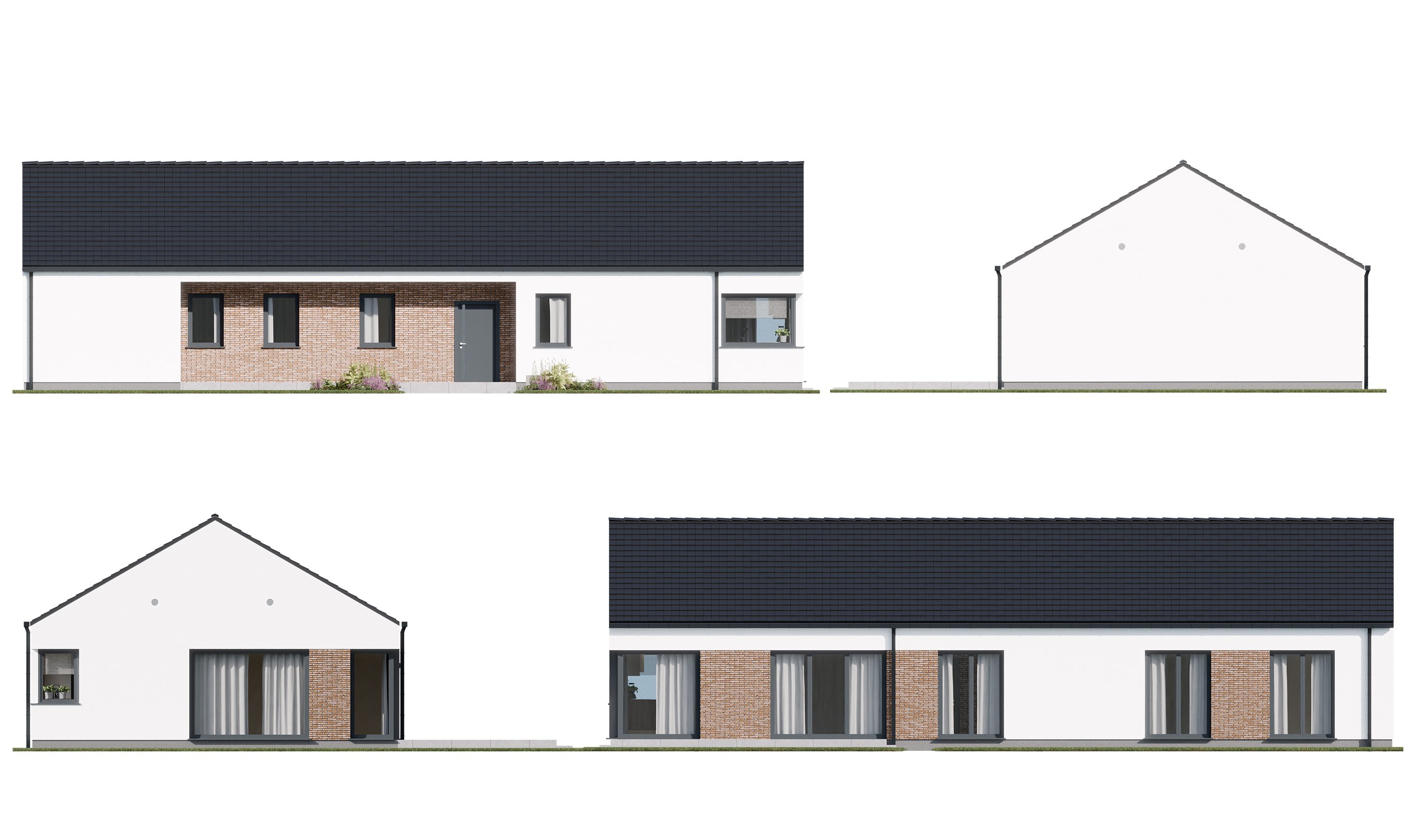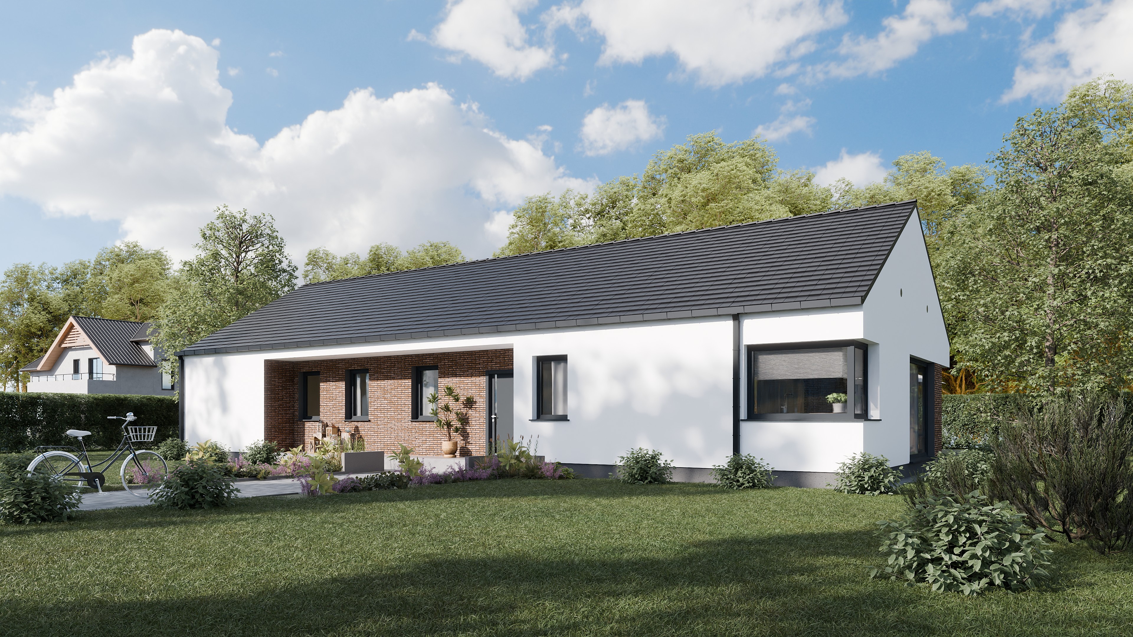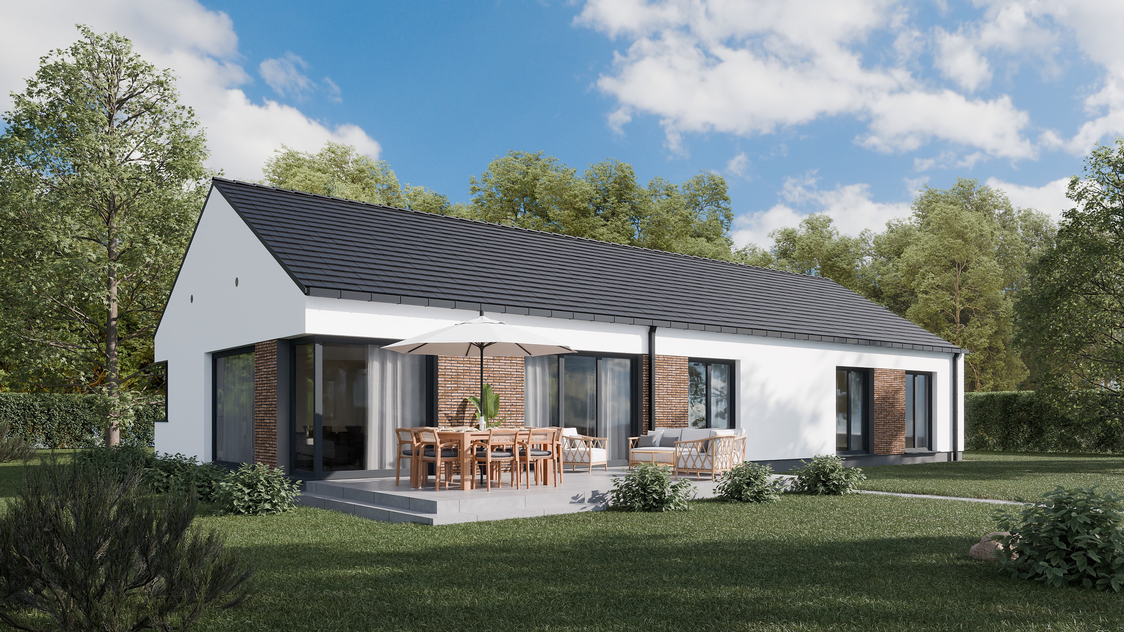 Bryła budynku została ograniczona do tego, co rzeczywiście potrzebne. Dwuspadowy dach i zwarta geometria tworzą formę, która jest jednocześnie osadzona w tradycji i wyraźnie współczesna. Brak dodatkowych załamań czy rozbudowanych detali pozwala zachować spójność i czytelność niezależnie od otoczenia.